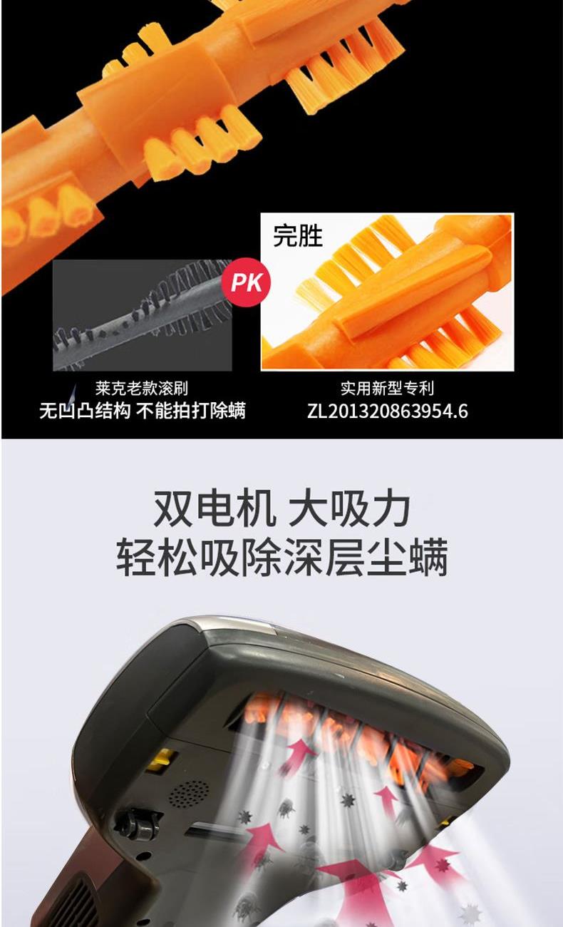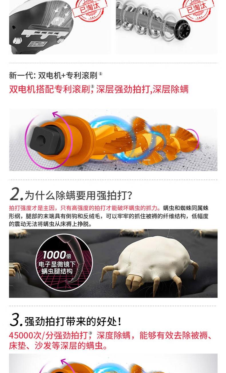 额定功率:500W 尘杯容积:0.3-0.4L 额定电压:220V 拍打方式:滚刷拍打 吸力:15kpa 电源线长:5m 产品尺寸:长337*宽267*高178mm 产品净重:2.15kg 包装清单:除螨机× 1 说明书× 1 保修卡× 1 合格证× 1 新升级复合滚刷,强拍打不伤被褥 吸毛不缠绕,宠物毛发轻松吸 英国抗过敏认证,除螨率99.9% 升级过滤,持久耐用不堵塞 热风除湿,保持床铺干爽