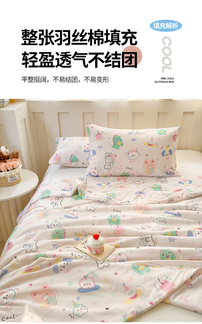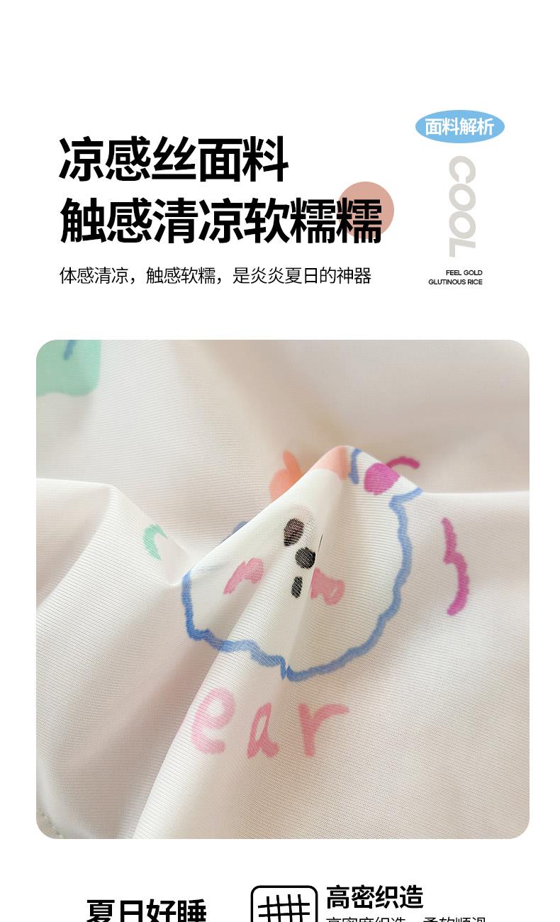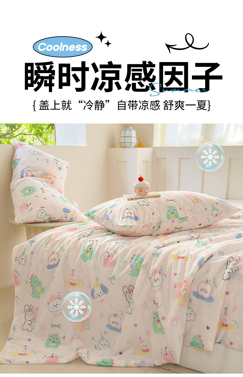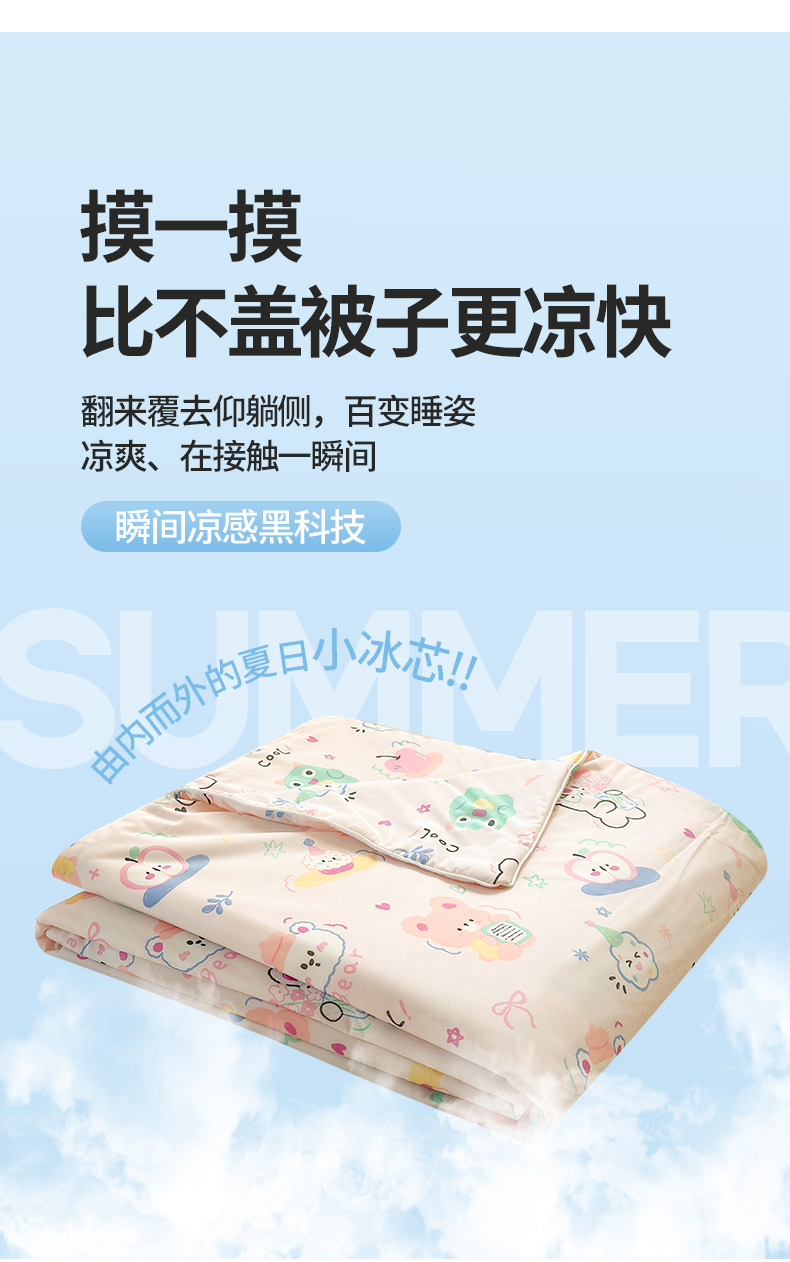 规格:150*200cm 花型:(冰凉夏叶、草莓味的风、花非花、粉色花烛、 可可狗熊、浅草铃兰、叶叶笙漫、玩趣砰砰、彩虹糖、花丛兔、希望之花) 面料:10%氨纶+90%聚酯纤维+90%聚酯纤维 填充物:整张羽丝棉 凉感黑科技,凉而不冰采用高支氨纶凉感丝面料,接触瞬间体感速降,自带 -℃冰感因子,夏日燥热一秒消散,凉感度恰到好处,不冰身不刺骨,老人小孩都能安心盖。冰淇淋印花,解锁夏日童趣软萌冰淇淋 + 卡通动物印花设计,马卡龙色系清新,瞬间点亮少女心,给卧室一秒换上 “夏日限定” 温柔模样。高弹氨纶丝,软糯亲肤感弹力十足的氨纶凉感丝,触感如冰淇淋般细腻柔滑,裹身感满分,透气不闷汗,夏天睡觉再也不黏腻。可机洗不变形,懒人福音整张填充工艺,耐洗耐造,随意机洗不结团、不起球、不掉色,洗完依旧蓬松凉滑,省去晾晒麻烦,夏天省心盖被。