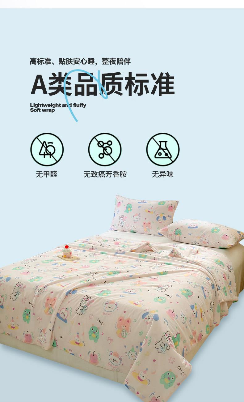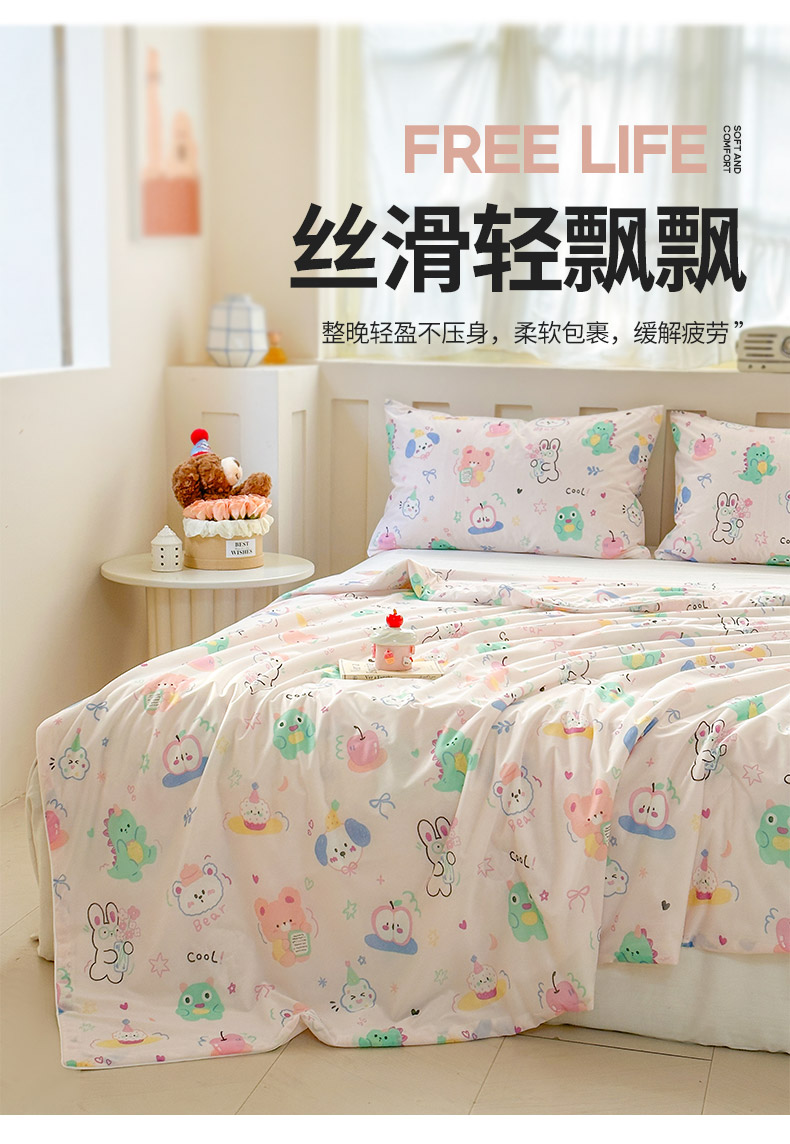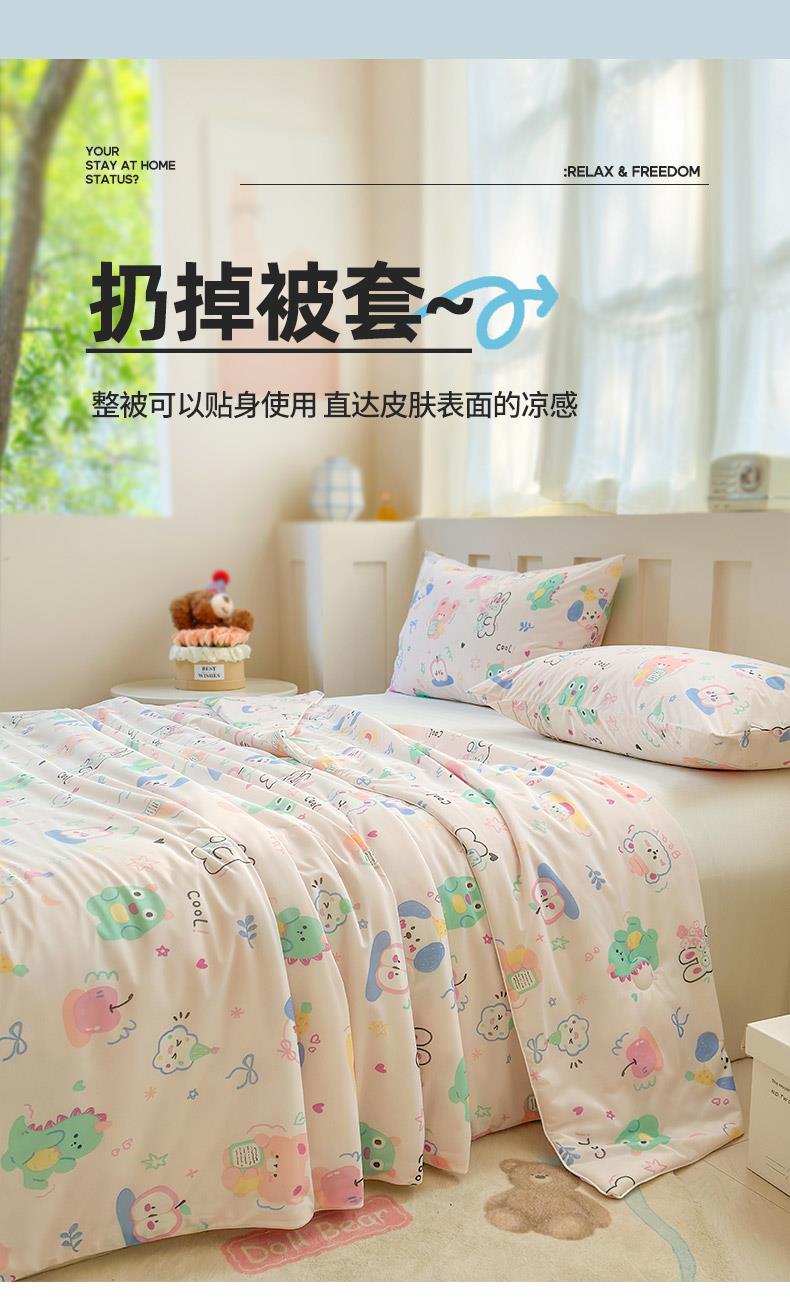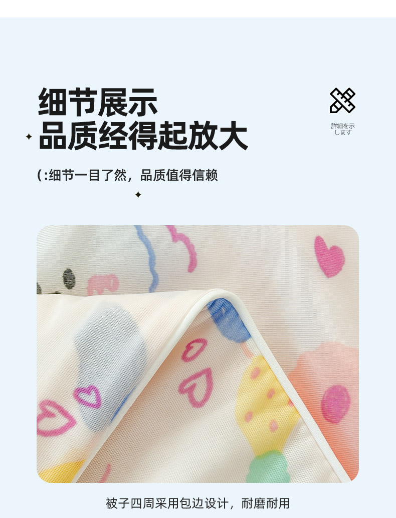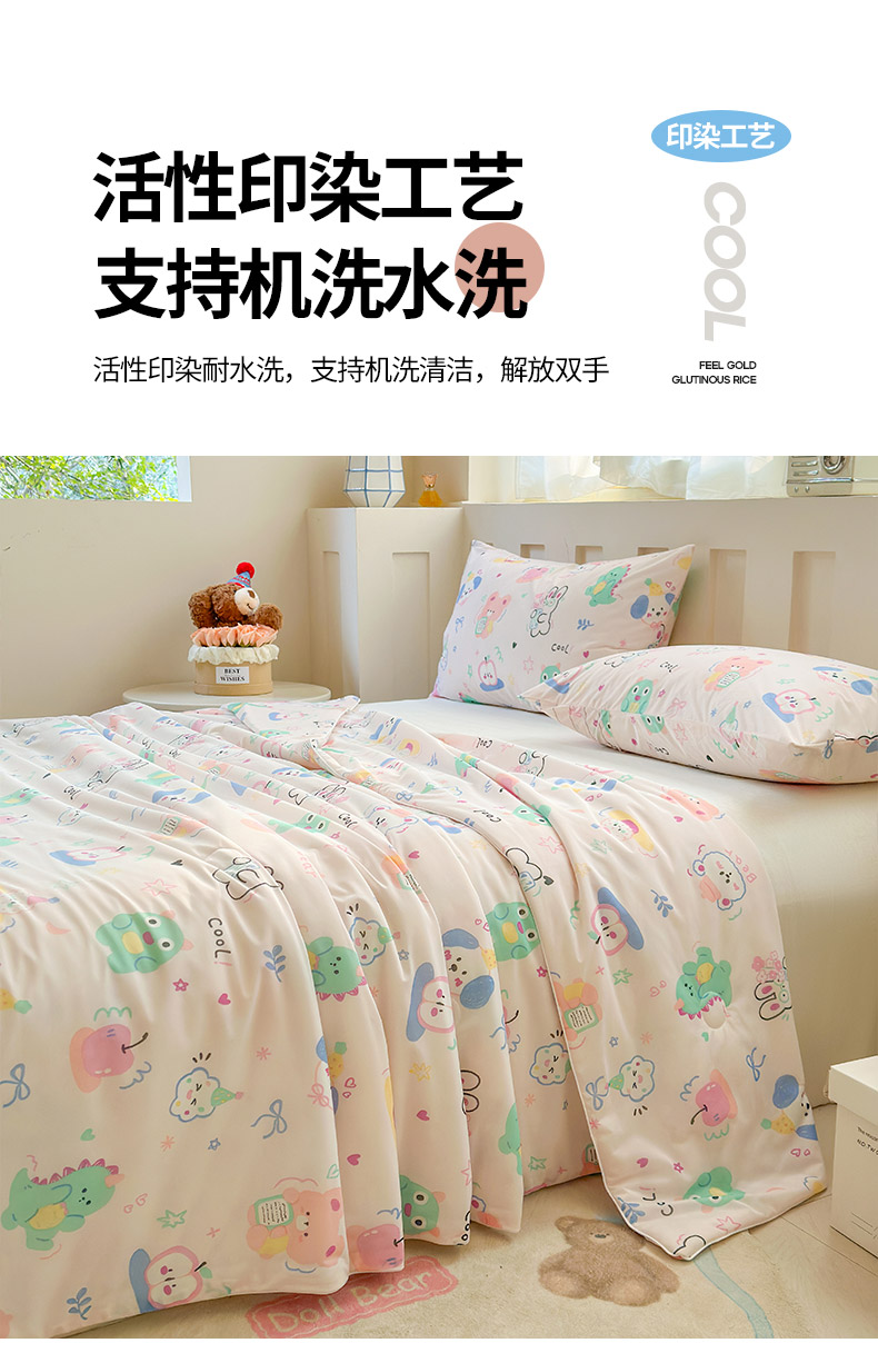 规格:150*200cm 花型:(冰凉夏叶、草莓味的风、花非花、粉色花烛、 可可狗熊、浅草铃兰、叶叶笙漫、玩趣砰砰、彩虹糖、花丛兔、希望之花) 面料:10%氨纶+90%聚酯纤维+90%聚酯纤维 填充物:整张羽丝棉 凉感黑科技,凉而不冰采用高支氨纶凉感丝面料,接触瞬间体感速降,自带 -℃冰感因子,夏日燥热一秒消散,凉感度恰到好处,不冰身不刺骨,老人小孩都能安心盖。冰淇淋印花,解锁夏日童趣软萌冰淇淋 + 卡通动物印花设计,马卡龙色系清新,瞬间点亮少女心,给卧室一秒换上 “夏日限定” 温柔模样。高弹氨纶丝,软糯亲肤感弹力十足的氨纶凉感丝,触感如冰淇淋般细腻柔滑,裹身感满分,透气不闷汗,夏天睡觉再也不黏腻。可机洗不变形,懒人福音整张填充工艺,耐洗耐造,随意机洗不结团、不起球、不掉色,洗完依旧蓬松凉滑,省去晾晒麻烦,夏天省心盖被。