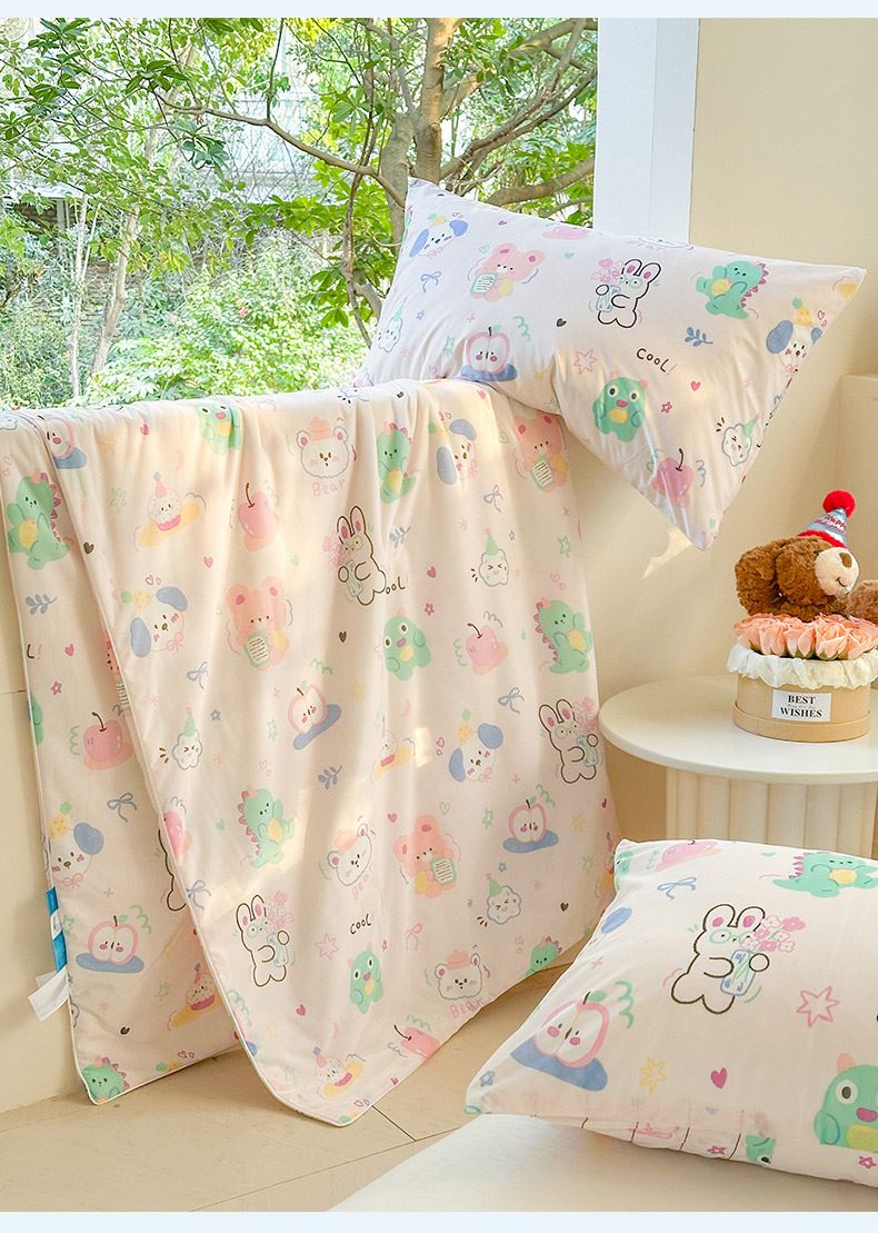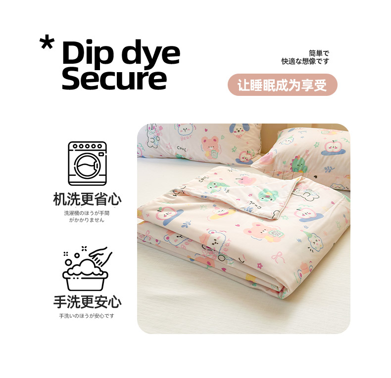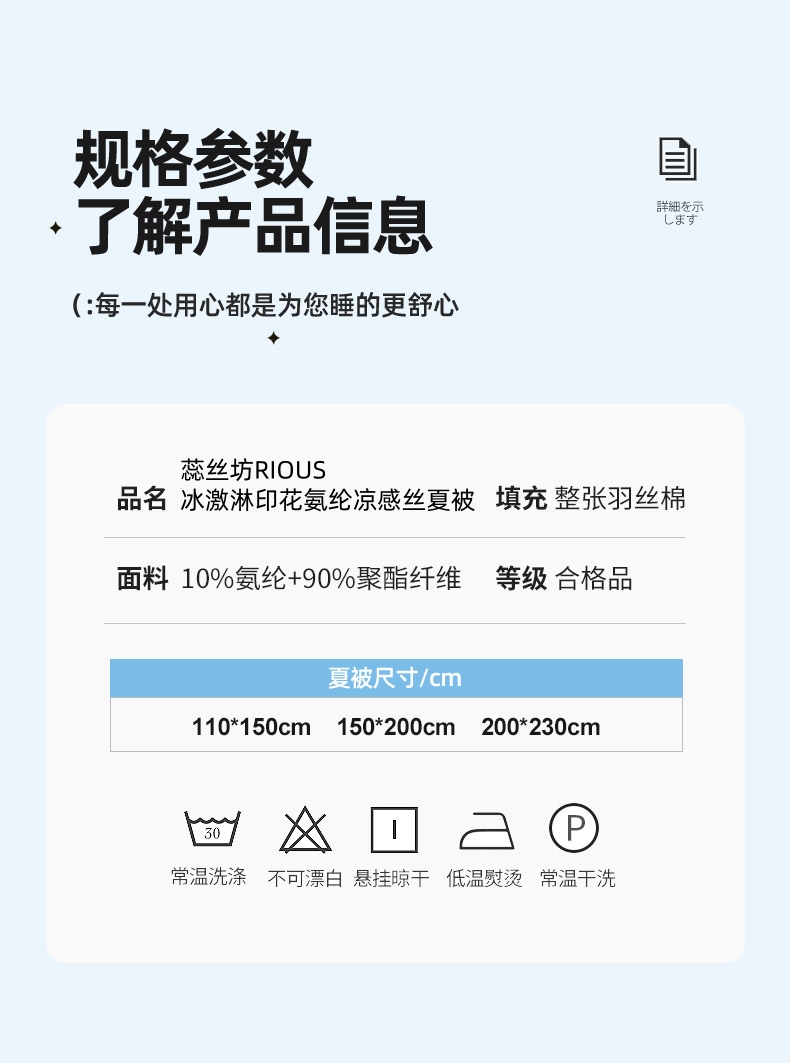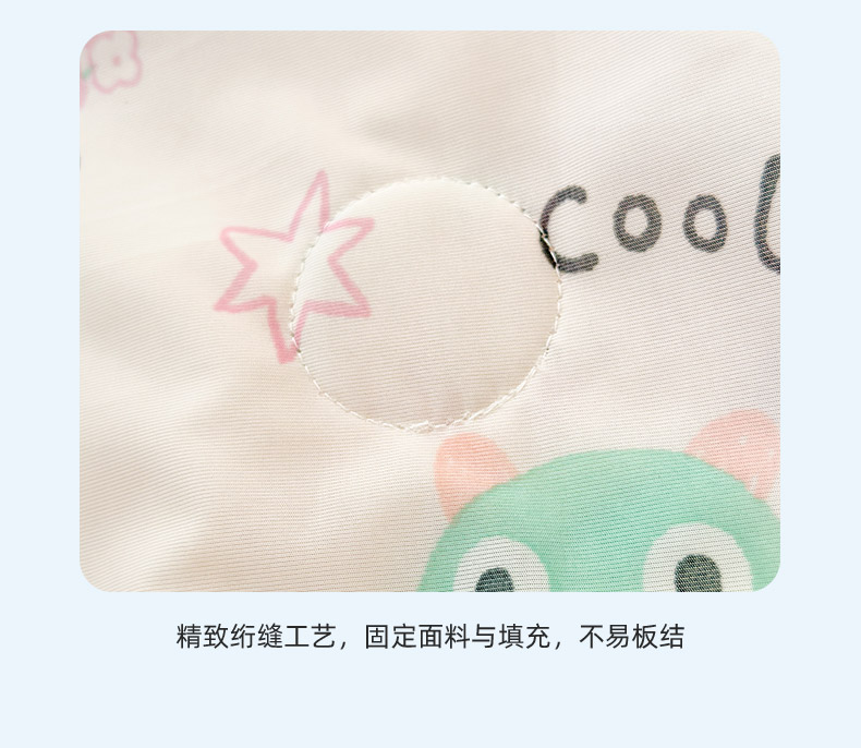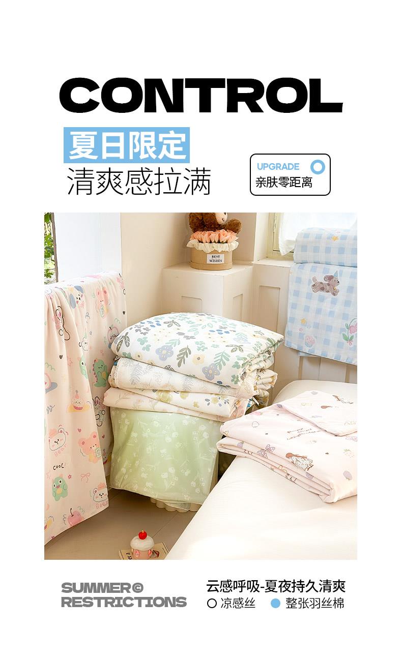 规格:150*200cm 花型:(冰凉夏叶、草莓味的风、花非花、粉色花烛、 可可狗熊、浅草铃兰、叶叶笙漫、玩趣砰砰、彩虹糖、花丛兔、希望之花) 面料:10%氨纶+90%聚酯纤维+90%聚酯纤维 填充物:整张羽丝棉 凉感黑科技,凉而不冰采用高支氨纶凉感丝面料,接触瞬间体感速降,自带 -℃冰感因子,夏日燥热一秒消散,凉感度恰到好处,不冰身不刺骨,老人小孩都能安心盖。冰淇淋印花,解锁夏日童趣软萌冰淇淋 + 卡通动物印花设计,马卡龙色系清新,瞬间点亮少女心,给卧室一秒换上 “夏日限定” 温柔模样。高弹氨纶丝,软糯亲肤感弹力十足的氨纶凉感丝,触感如冰淇淋般细腻柔滑,裹身感满分,透气不闷汗,夏天睡觉再也不黏腻。可机洗不变形,懒人福音整张填充工艺,耐洗耐造,随意机洗不结团、不起球、不掉色,洗完依旧蓬松凉滑,省去晾晒麻烦,夏天省心盖被。