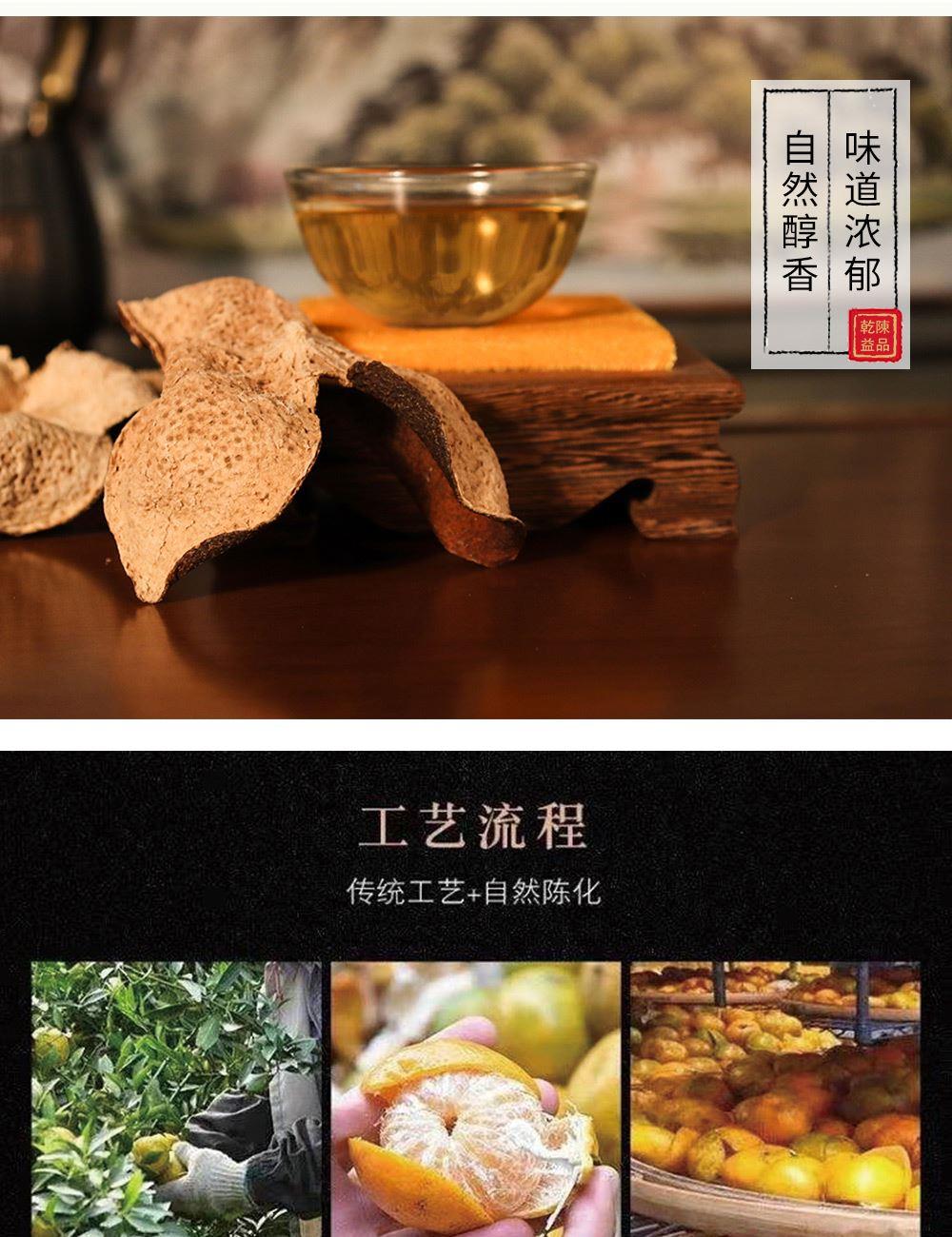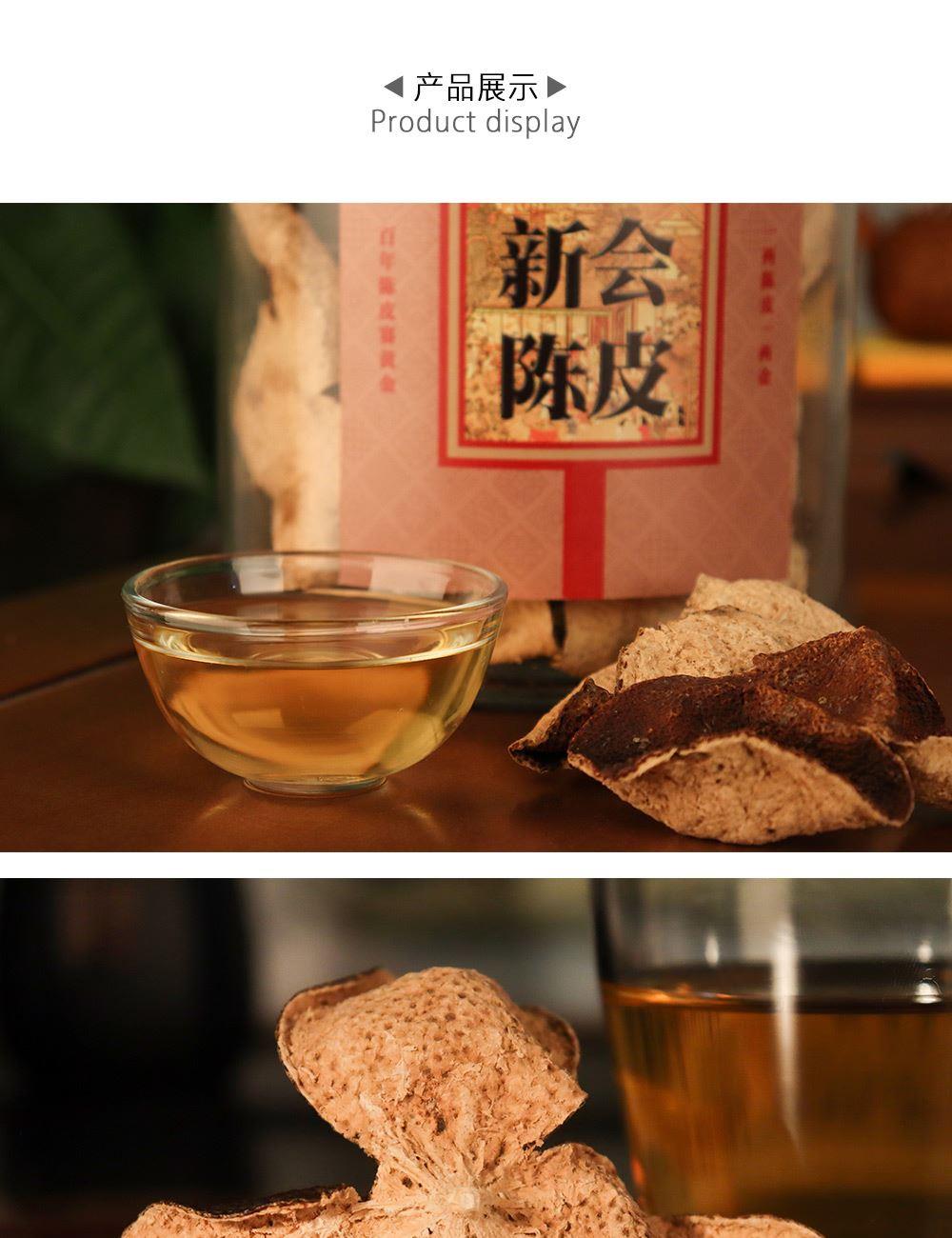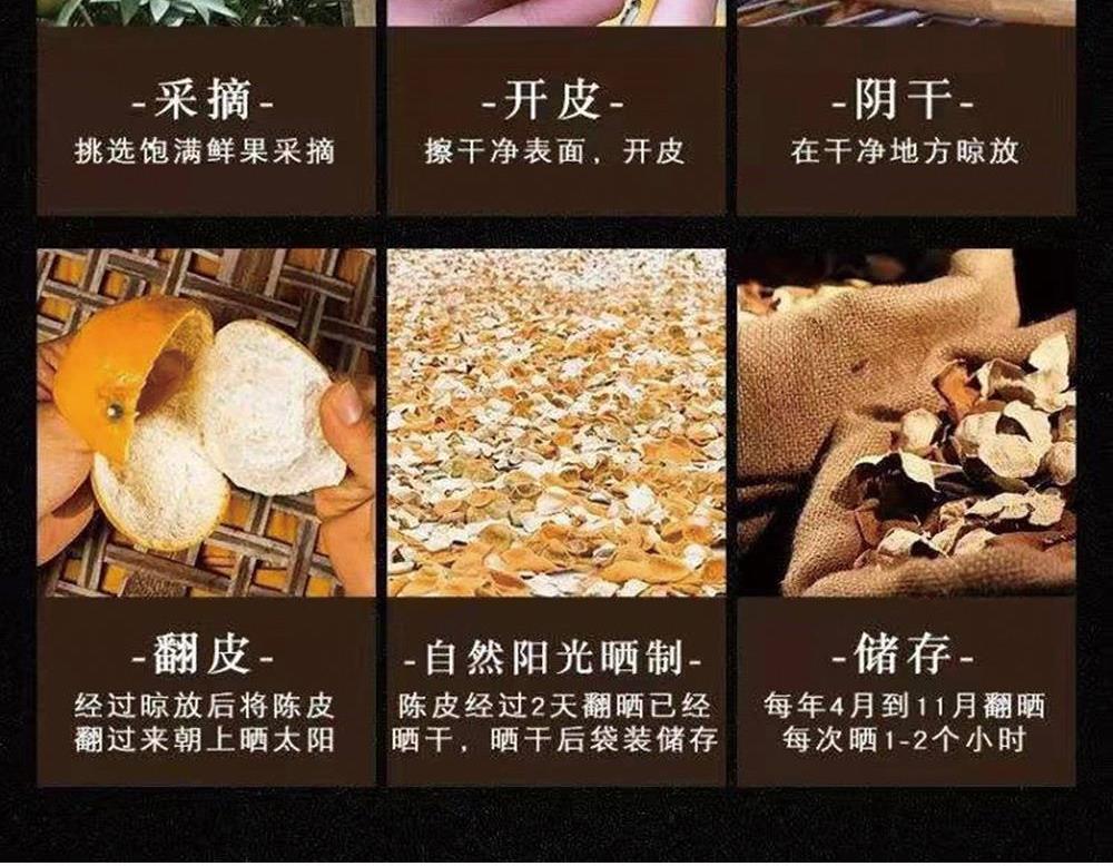 净含量:150g 毛重:1.85kg 产区:广东新会天马核心产区 原料:新会干仓陈皮 规格:单瓶 1.选用广东新会天马产区陈皮10年陈化原料 2.从采收,洗选,开皮,翻皮到晒皮贮存与陈化等每一个环节都坚持人手工制作,精心挑选。 3.新会陈皮味辛性温,甘香醇陈,油包粒大,油室饱满,芳香浓郁,具有唤醒味蕾,改善食欲不振,消滞健胃。 4.新会陈皮不仅能单独泡茶,还可以用来与其他茶叶搭配冲泡,白茶,红茶,普洱等。