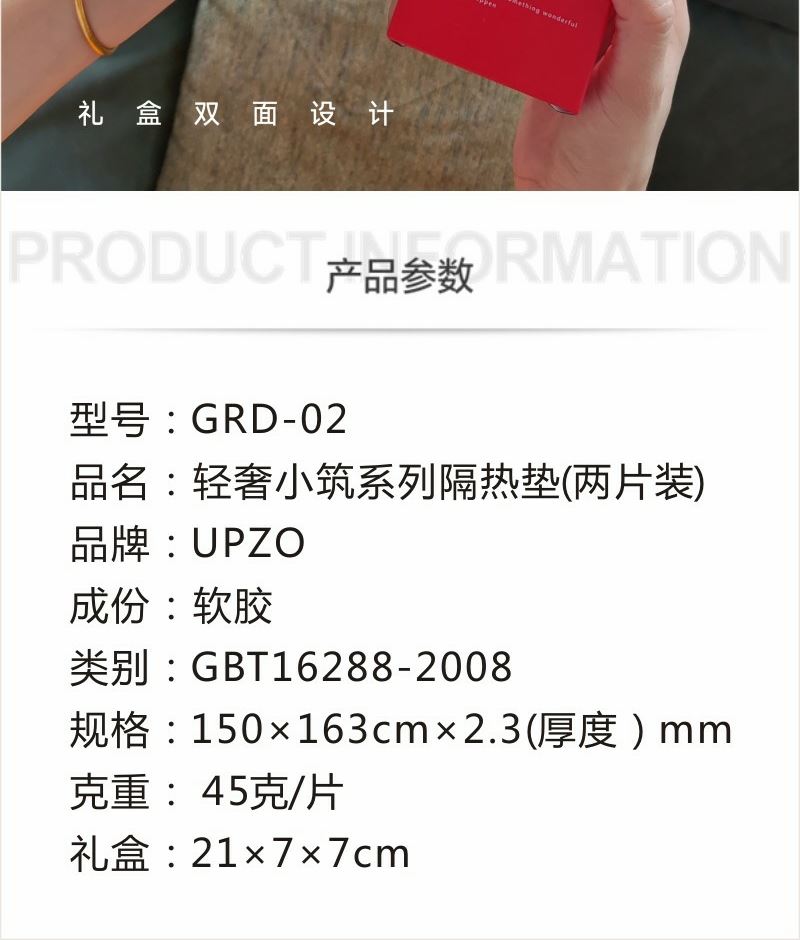 型号: GRD-02 (备 注:2片每盒) 成份: 软胶 标准: GBT16288-2008 产品规格: 15*16*0.3CM 产品克重: 50 克 / 片 礼盒:21*7*7CM 高颜值 高品质 两片每盒