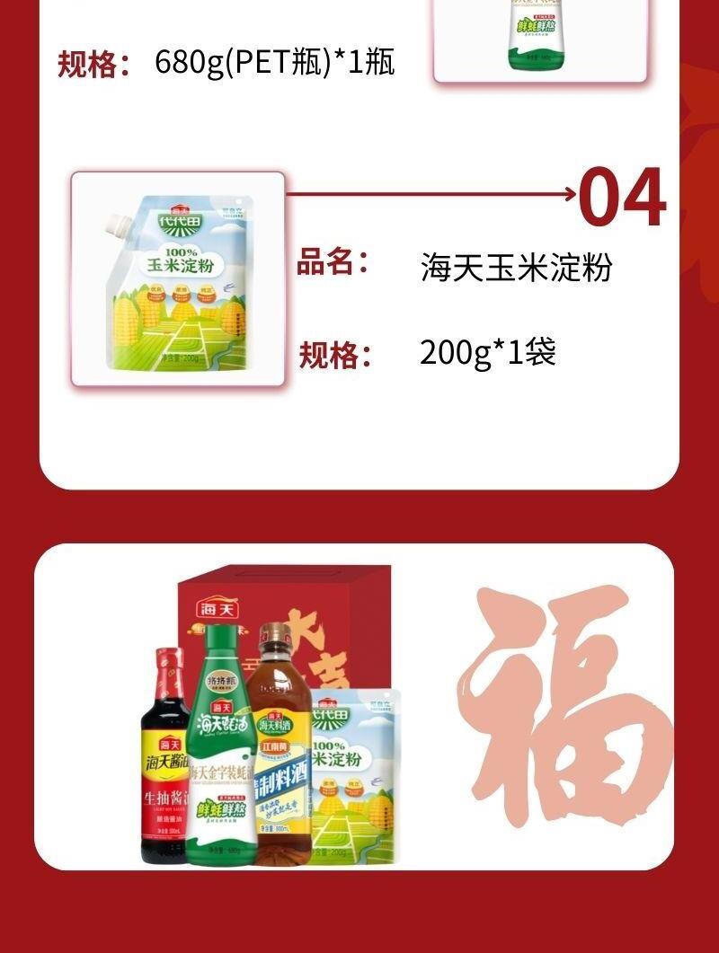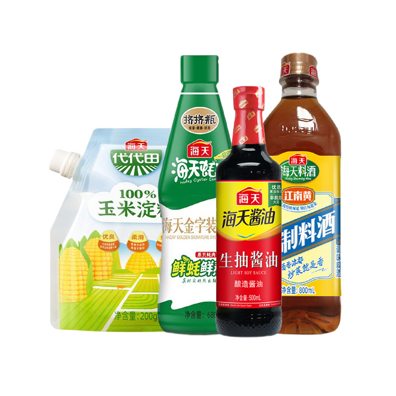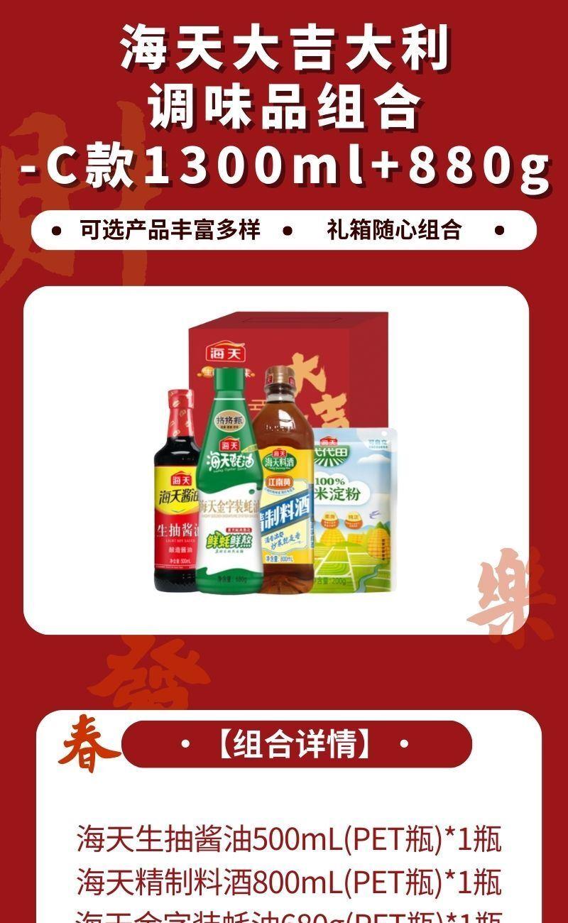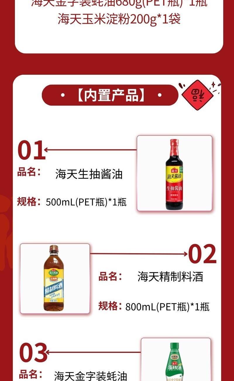 配置: 海天生抽酱油500mL(PET瓶)*1瓶 海天精制料酒800mL(PET瓶)*1瓶 海天金字装蚝油680g(PET瓶)*1瓶 海天玉米淀粉200g*1袋 卖点: 可选产品丰富多样,礼箱随心组合,多种价位因需而定,充分满足各种送礼需求,是商务送礼、单位福利的用心之选。