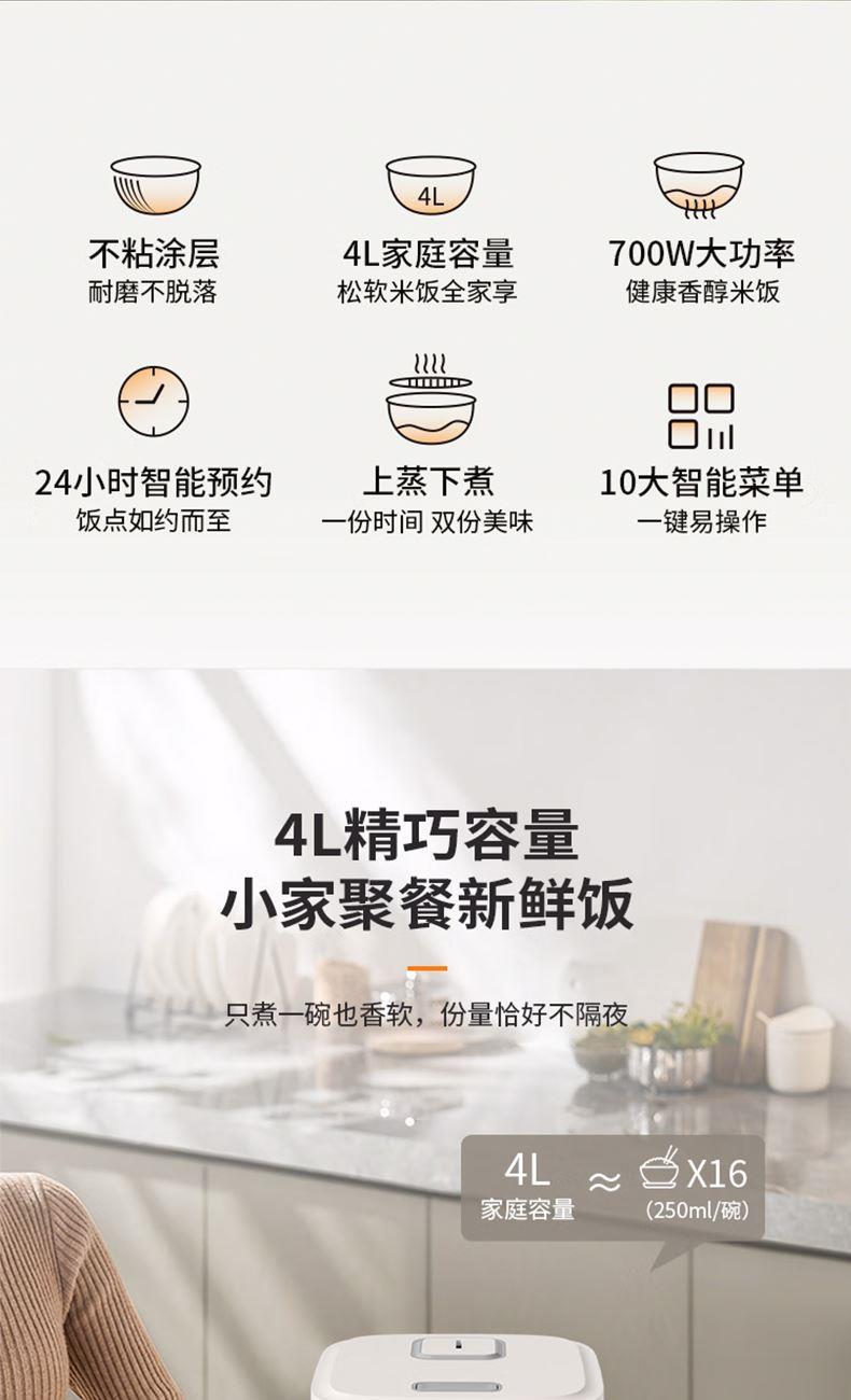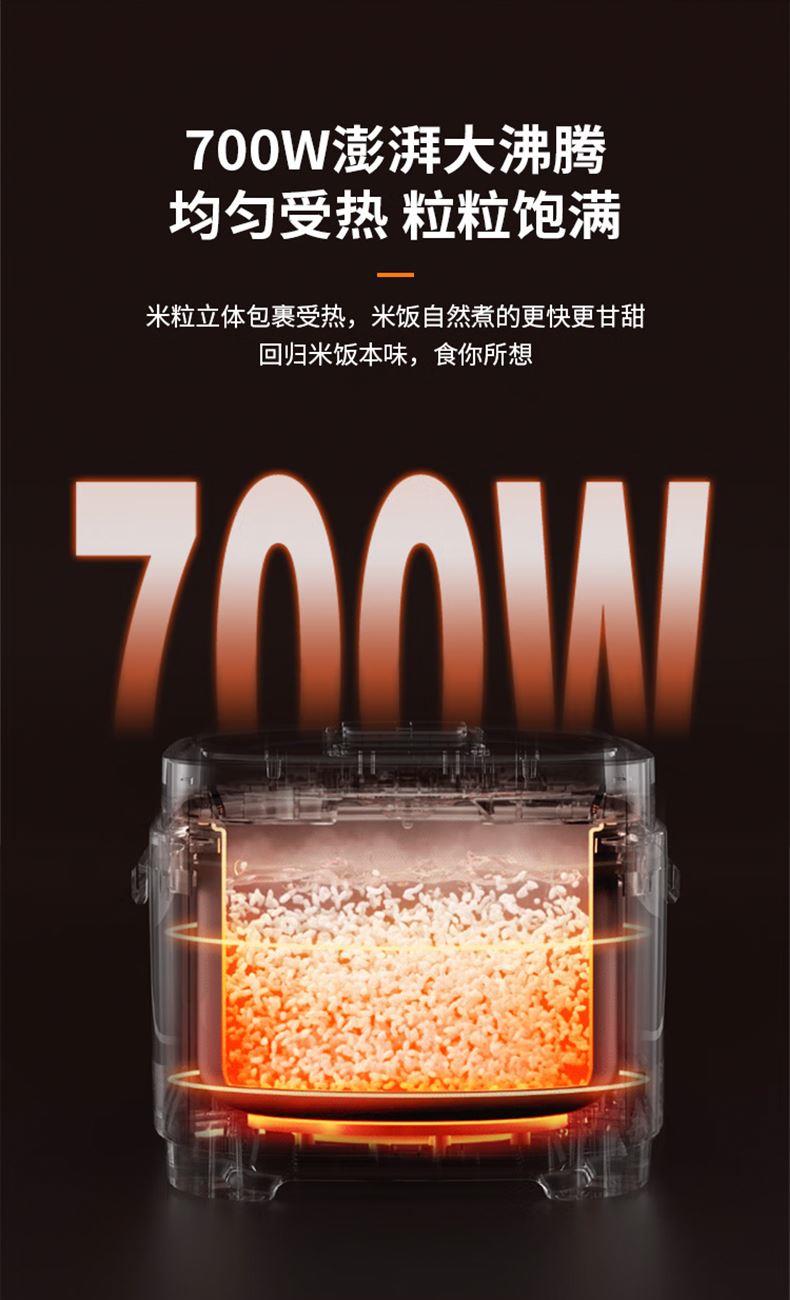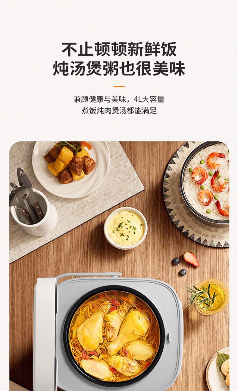 1.黄金容量:4L豪华容量,从容宴客,招待家人、朋友也无压力。 2.700W大功率:大功率猛火沸腾,火力迅速包裹米粒,熟透饱满,口口饱满。 3. 智能触屏:大屏触控,清晰灵敏触控,功能一键直达。 4.10大菜单功能:蒸炖卤煮样样精通,厨房小白秒变大厨。