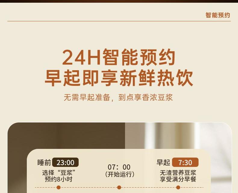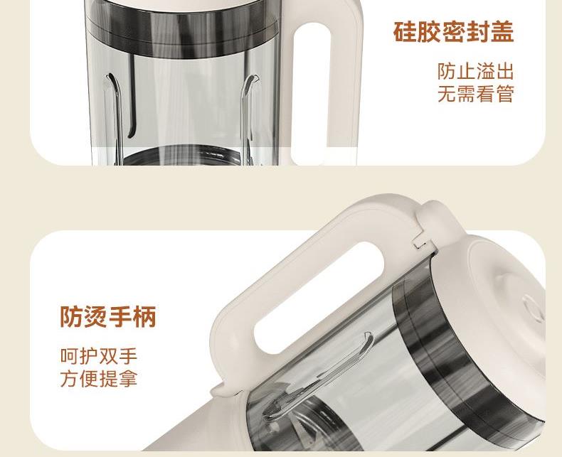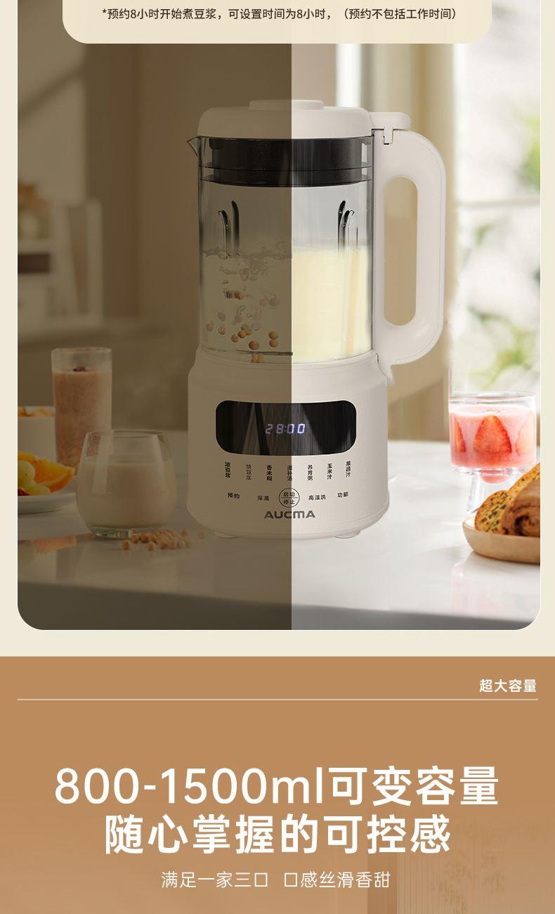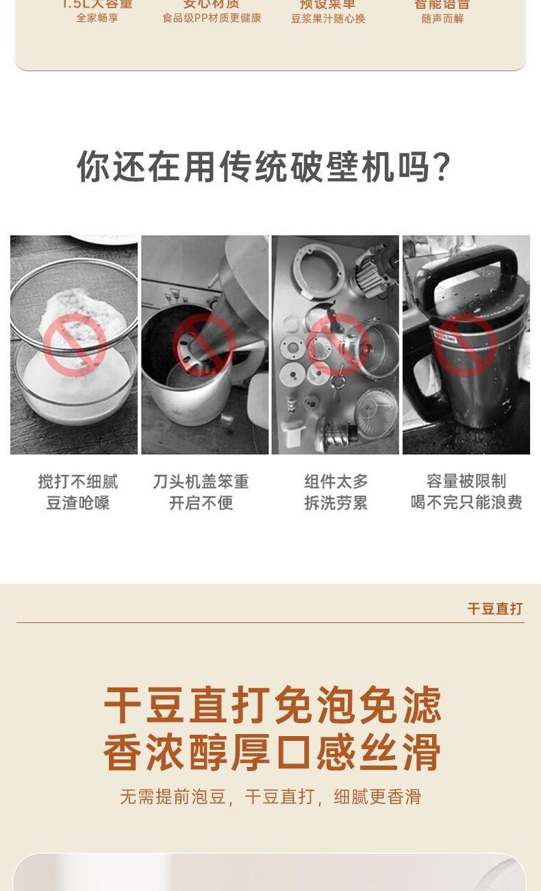 电动功率:300W 加热功率:800W 毛 重:2.2kg 净 重:1.8kg 容 量:1.5L 刀组件:16叶精钢刀组,细腻无渣。 预约功能:24H小时超长智能预约 面板功能 :7大预设智能菜谱,营养美味不重样。 豆浆:干豆直打,免泡免滤,便捷香浓无渣。 电机:7020电机,23000转/分,动力强劲。 材质:3.5mm加厚杯体,防糊底发热盘,食品级PP材质。 清洗方便:一键清洗,快速便捷。 多重安全保护:开盖保护,避免机器误操作,安全放心使用。
