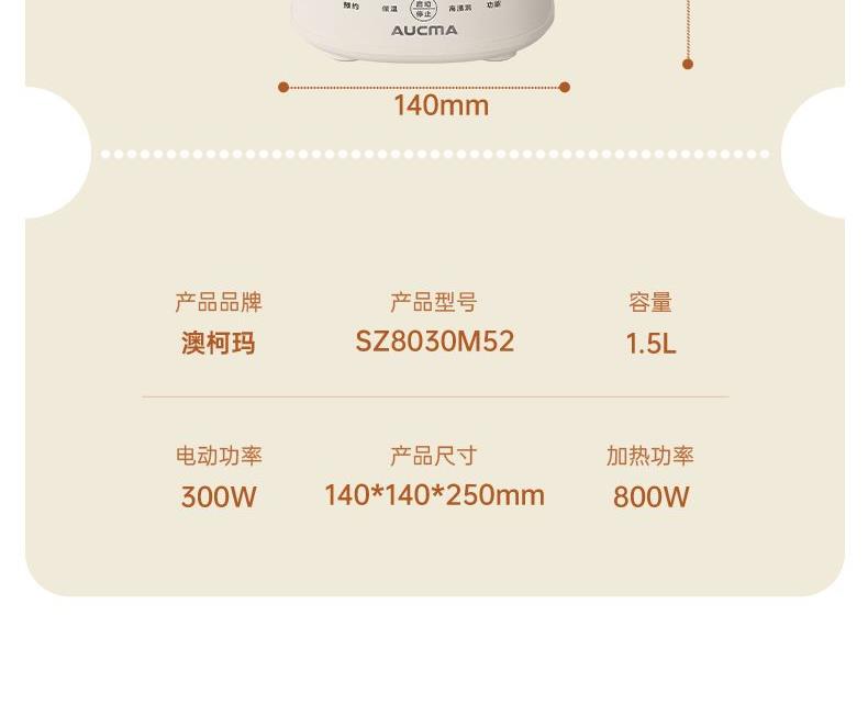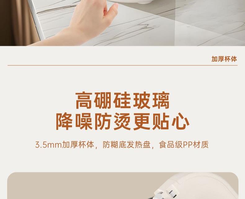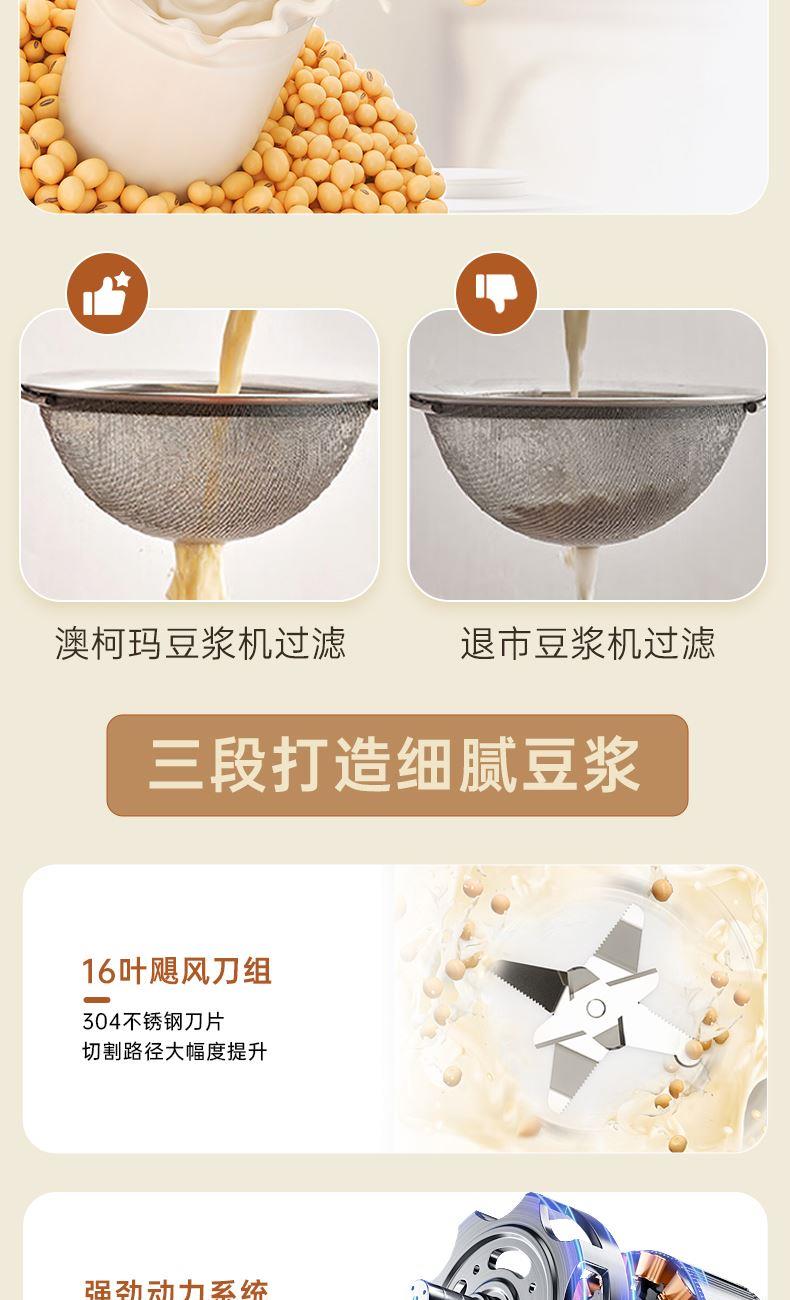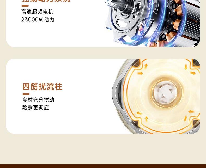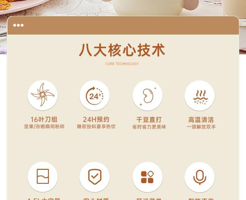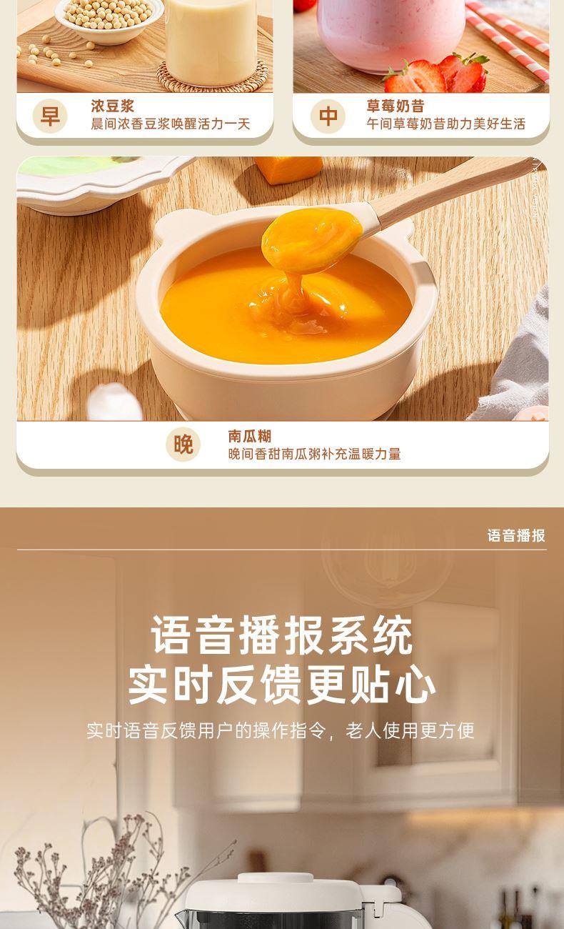 电动功率:300W 加热功率:800W 毛 重:2.2kg 净 重:1.8kg 容 量:1.5L 刀组件:16叶精钢刀组,细腻无渣。 预约功能:24H小时超长智能预约 面板功能 :7大预设智能菜谱,营养美味不重样。 豆浆:干豆直打,免泡免滤,便捷香浓无渣。 电机:7020电机,23000转/分,动力强劲。 材质:3.5mm加厚杯体,防糊底发热盘,食品级PP材质。 清洗方便:一键清洗,快速便捷。 多重安全保护:开盖保护,避免机器误操作,安全放心使用。