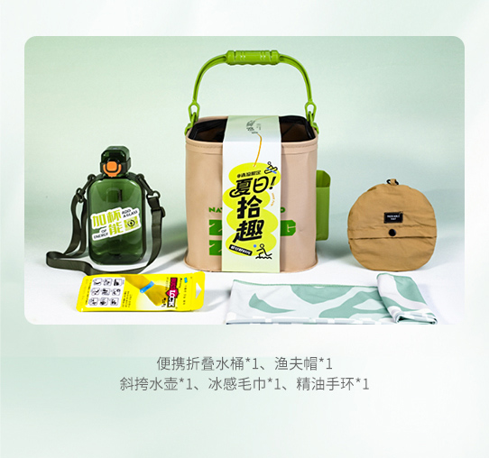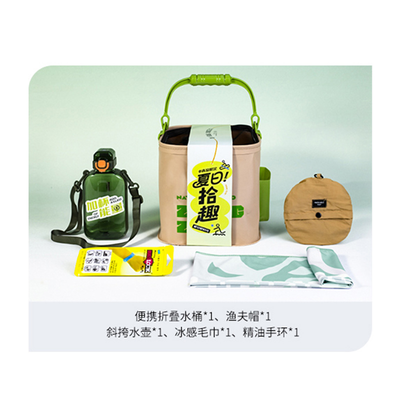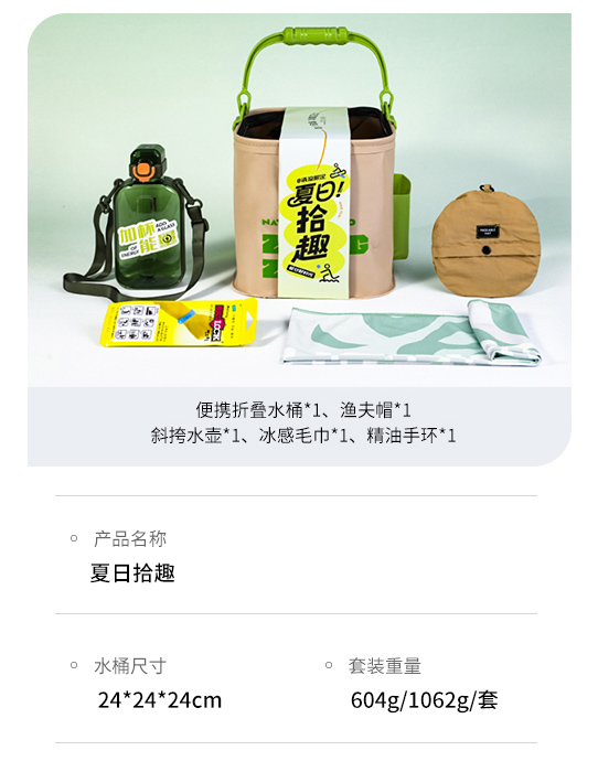 礼盒参数: 水桶尺寸:24cm*24cm*24cm 套装重量:604g/套 详细介绍: 1.可收纳渔夫帽 防晒、速干(随机颜色) 2.植物精油手环 数量:1个 颜色随机 功能:防蚊虫 3.斜挎水壶 材质:优质PC/PP,硅胶 尺寸:17.8*3.3*10.8cm 4.冰感毛巾 快速吸汗/速干便携/亲肤不掉毛 材质:超细纤维 尺寸:30*100cm 注:图案随机