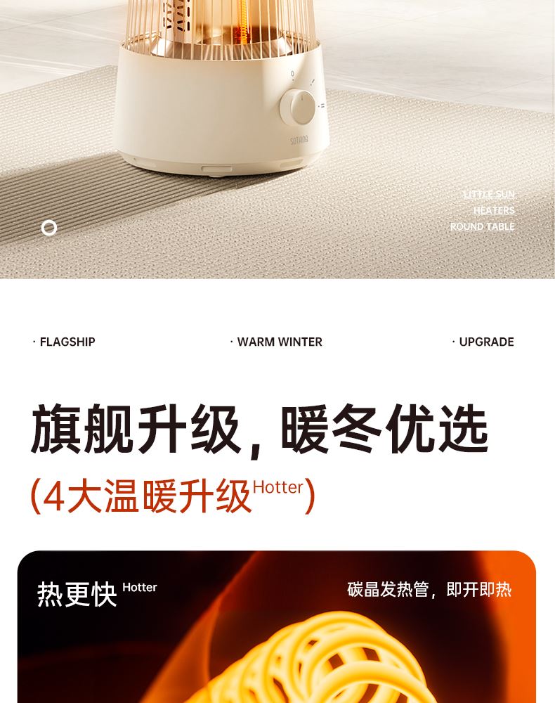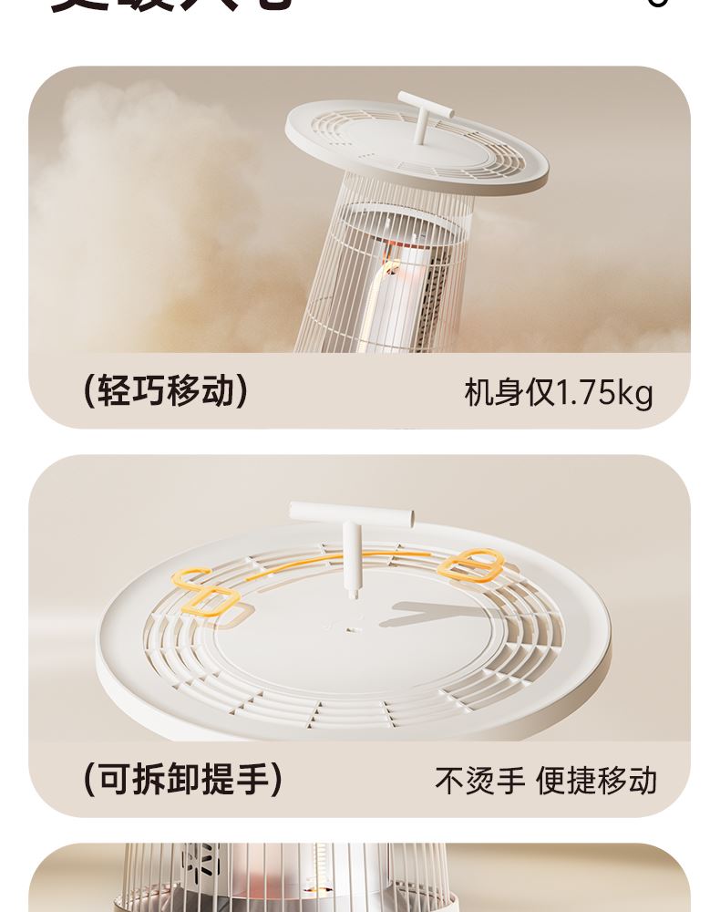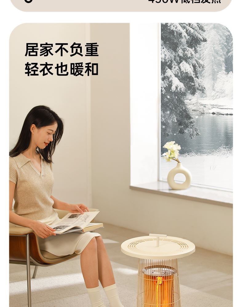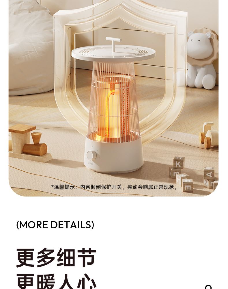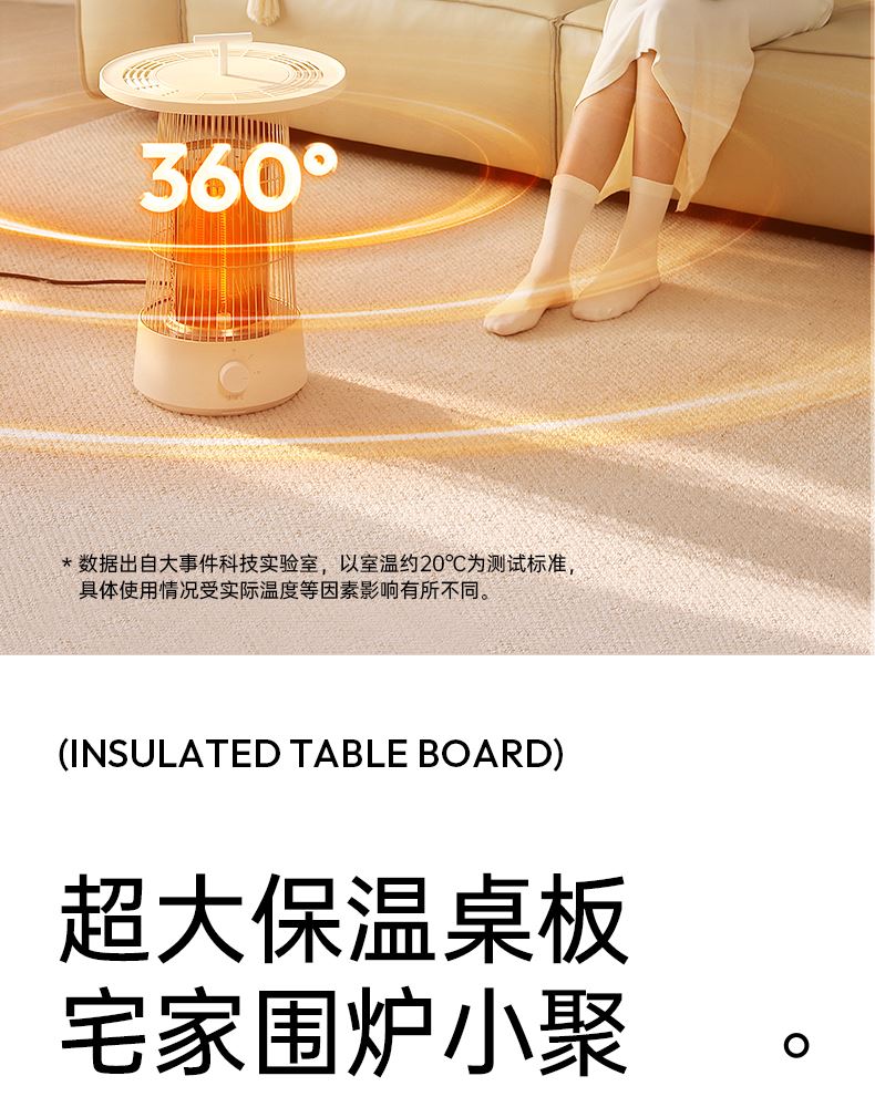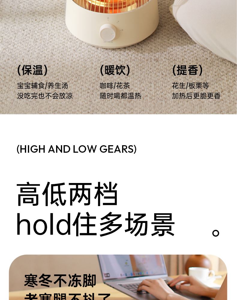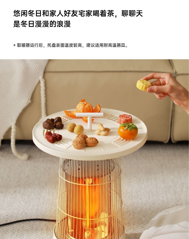 HDPE碳素管发热,即开即热,热流瞬间包裹皮肤,寒冬取暖不久等 升级大桌板,加大受热网面面积,冬日围炉煮茶更惬意, 600w/300w,2档调节,简易方便操作,暗光无声,酣睡不刺眼 倾倒断电,使用更安心,可拆卸便携提手,随处移动自由切换取暖场景 mini造型更可爱,席地而坐环抱取暖更舒适