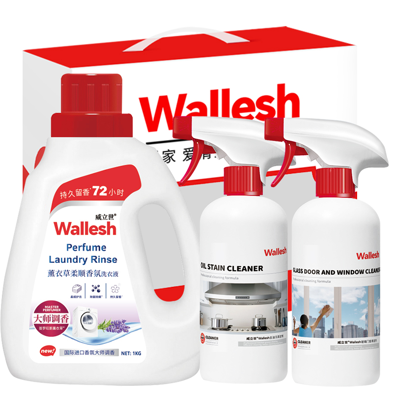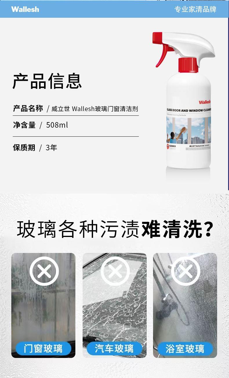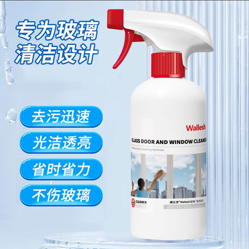 威立世Wallesh去油污清洁剂 规格:508ml 产品特点:强效去油污,软化瓦解油烟机、煤气灶、壁面等处的粘腻油垢、油渍和油层,保持厨房环境清洁 威立世Wallesh玻璃门窗清洁剂规格:508ml 产品特点:可有效清洁玻璃门窗,保持玻璃干净闪亮。迅速瓦解玻璃水洗表面污垢,不留水痕,更能有效防尘 威立世Wallesh玻璃门窗清洁剂规格:508ml 产品特点:可有效清洁玻璃门窗,保持玻璃干净闪亮。迅速瓦解玻璃水洗表面污垢,不留水痕,更能有效防尘