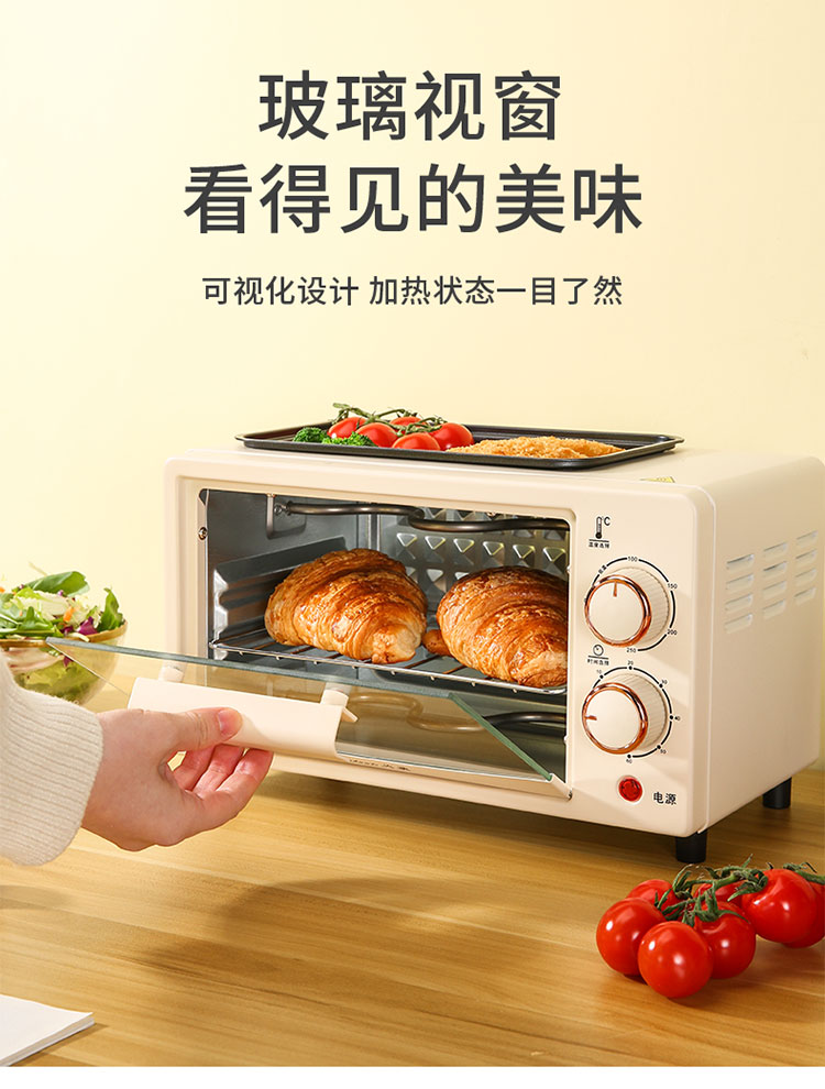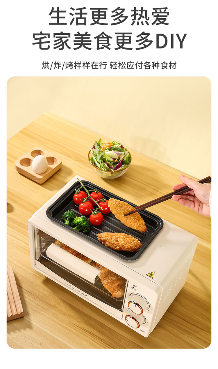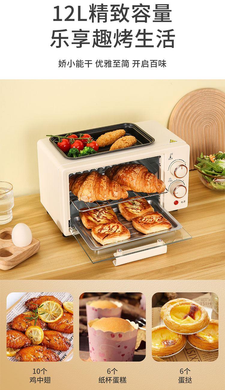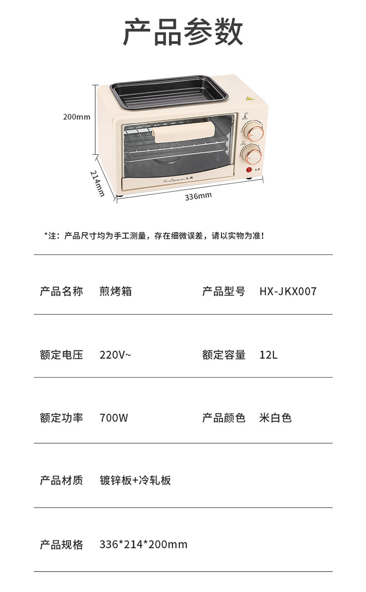 额定功率:700W 额定电压:220V 额定频率:50Hz 额定容量:12L 净重毛重:1.8kg/2.3kg 产品材质:镀锌板+冷轧板 产品颜色:米白色 产品规格:336*214*200mm 彩盒尺寸:363*258*238mm 外箱尺寸:795*378*494mm 采用机械双旋钮控温控时,操作简单,广域控温控时,满足不同食材的烤制需求。 采用高效的上下同时加热方式,加热性能稳定,加热速度快,煎烤效果更好。 顶部分离式烤盘设计,可煎烤同时进行,多种美味同时享受,还易清洗。