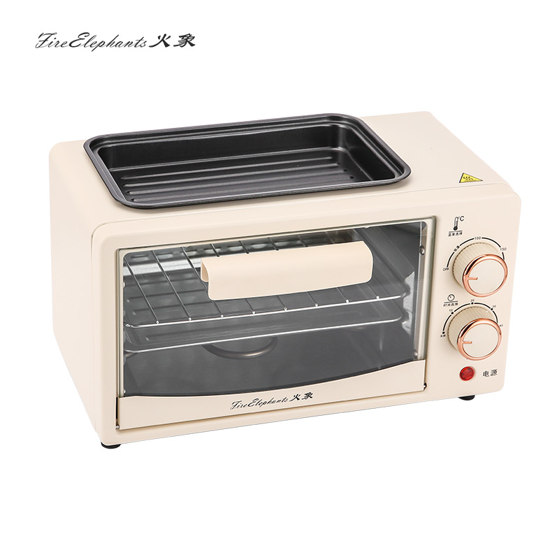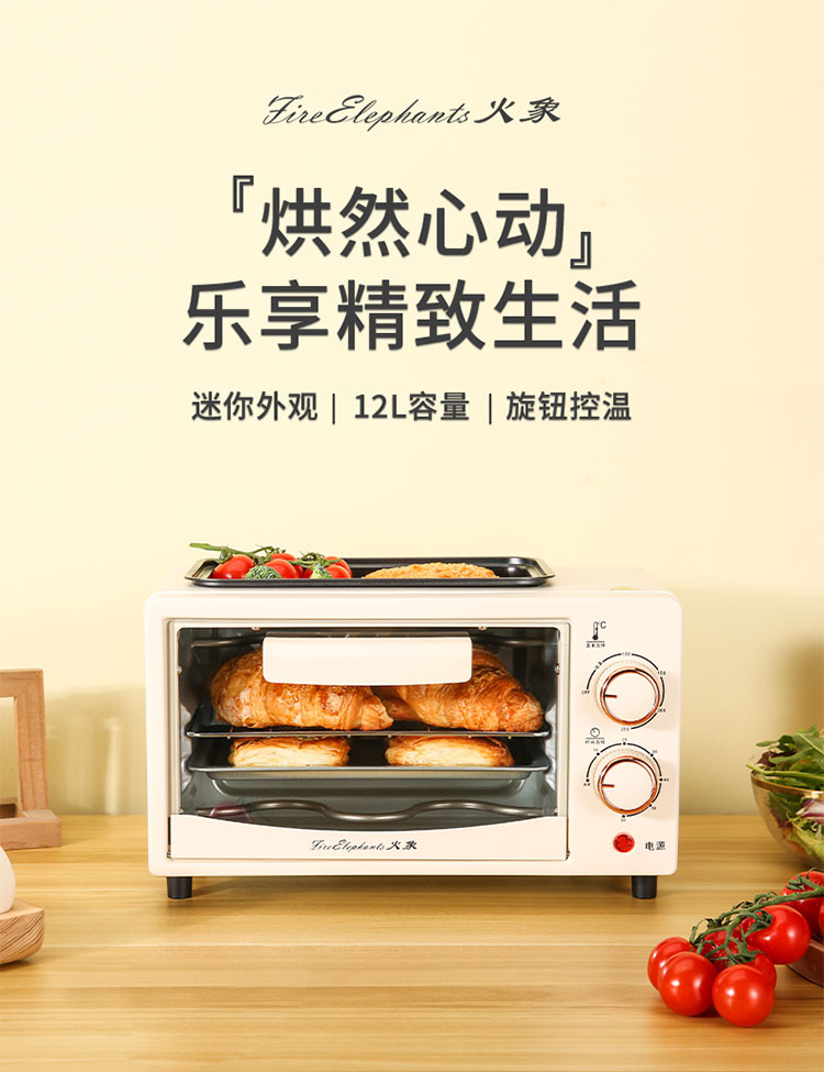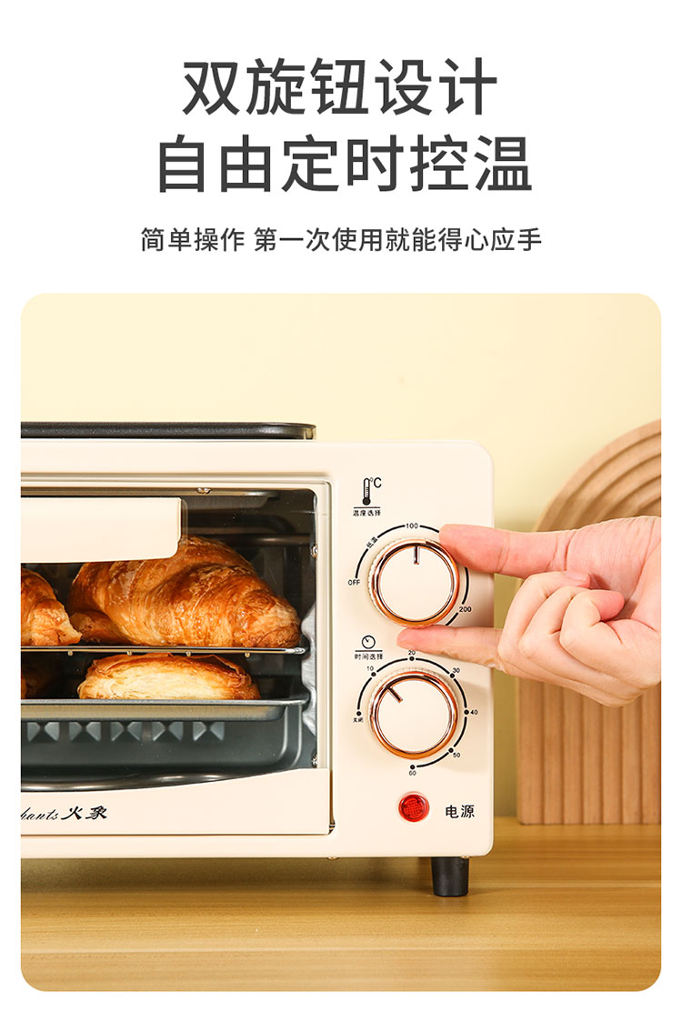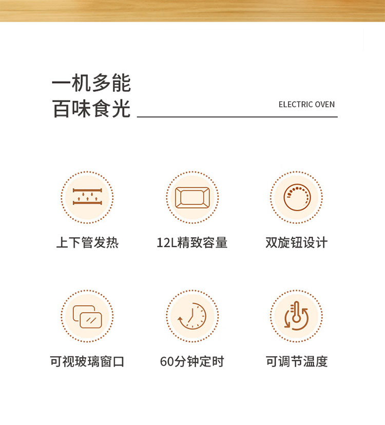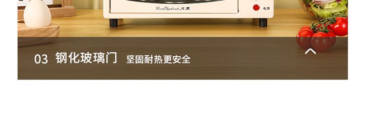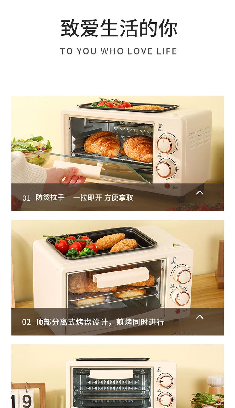 额定功率:700W 额定电压:220V 额定频率:50Hz 额定容量:12L 净重毛重:1.8kg/2.3kg 产品材质:镀锌板+冷轧板 产品颜色:米白色 产品规格:336*214*200mm 彩盒尺寸:363*258*238mm 外箱尺寸:795*378*494mm 采用机械双旋钮控温控时,操作简单,广域控温控时,满足不同食材的烤制需求。 采用高效的上下同时加热方式,加热性能稳定,加热速度快,煎烤效果更好。 顶部分离式烤盘设计,可煎烤同时进行,多种美味同时享受,还易清洗。