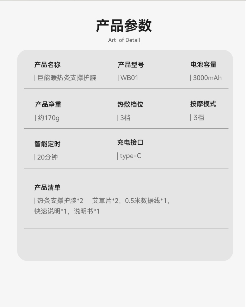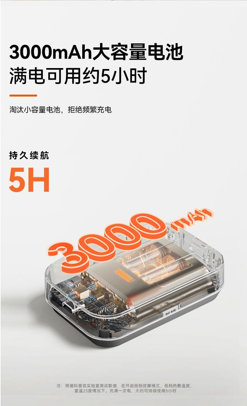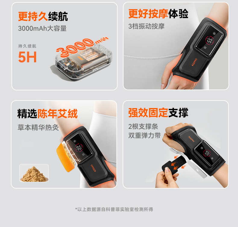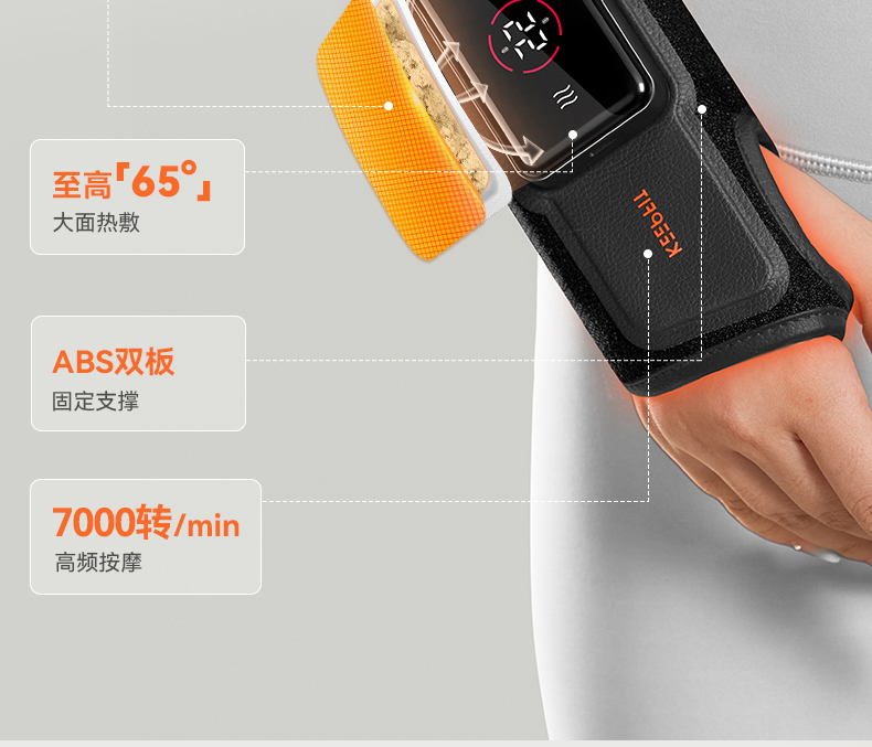 【四核独立按摩】内置4个精密按摩头,独立操控,可组合多种律动模式 【双面立体支撑】内外双面贴合设计,佩戴稳固不位移,按摩力度直达深层肌群 【发热材质】石墨烯发热片,5S速热,发热均匀,深层渗透肌肉有效缓解酸痛 【电池容量】3000mAh大容量电池