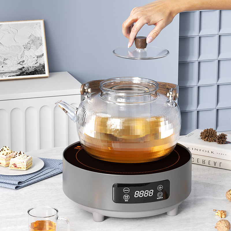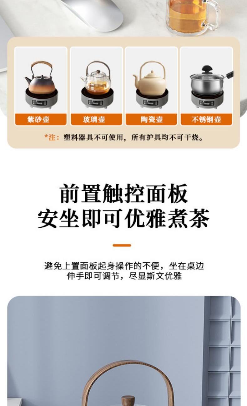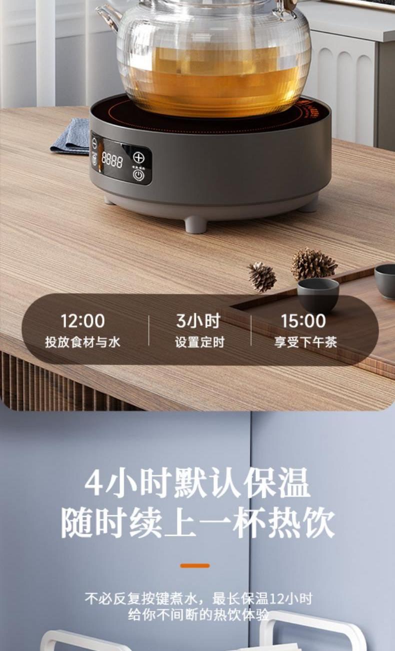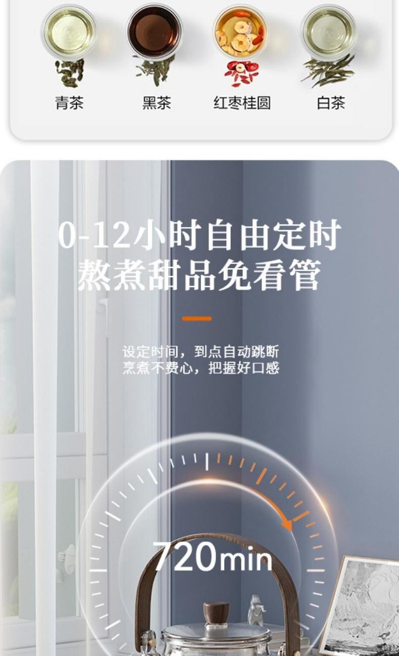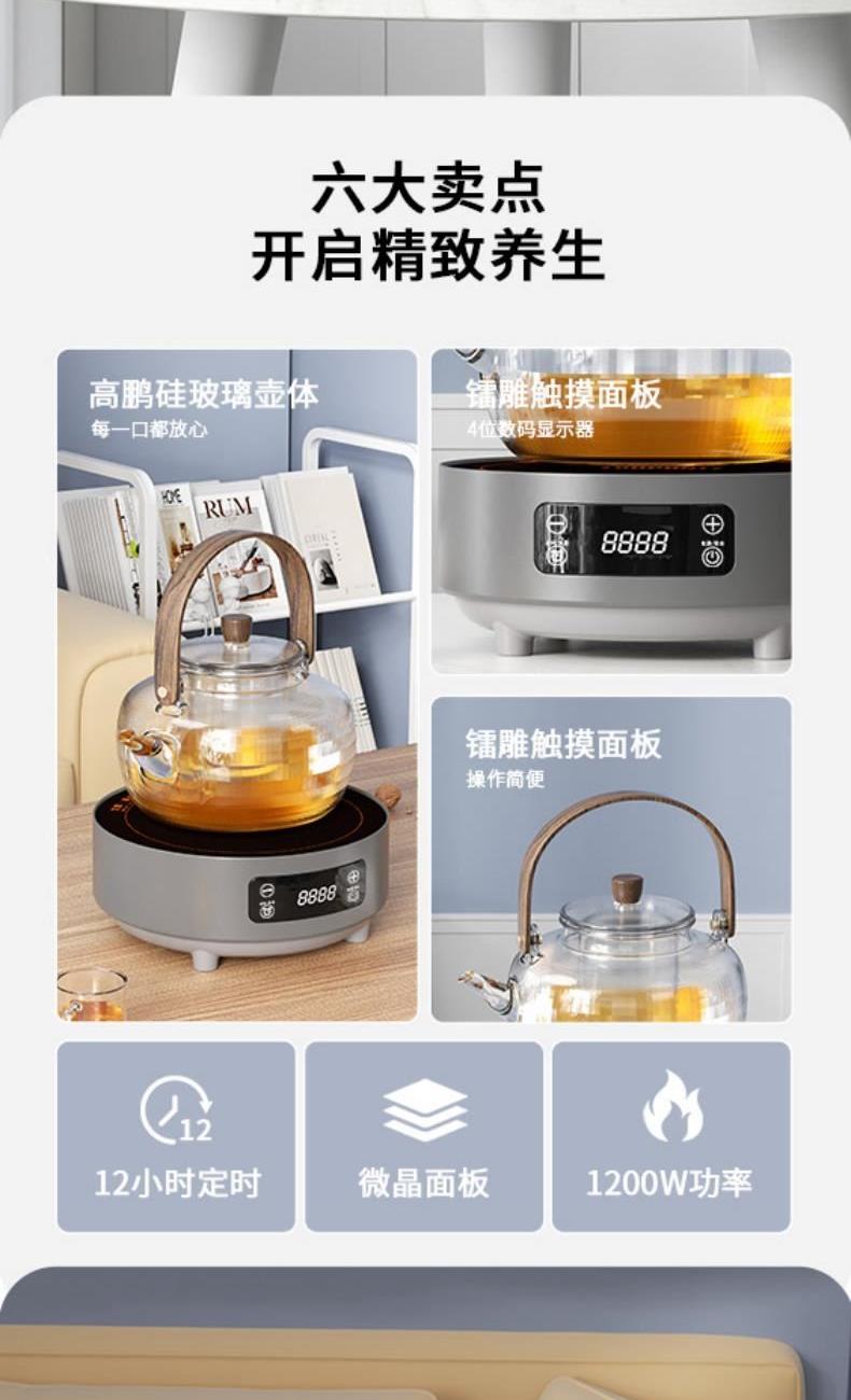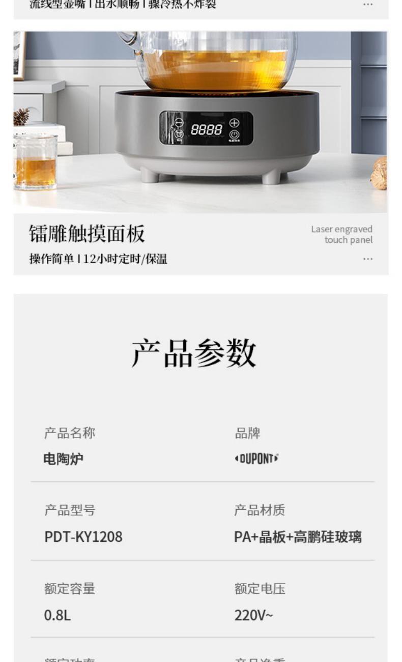 产 品 材 质:PA+晶板+高硼硅玻璃 额 定 容 量:0.8L 额 定 电 压:220V~ 额 定 功 率:1200W 产 品 净 重:1.2kg 产 品 毛 重:1.4kg 产 品 尺 寸:165*165*250mm 包 装 尺 寸:290*210*230mm 外 箱 尺 寸:580*530*670mm 装 箱 数:8台/箱 电脑款,镭雕触摸面板,操作简便。 4位数码显示器,4小时定时,12小时保温。 一机多用,不挑锅具,百搭好用。 微晶板,1200W大功率高效传热。 小巧外形,不占空间,移动便携。