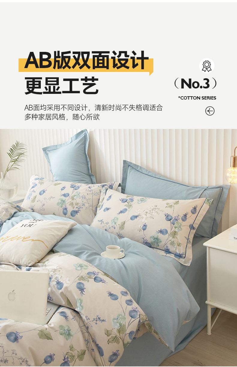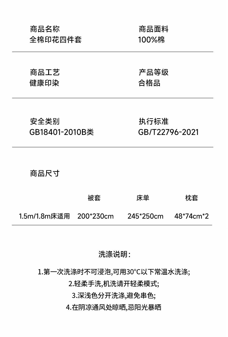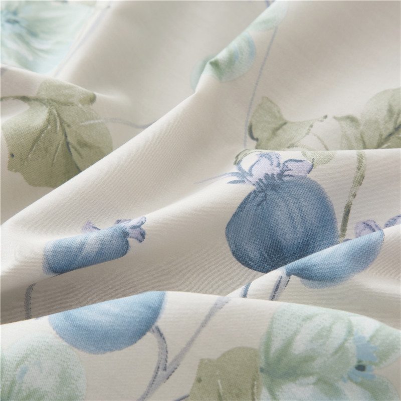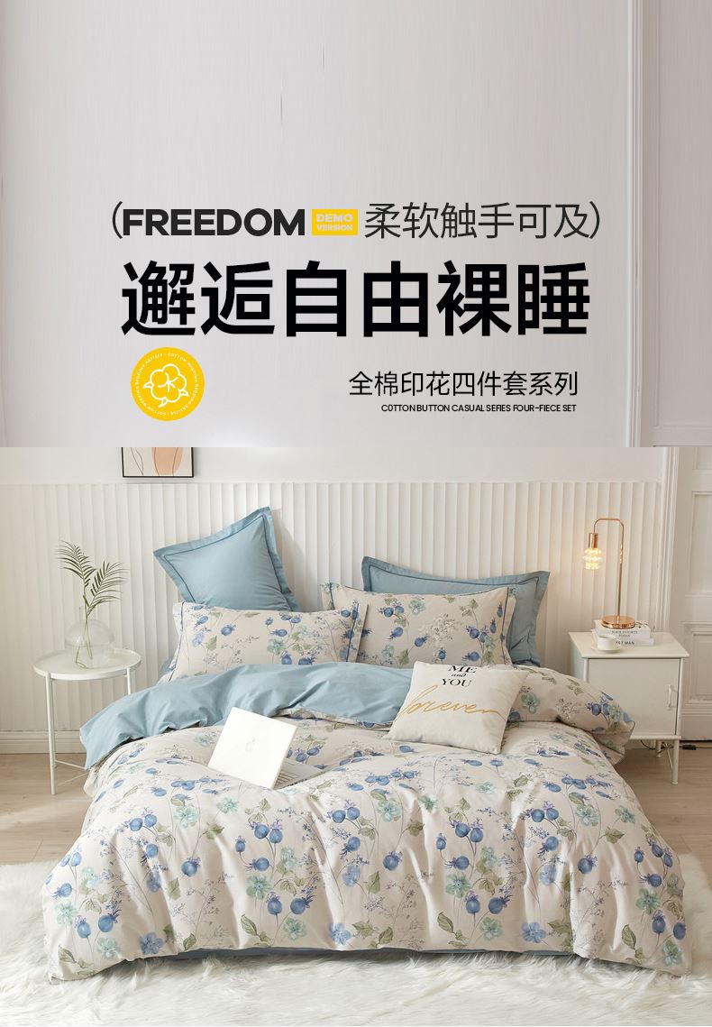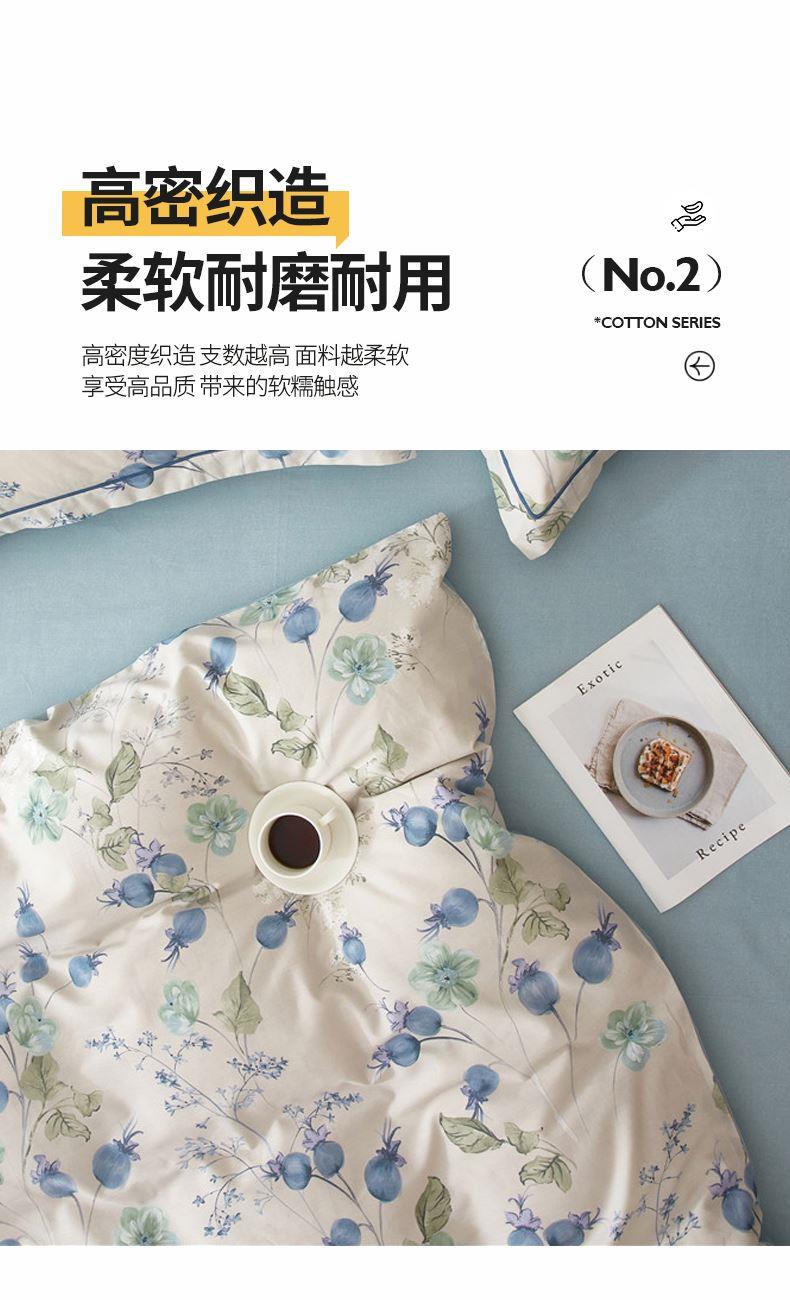 被套:200×230cm 床单:245×250cm 枕套:48×74cm 面料:全棉(133×76精梳棉) 适用:1.5m-1.8m床 印染工艺:活性印花 风格:轻奢田园风 优选全棉高密度织造面料,AB版双面设计,活性印染工艺,清新时尚不失格调适合多种家居风格,随心所欲。