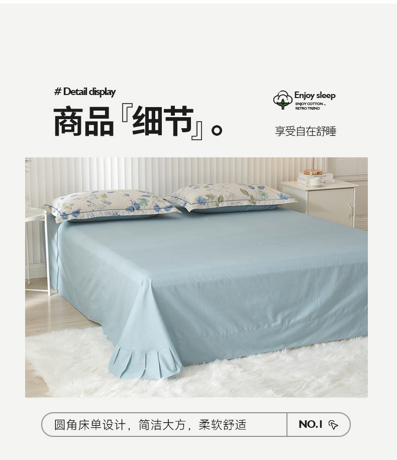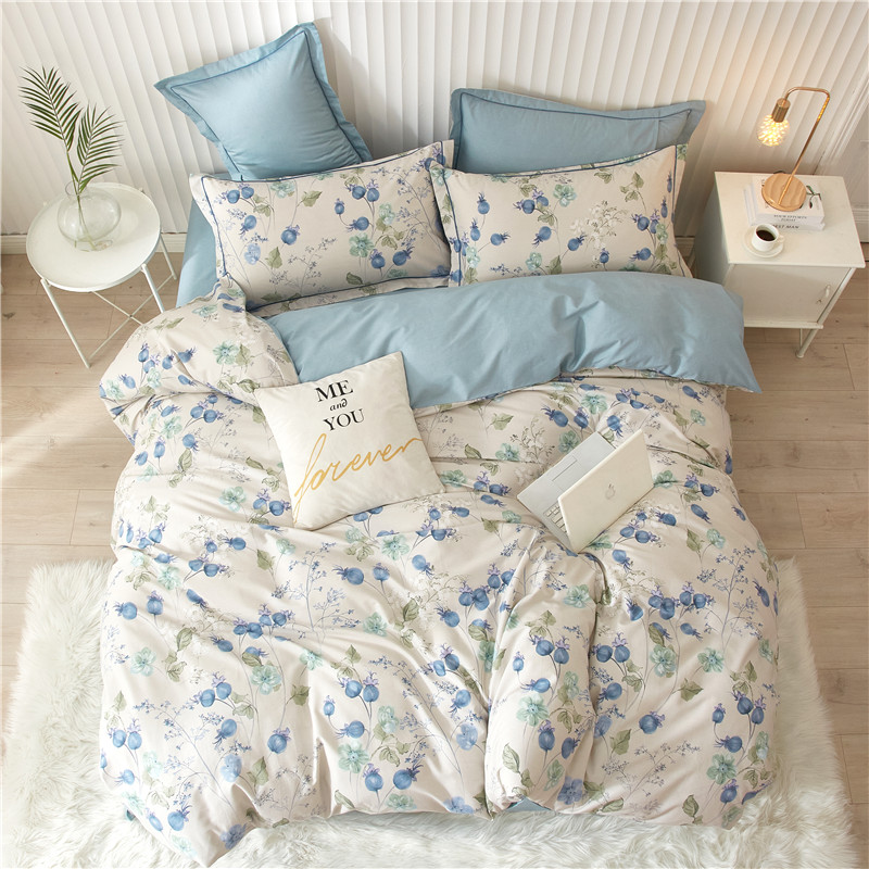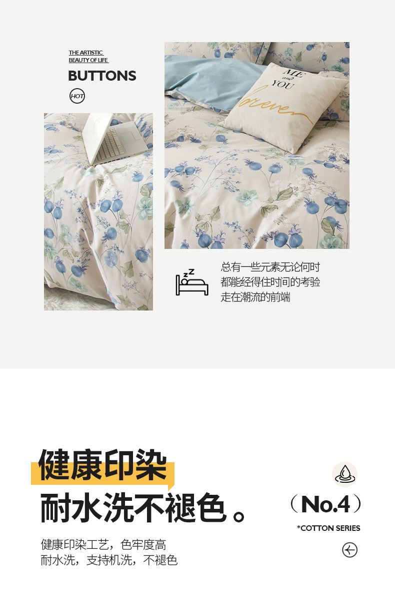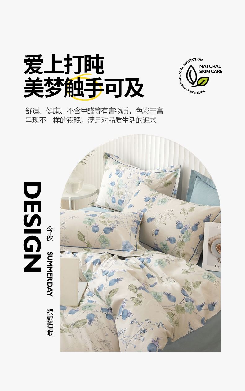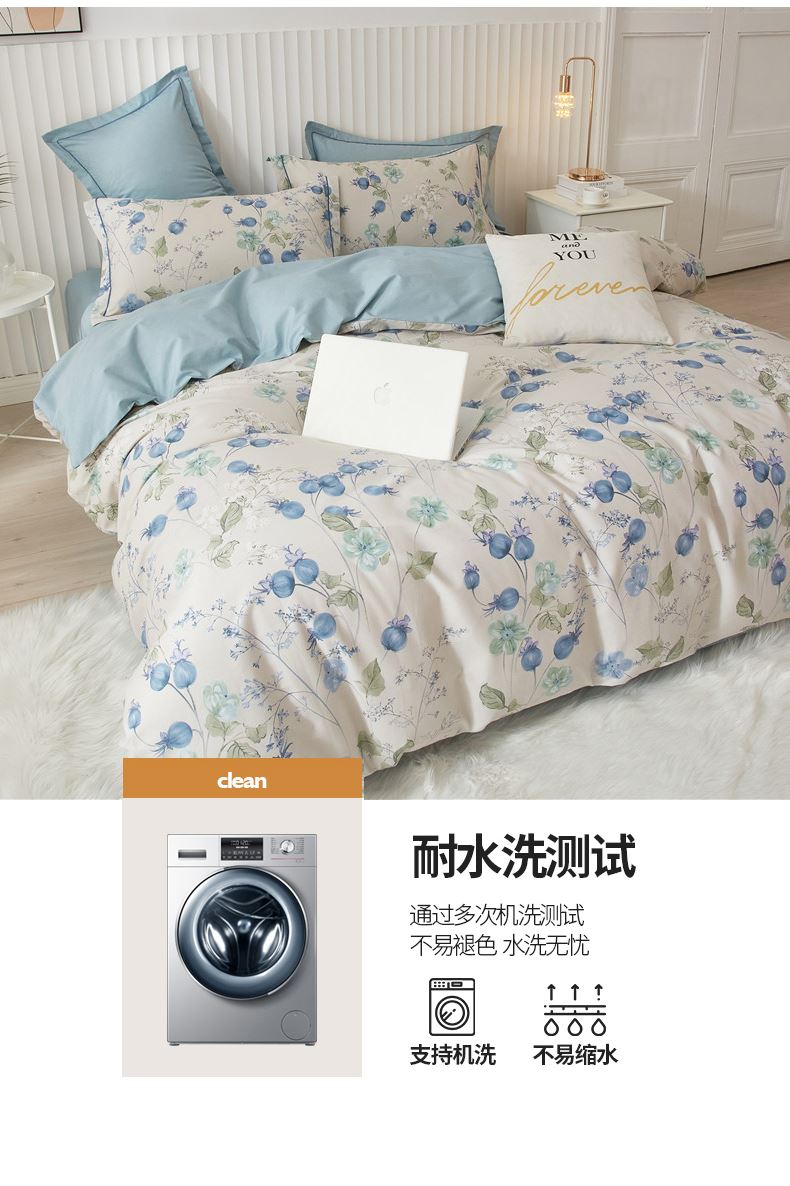 被套:200×230cm 床单:245×250cm 枕套:48×74cm 面料:全棉(133×76精梳棉) 适用:1.5m-1.8m床 印染工艺:活性印花 风格:轻奢田园风 优选全棉高密度织造面料,AB版双面设计,活性印染工艺,清新时尚不失格调适合多种家居风格,随心所欲。