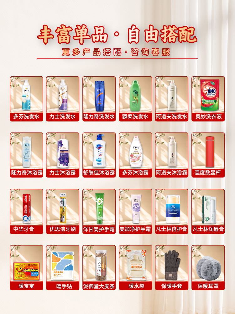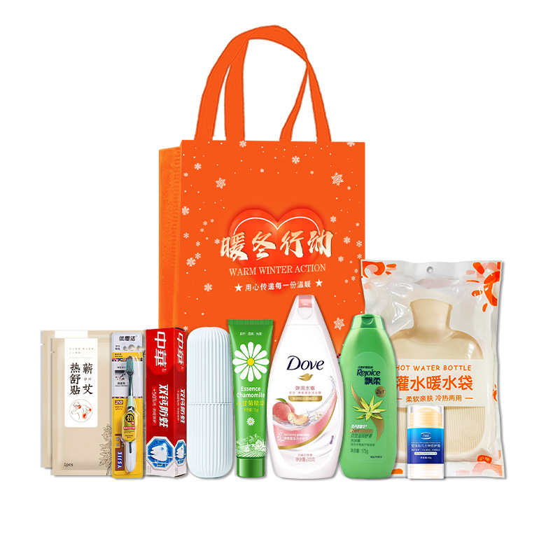 礼袋尺寸:20*27*10cm 包装尺寸:66* 45*51 CM 产品配置:(香型随机) 飘柔洗发水170ml 多芬沐浴露300ml 中华牙膏90g 优思洁牙刷 洗漱杯 暖水袋500ml 洋甘菊护手霜75g 热舒贴(2片装/袋)*2袋 凡士林倍护膏40g 精美礼袋