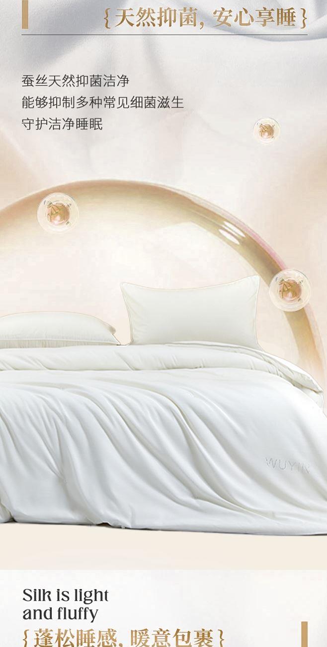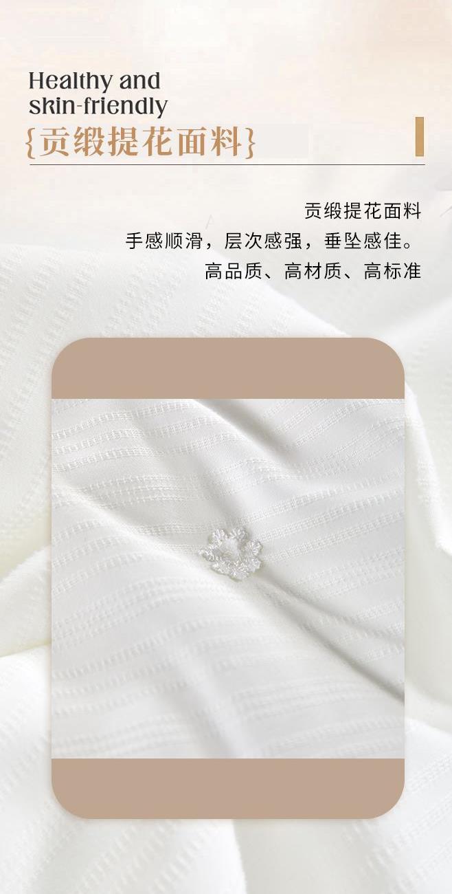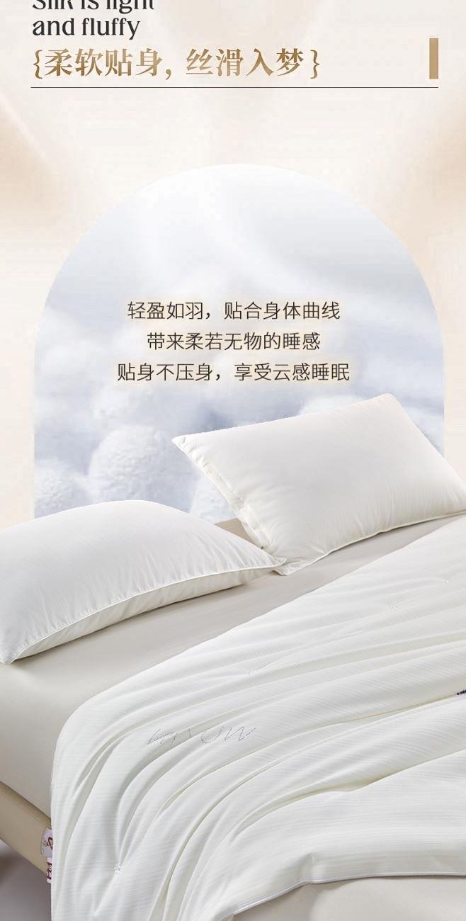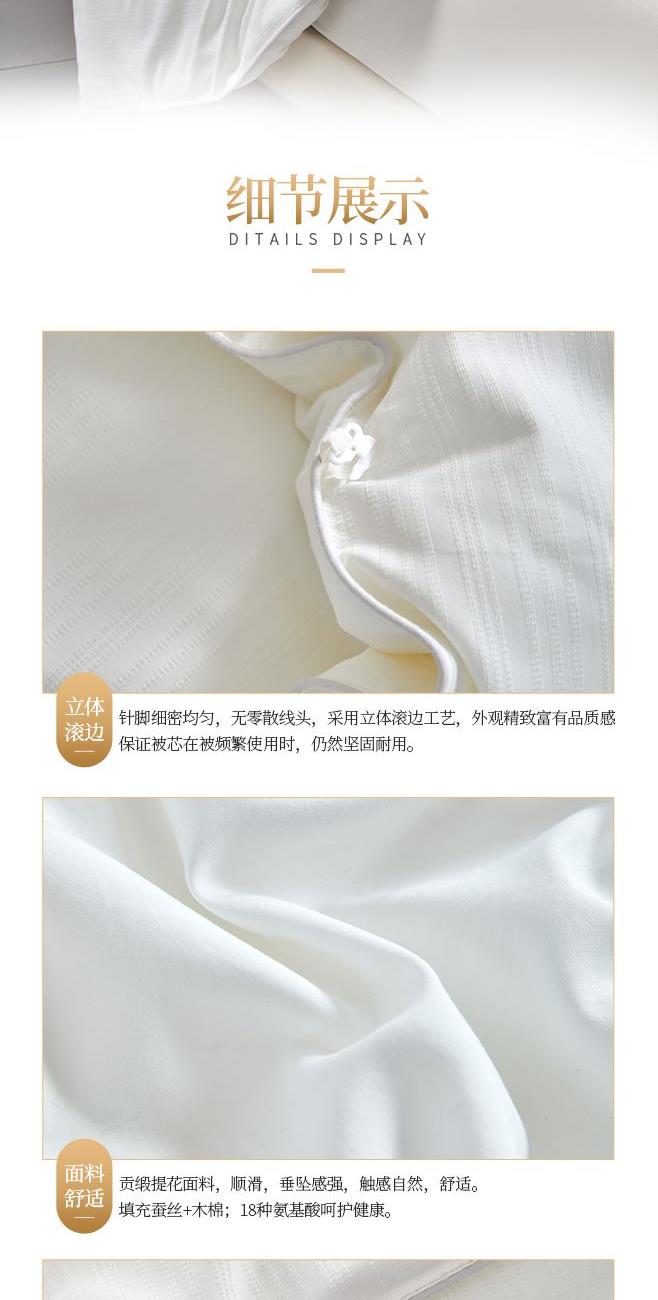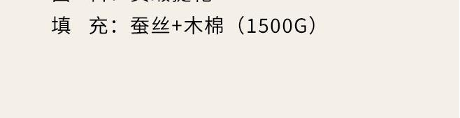 规 格:200×230(±2)cm 克 重:2700g 面 料:贡缎提花 填 充:蚕丝+木棉(1500g) 填充含蚕丝,18种氨基酸,有效的呵护我们睡眠和健康。 贡缎提花面料,手感顺滑,层次感强,垂坠感佳。 宽边设计,细节处理,被子更大气。 高品质、高材质、高标准,一款对生活高度负责的产品