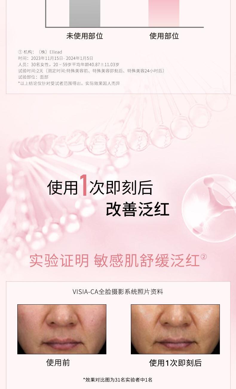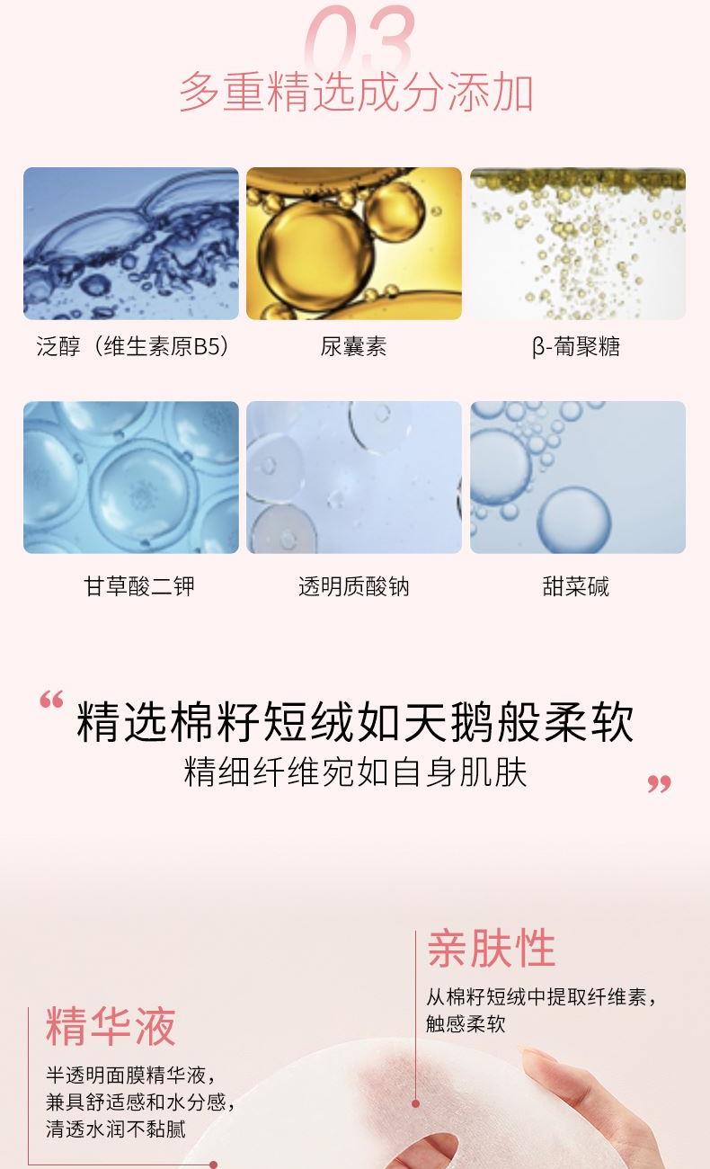 舒缓修护,维稳安肤,强韧屏障(特殊美容后适用) 精选棉籽短绒如天鹅般柔软,精细纤维宛如自身肌肤; 精华液:半透明面膜精华液,兼具舒适感和水分感,清透水润不黏腻; 亲肤性:从棉籽短绒中提取纤维素,触感柔软; 吸收力:紧锁精华液,密集保湿,轻拍更好吸收。