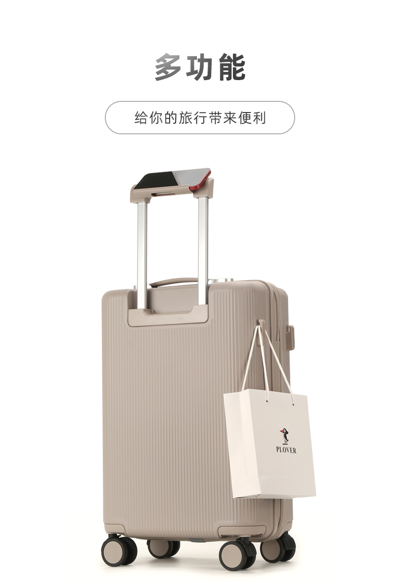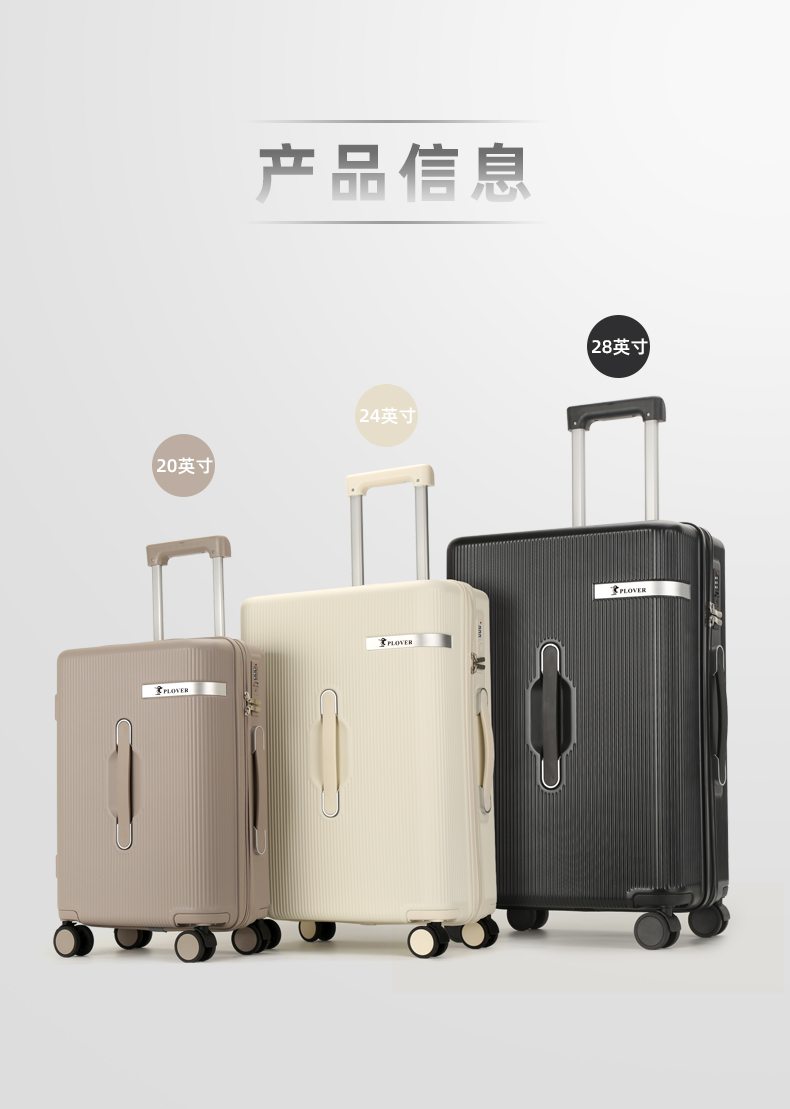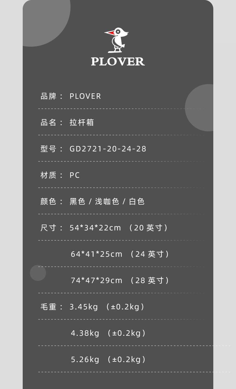 PLOVER香港啄木鸟28英寸时尚旅行箱 GD2721-28 外部材质:PC 内部材质:涤纶+PVC 产品"规格:74*47*29CM 重量:5.26kg 瓦楞纸箱 颜色 :黑色,白色,咖色 1.纯PC材质 2.手机机架 3.侧边挂勾 4.铝材贴条装饰 5.三位数下沉式密码锁 6.万向轻音轮 7.防爆拉链 10.干湿分离层"