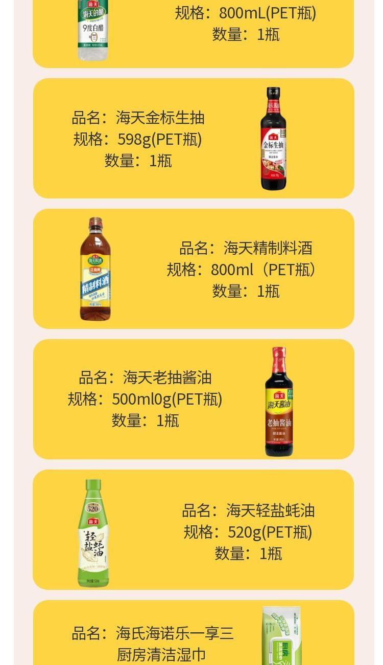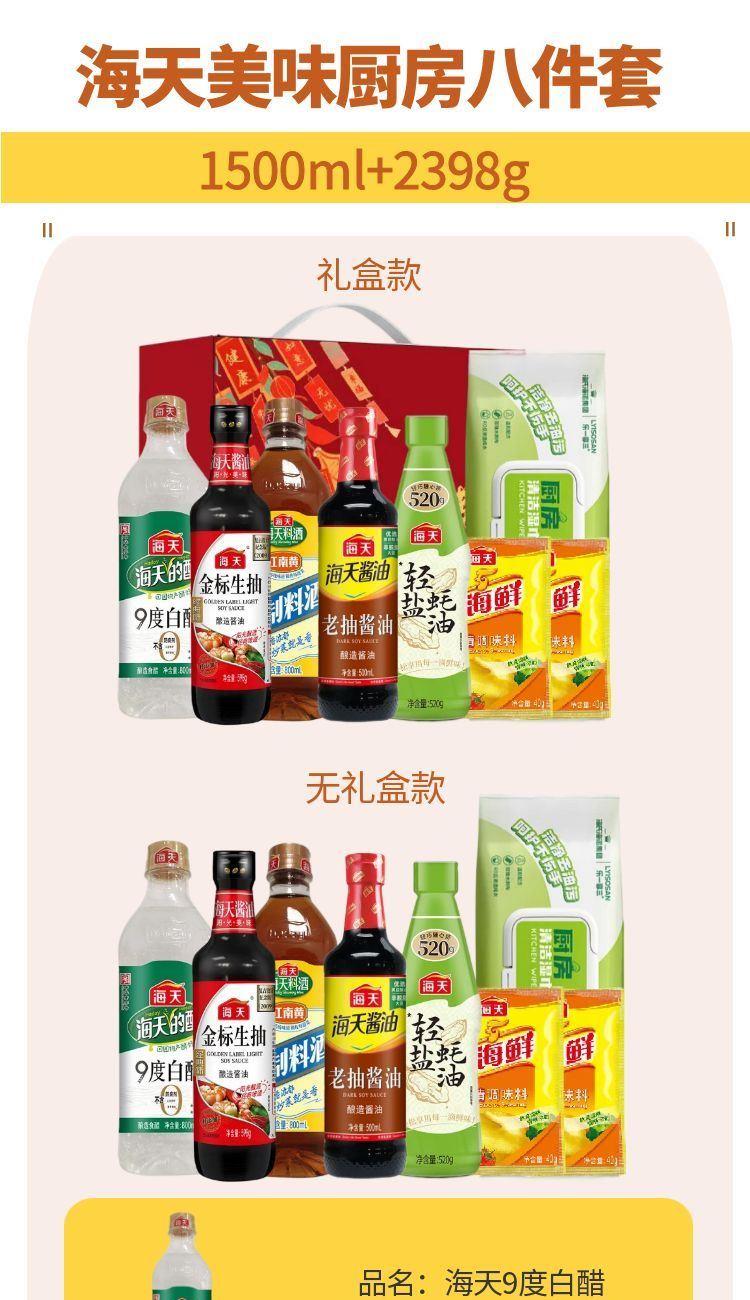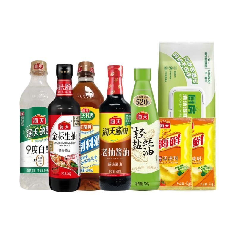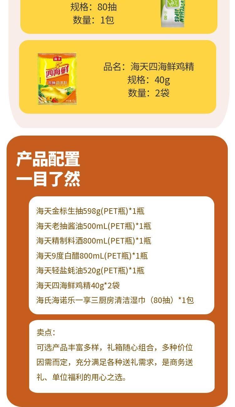 产品配置: 海天金 标生抽598g(PET瓶)*1瓶 海天老抽酱油500mL(PET瓶)*1瓶 海天精制料酒800mL(PET瓶)*1瓶 海天9度白醋800mL(PET瓶)*1瓶 海天轻盐蚝油520g(PET瓶)*1瓶 海天四海鲜鸡精40g*2袋 海氏海诺乐一享三厨房清洁湿巾(80抽)*1包 卖点: 可选产品丰富多样,礼箱随心组合,多种价位因需而定,充分满足各种送礼需求,是商务送礼、单位福利的用心之选。