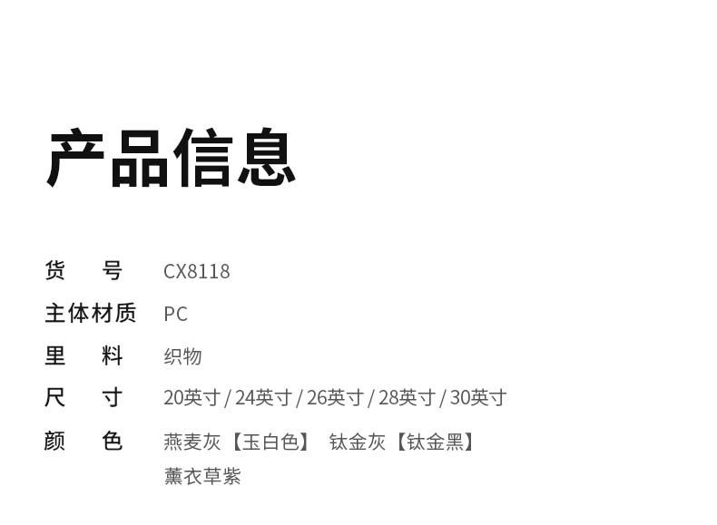 货号: CX8118-28 主体面料:聚碳酸酯(PC);里料:织物 28寸颜色:玉白色 净重: 4.4kg/93L