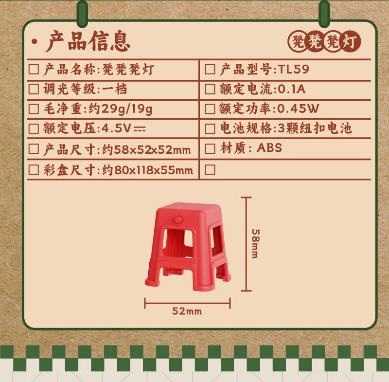 调光等级:一档 额定电流:0.1A 毛净重:约29g/19g 额定功率:0.45W 额定电压:4.5V-- 电池规格:3颗纽扣电池 产品尺寸:约58x52x52mm 材质:ABS 彩盒尺寸:约80x118x55mm 外箱尺寸:54x35x56CM 整箱毛净重:9.2KG/8.2KG 备注:本产品须整箱发货