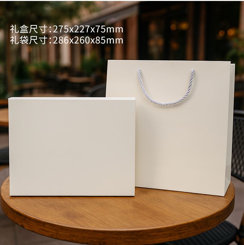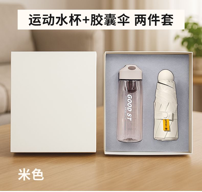 礼盒配置: 1、550ml运动水杯;尺寸:208x68mm 2、21寸5折6骨钢胶囊伞(高密度碰击黑胶布) 3、包装盒尺寸:275x227x75mm 4、手提袋尺寸:286x260x85mm 5、颜色:米白色 6、重量:21kg/箱