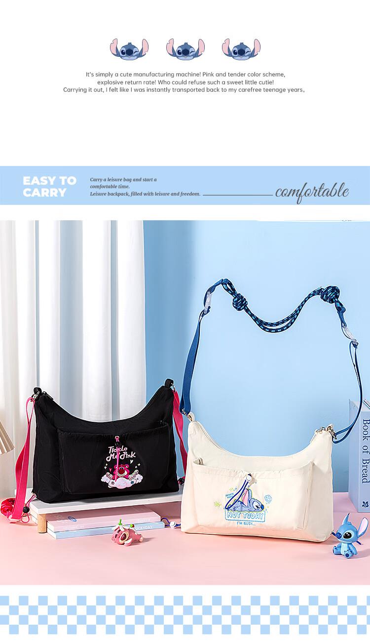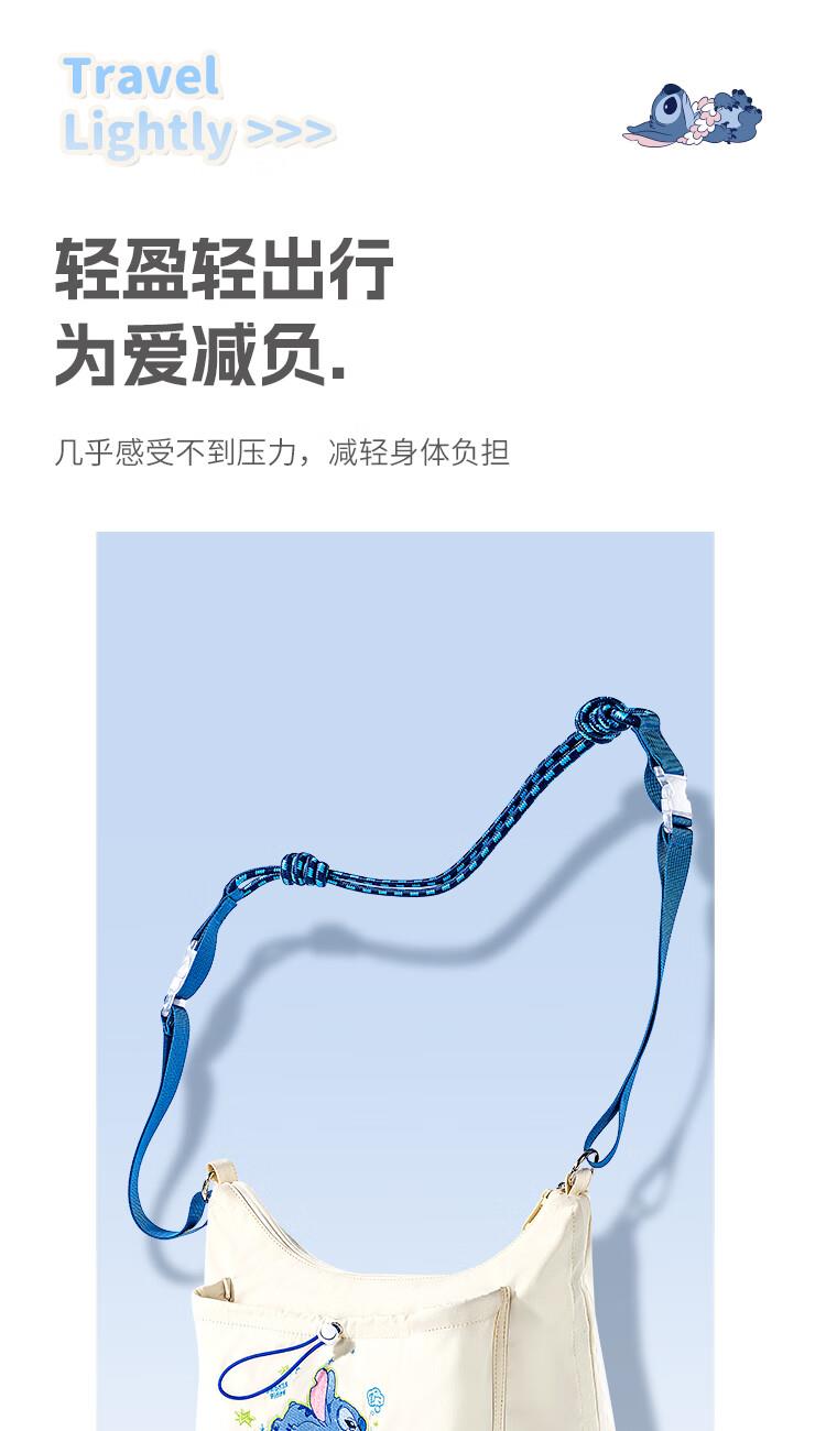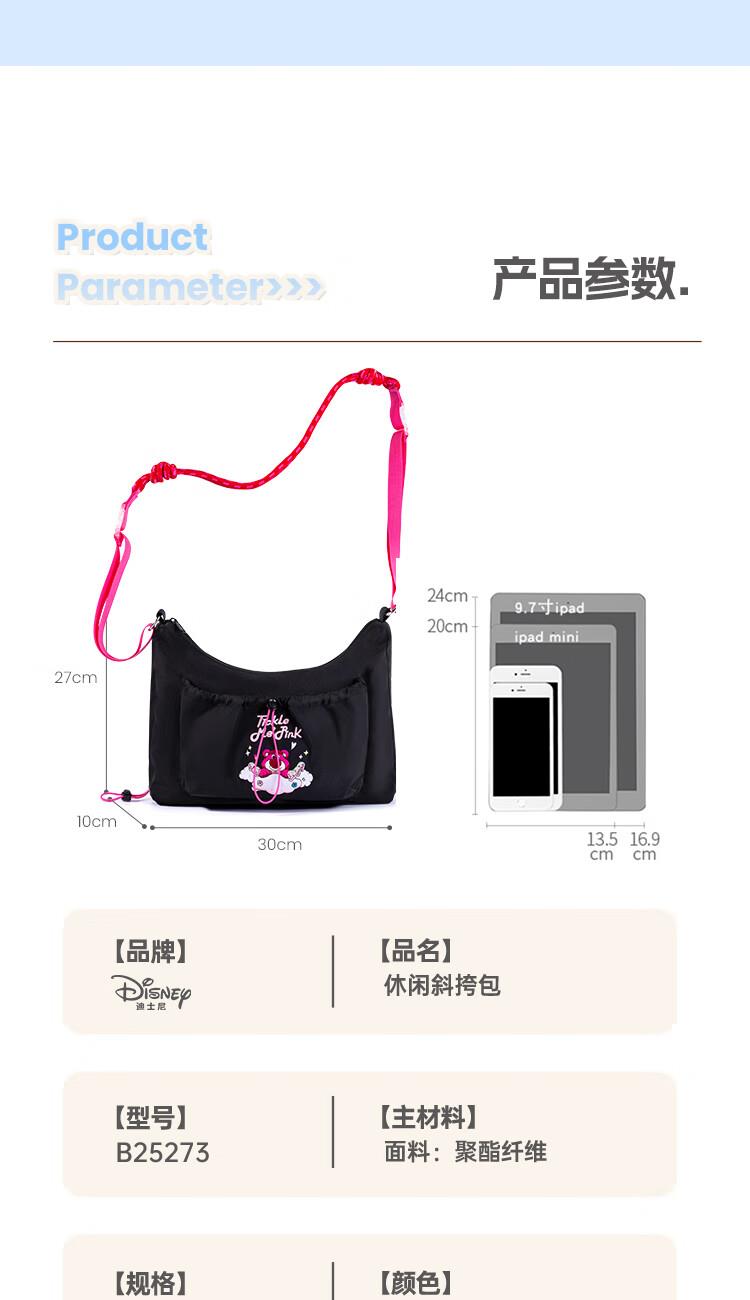 迪士尼(Disney)斜挎包学生出游包外出可爱单肩包初中高中生轻便斜挎包 型号:B25273 产品卖点说明:轻巧便捷,一包多用,大容量,便捷前袋,防泼水面料,休闲单品,厚实挂绳,IP刺绣工艺