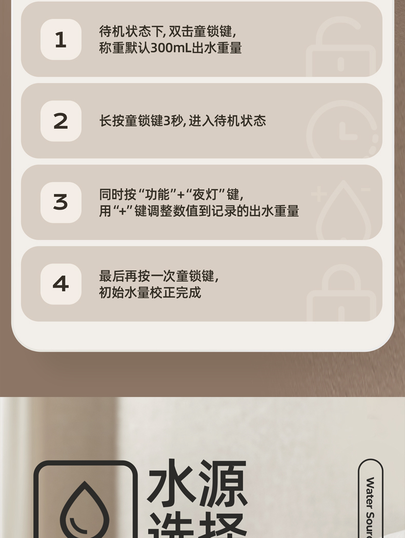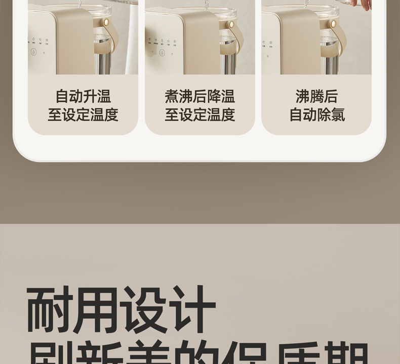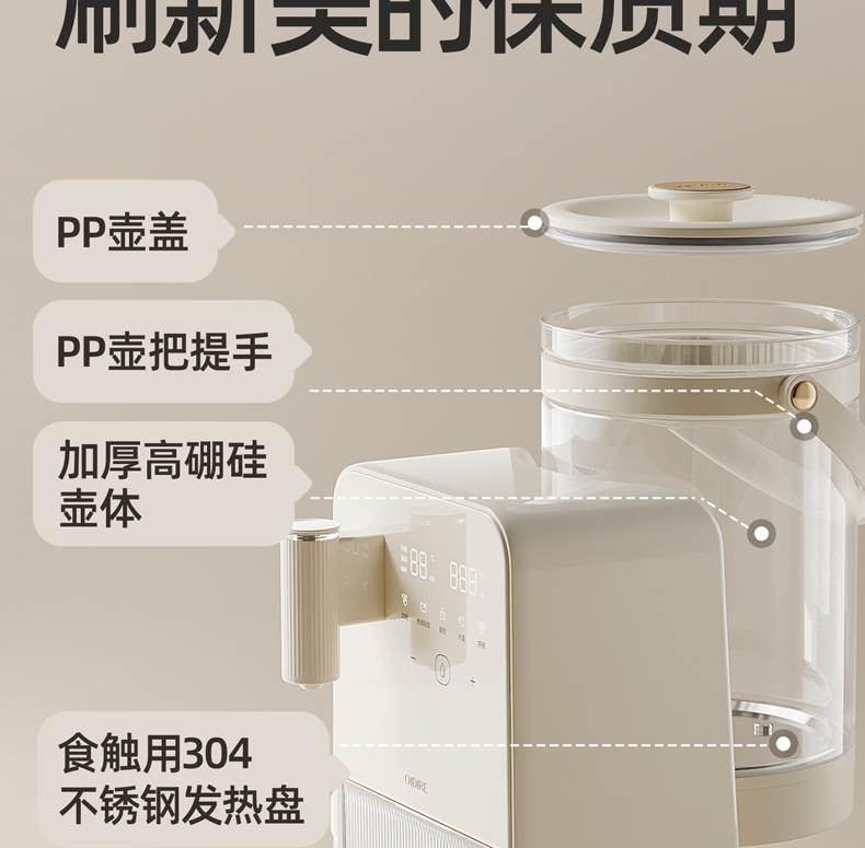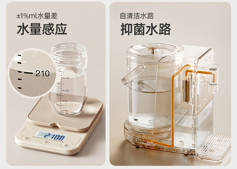 主要材质:ABS+304不锈钢+高硼硅玻璃 电压:220V 功率:1200W 产品容量:3L 裸机:335*182*306 内箱:362*222*360 1.3L大容量,满足日常喝水需求 2.自动排废水设计,每杯都是鲜活水 3.24小时恒温,内置NTC控温,实时显示水温 4.分体式设计,清洗更方便 5.定量出水,一键泡奶 6.特设夜灯模式,晚上喂奶不抹黑 7.安全童锁模式,防止小孩误触烫伤 单台净重:2.7 单台毛重:3.4