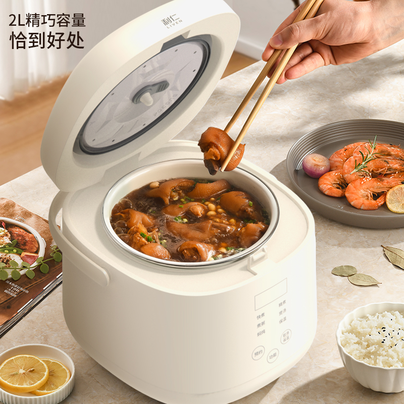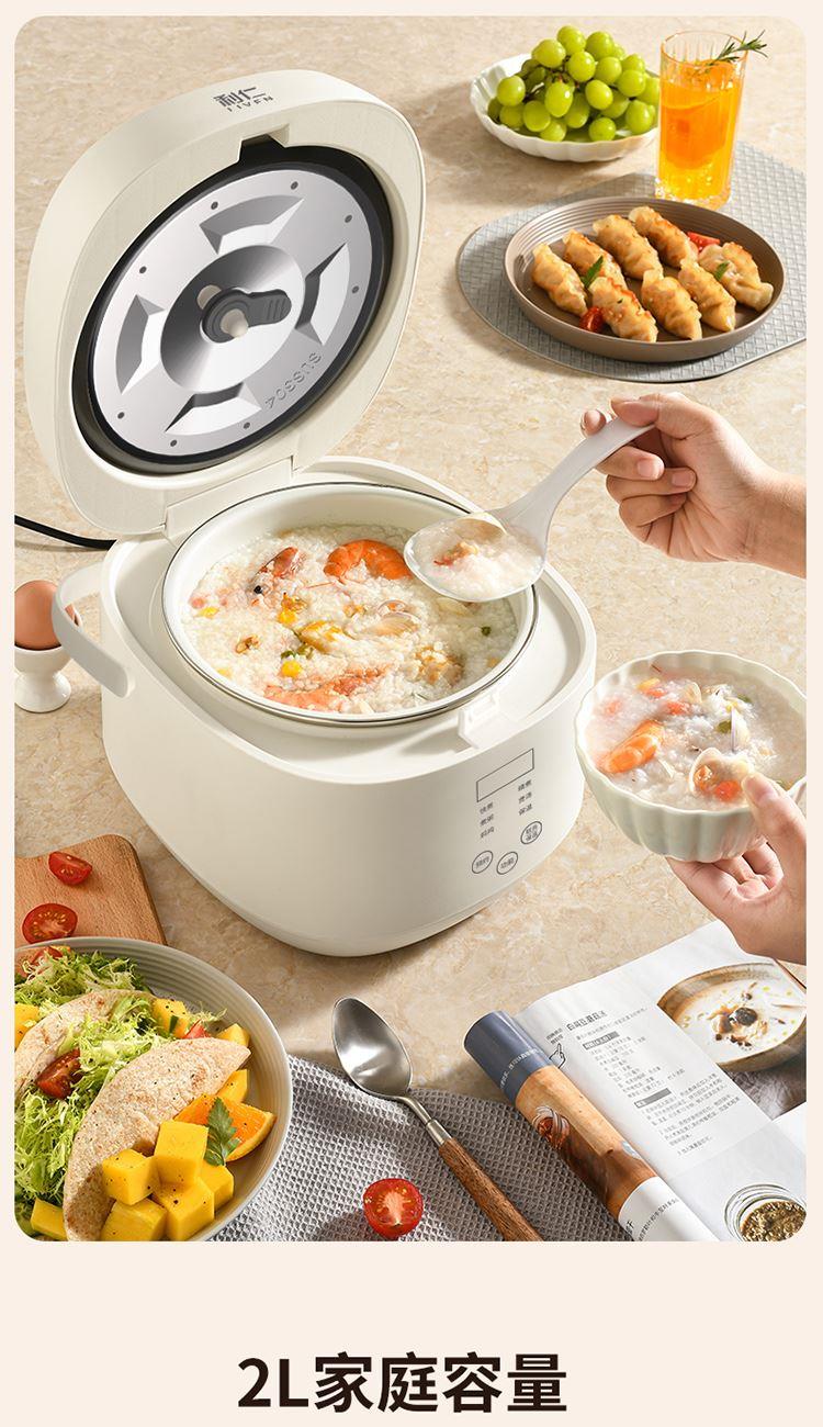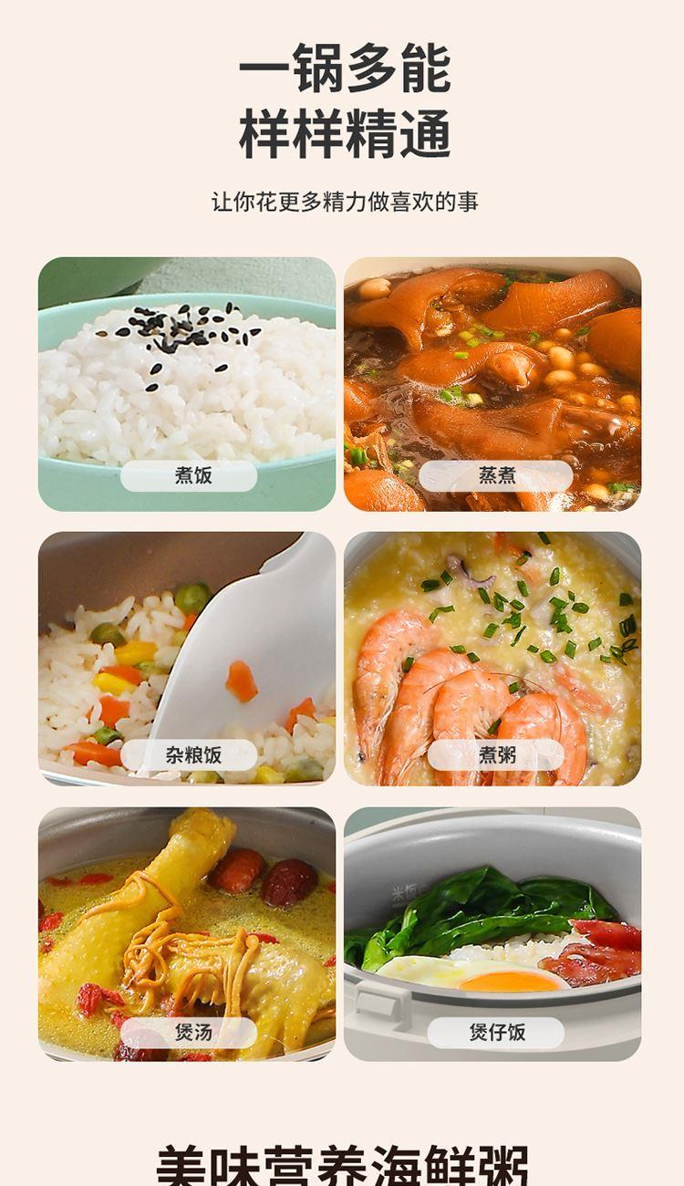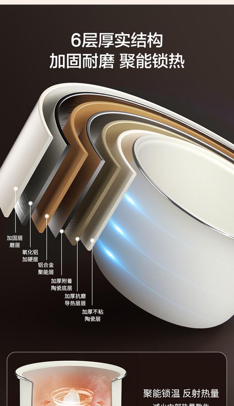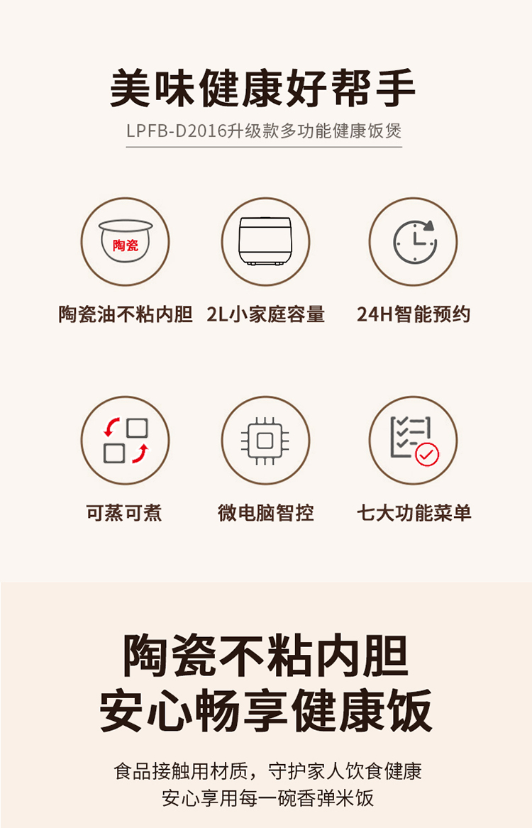 陶瓷油不粘内胆,守护家人饮食健康 2L小家庭容量,6层厚实结构加固耐磨 24H智能预约,提前预约准时吃饭 可煲可煮享尽一锅美食诱惑 七大功能菜单,一键解锁