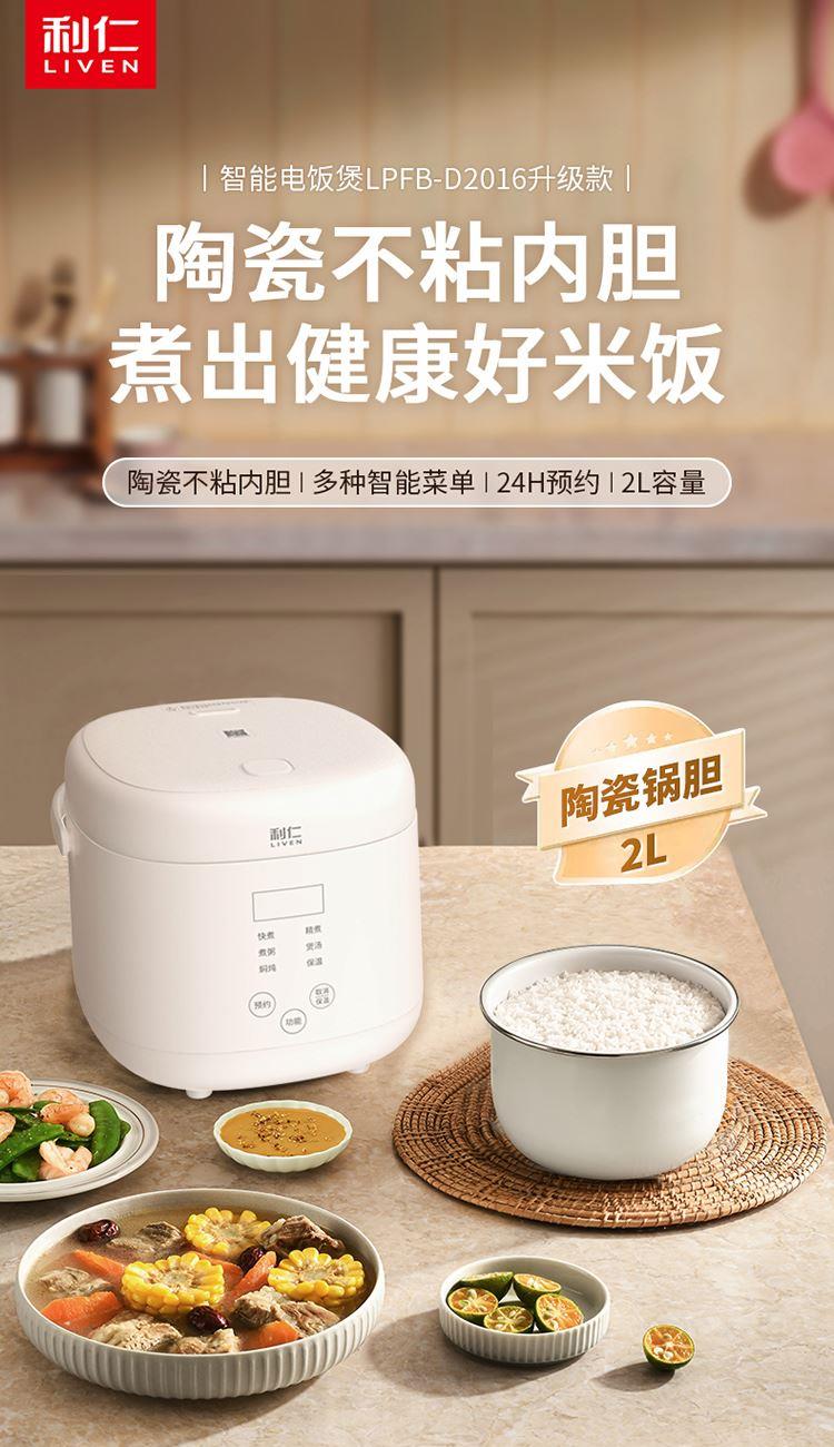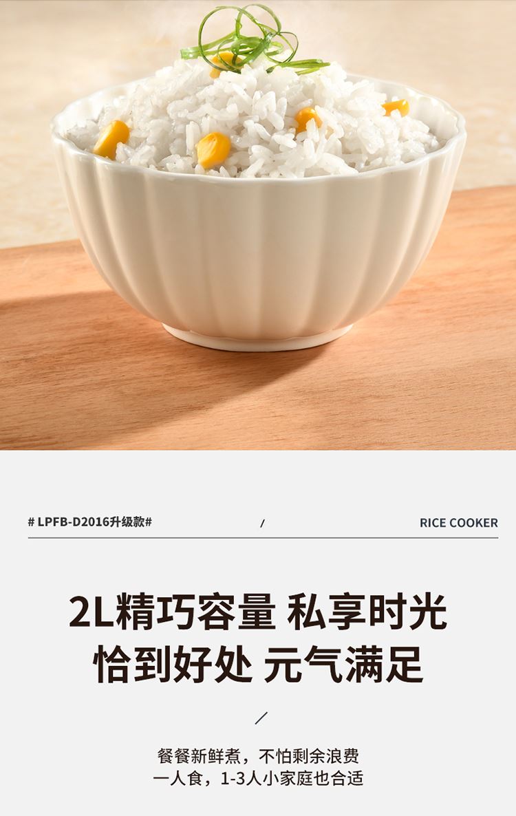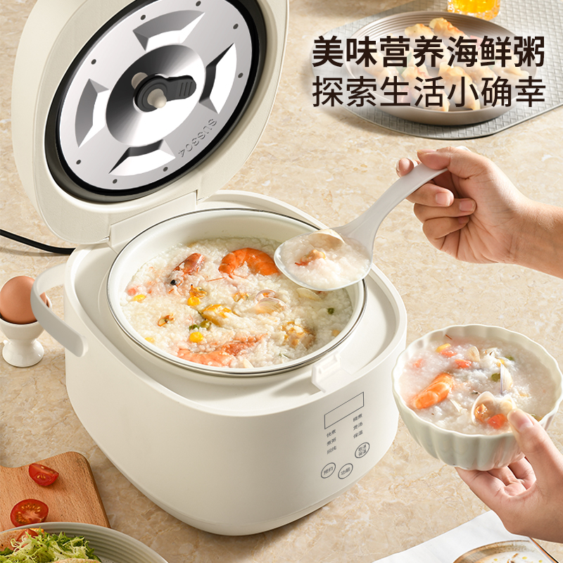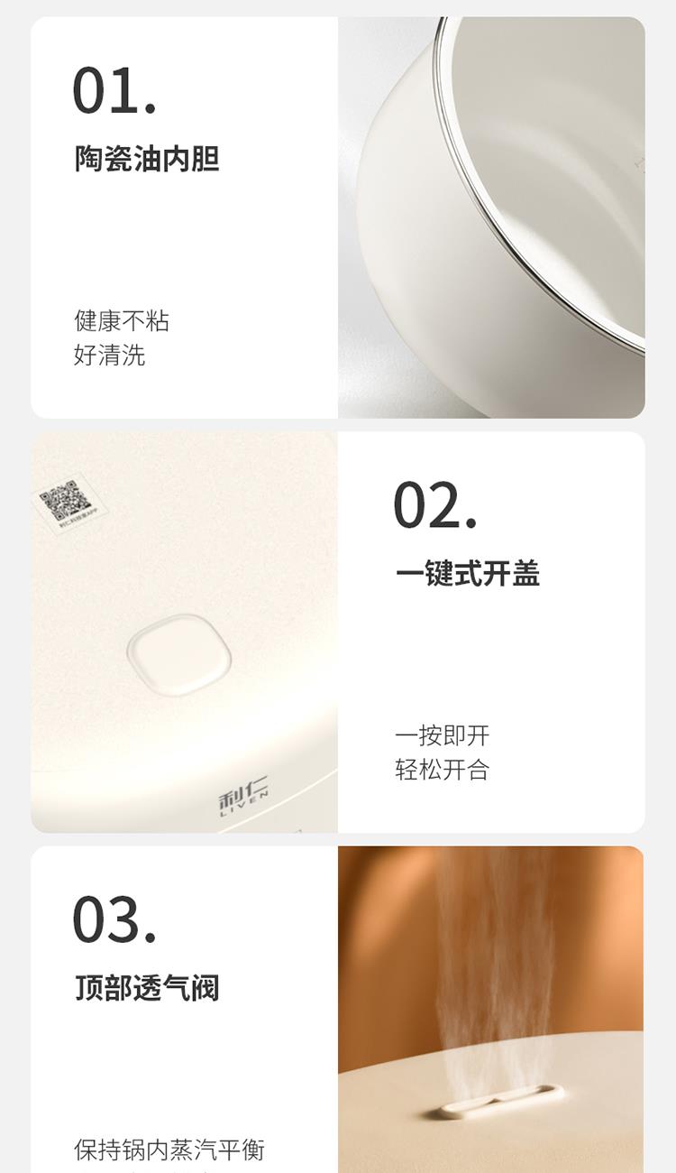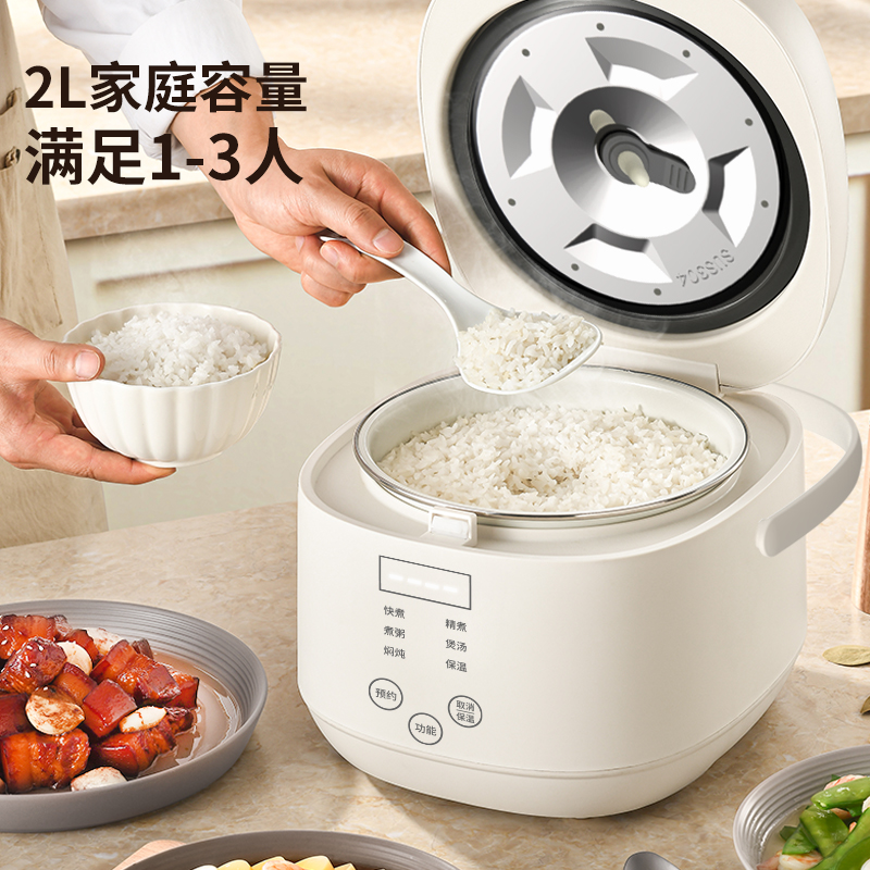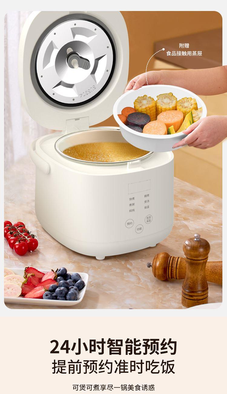 陶瓷油不粘内胆,守护家人饮食健康 2L小家庭容量,6层厚实结构加固耐磨 24H智能预约,提前预约准时吃饭 可煲可煮享尽一锅美食诱惑 七大功能菜单,一键解锁