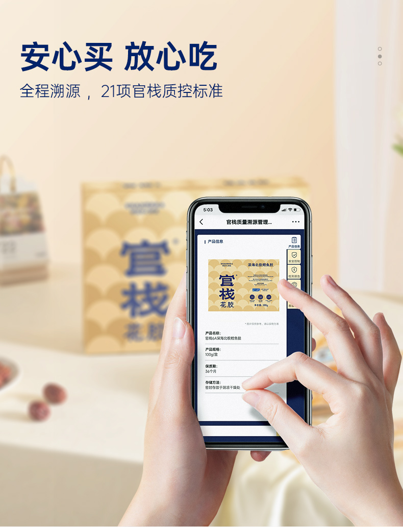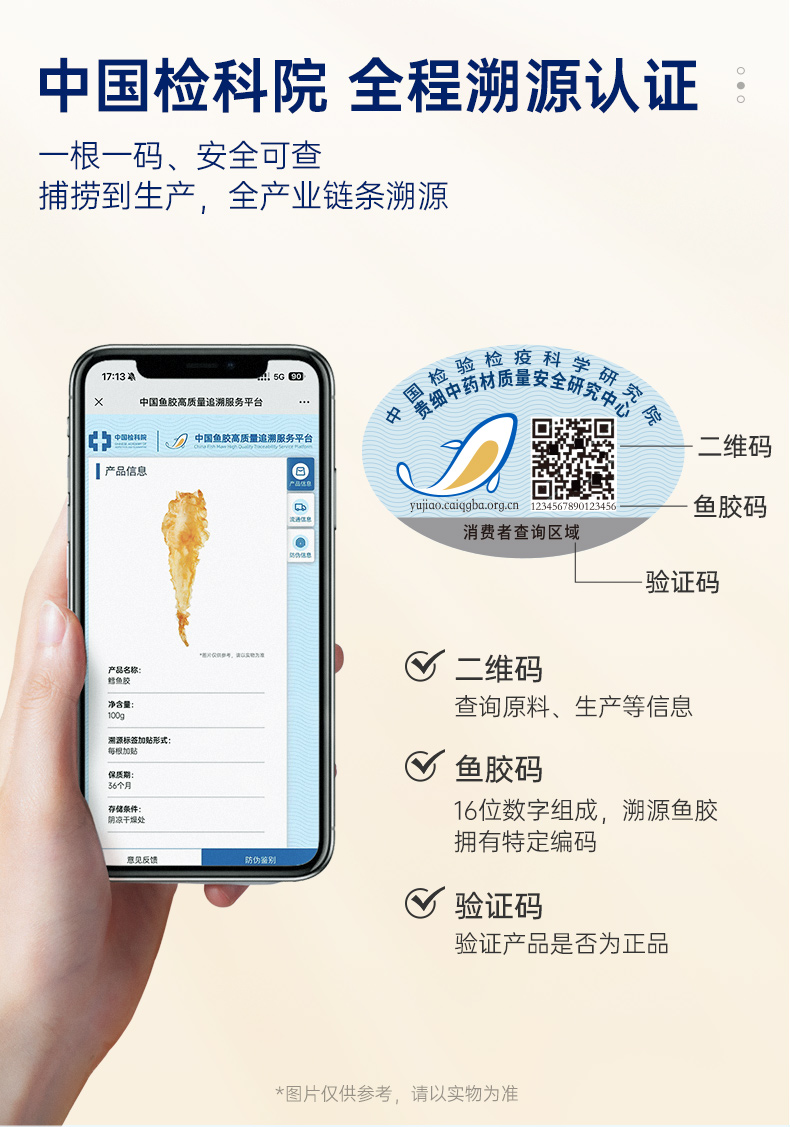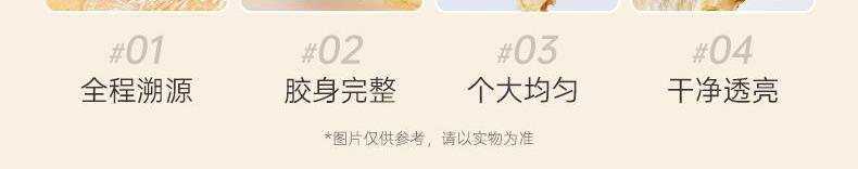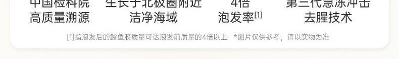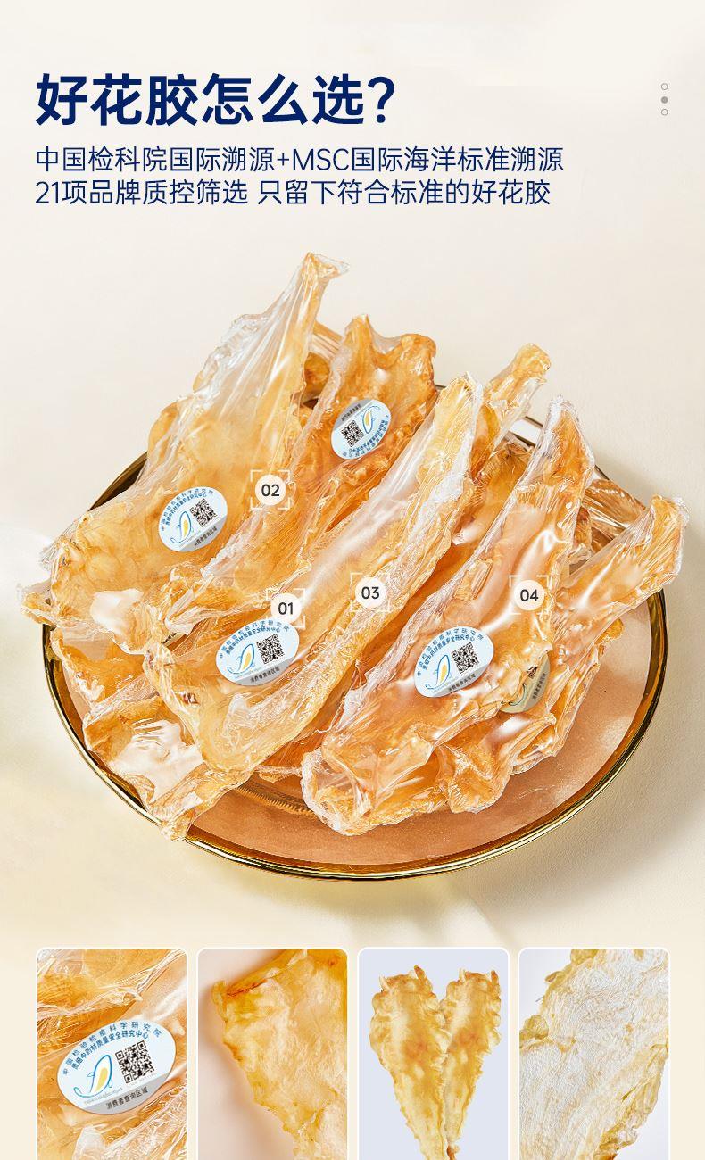 【单片溯源】一片一溯源码,MSC国际海洋全程追溯 【高蛋白低脂】高蛋白[1]、低脂肪[1],轻松滋补少负担 【高泡发率】物理工艺,干度足,营养留存高,轻松4倍泡发率 【腥味淡】第三代急冻冲击去腥技术,使血块溶于水不浸入胶体; 纯手工清洗去除油脂、血丝、黑膜等腥味来源。 【21项质控】21项质控筛选,高标准只挑高品质、好品相花胶