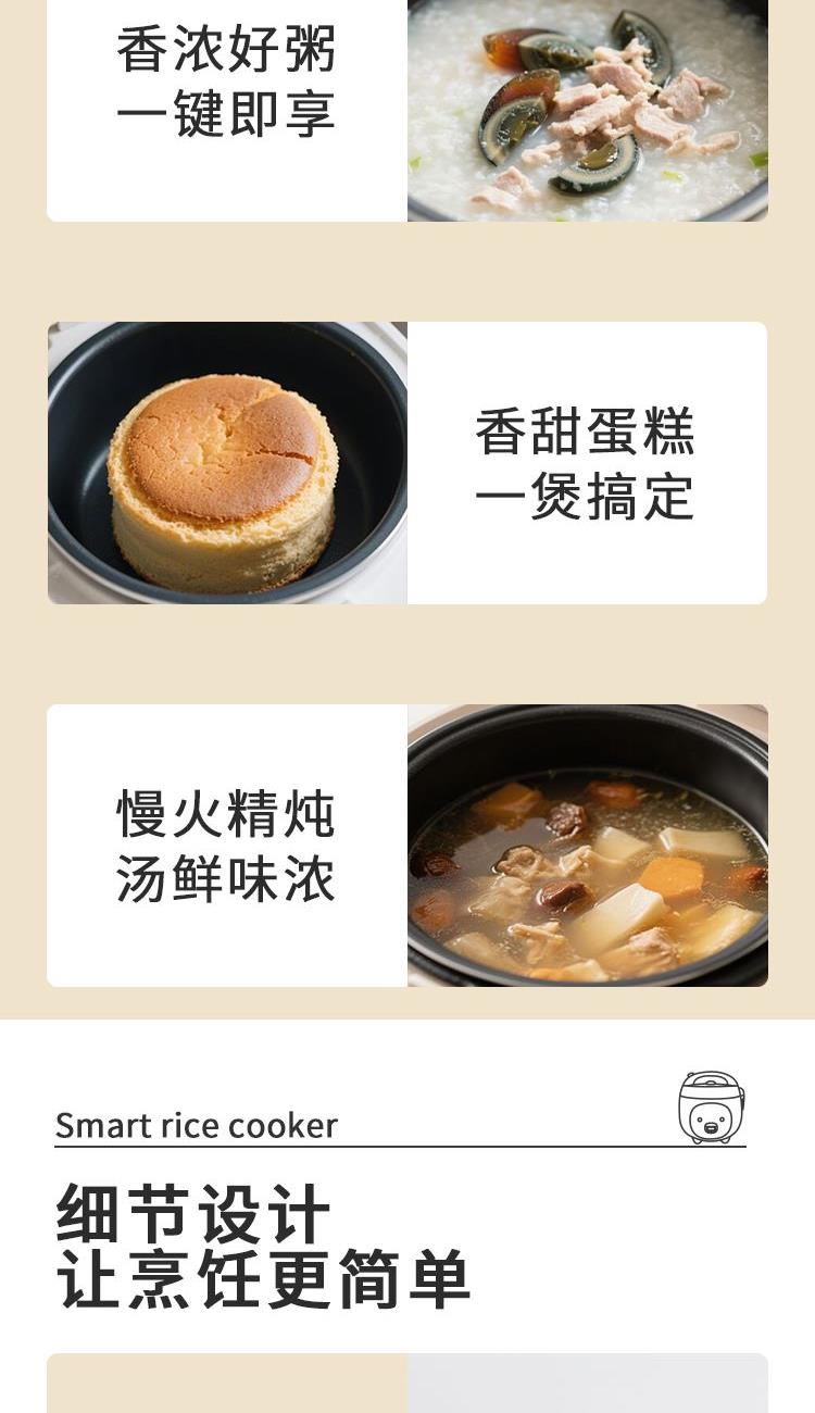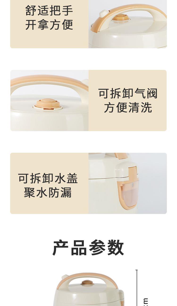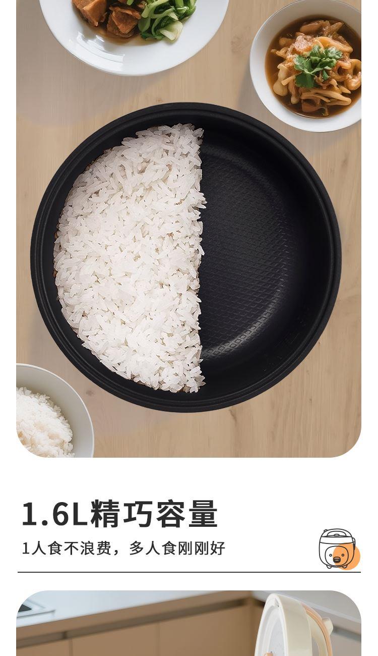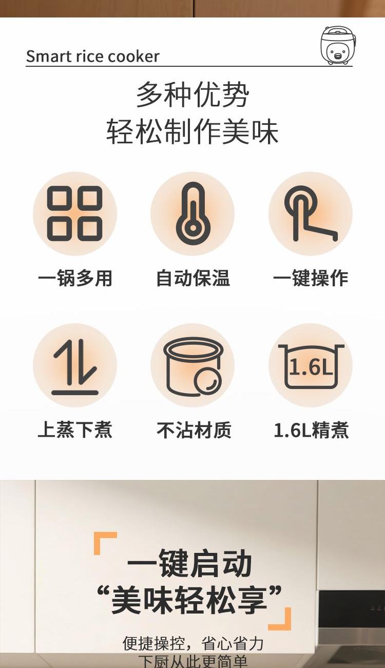 产品参数 额定电压:220V~ 额定频率:50Hz 额定功率:300W 额定容量:1.6L 产品净重:1.5kg 产品毛重:1.8kg 彩盒尺寸:250X250X257mm 外箱尺寸:520X520X533mm 产品特点 1、萌猪可爱造型,精致工艺; 2 、传统一机械式一键开关操作,老人小孩轻松用; 3 、优质不粘涂层内胆,煮饭更健康,持久不粘更耐磨; 4 、全塑结构外壳设计,强度高,使用更长久。
