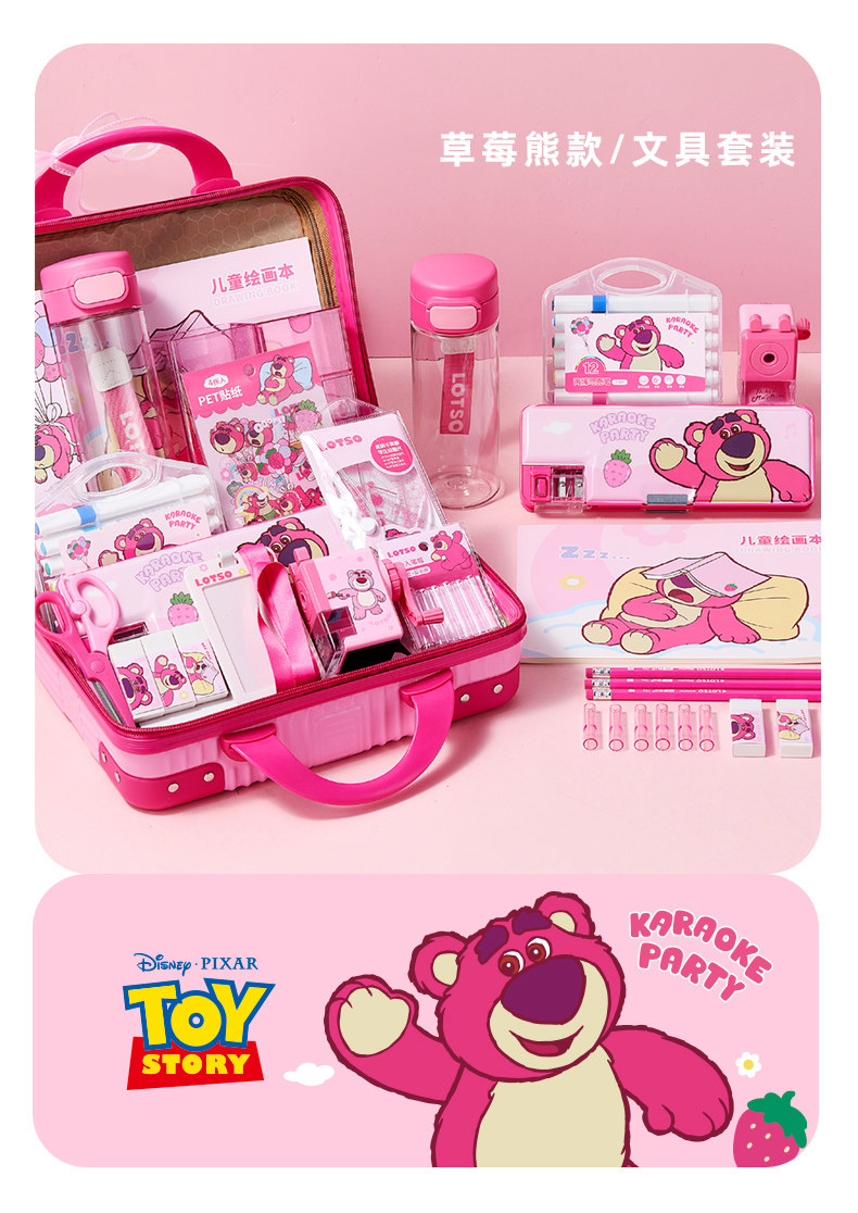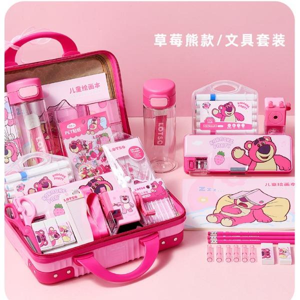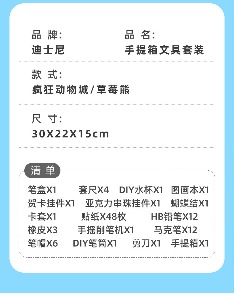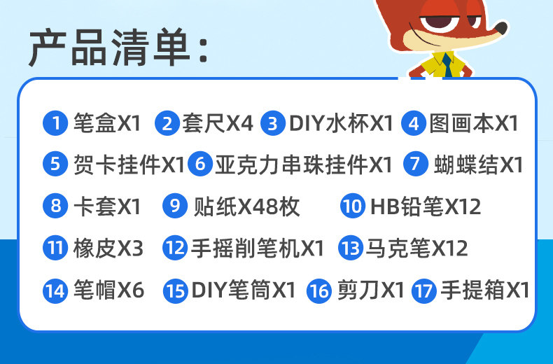 尺寸:30*22*15CM 材质:纸、塑料 配置:笔盒*1、套尺*4、DIY水杯*1、图画本*1、贺卡挂件*1、亚克力串珠挂件*1、蝴蝶结X1、卡套*1、贴纸*48枚、HB铅笔*12、橡皮*3、手摇削笔机*1、马克笔*12、笔帽*6、DIY笔筒*1、剪刀*1、手提箱*1 卖点: ①一站式配齐,满足多种学习需求 ②手摇削笔机,适合多种笔型不易断铅 ③丙烯马克笔色彩明亮丝滑不断色,绘出心中奇思妙想 ④530ML透明水杯市a,杯子任意DIY 携带方便,顺出水,不呛口,不外溢 ⑤高透简约DIY笔筒,大容量分格拿取方便、便于收纳整理,告别乱糟糟 ⑥适合学生日常使用,也很适合作为生日、节日的礼物