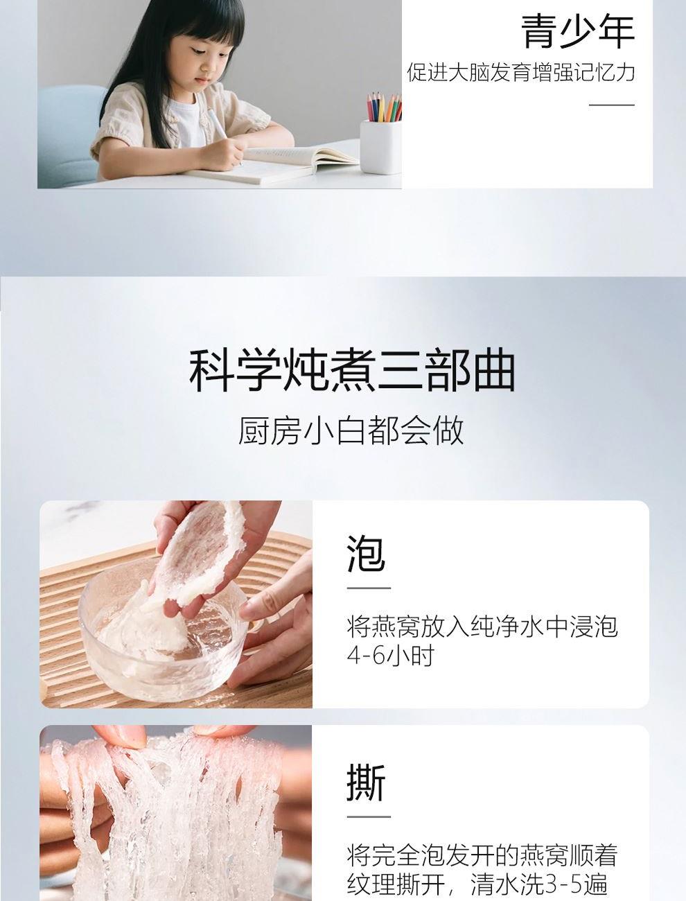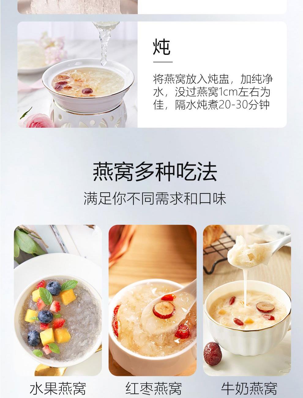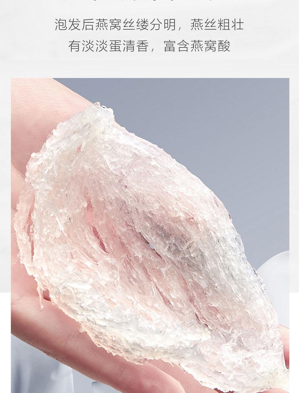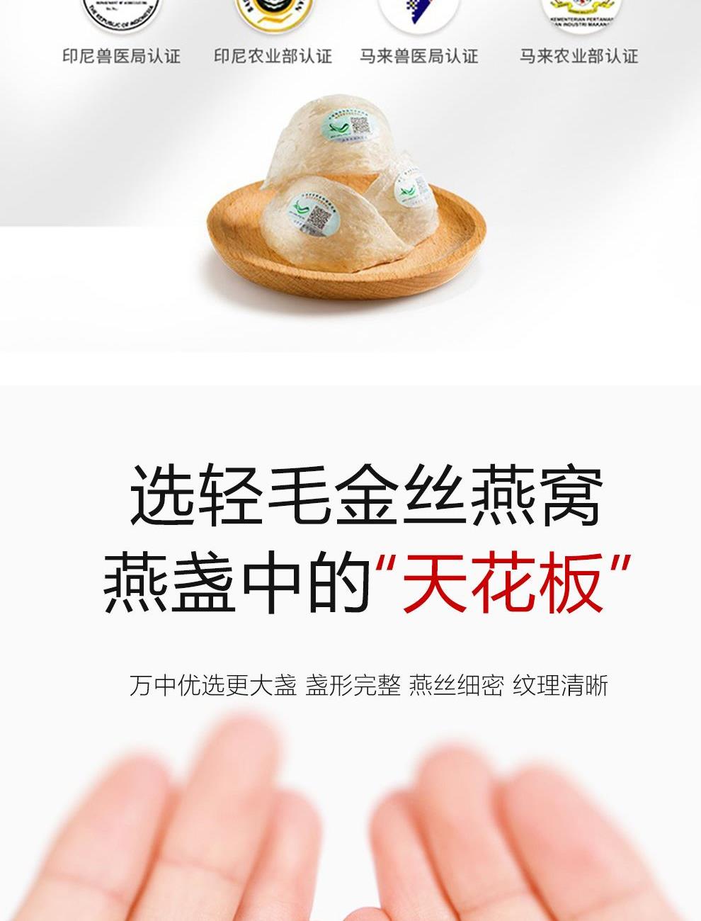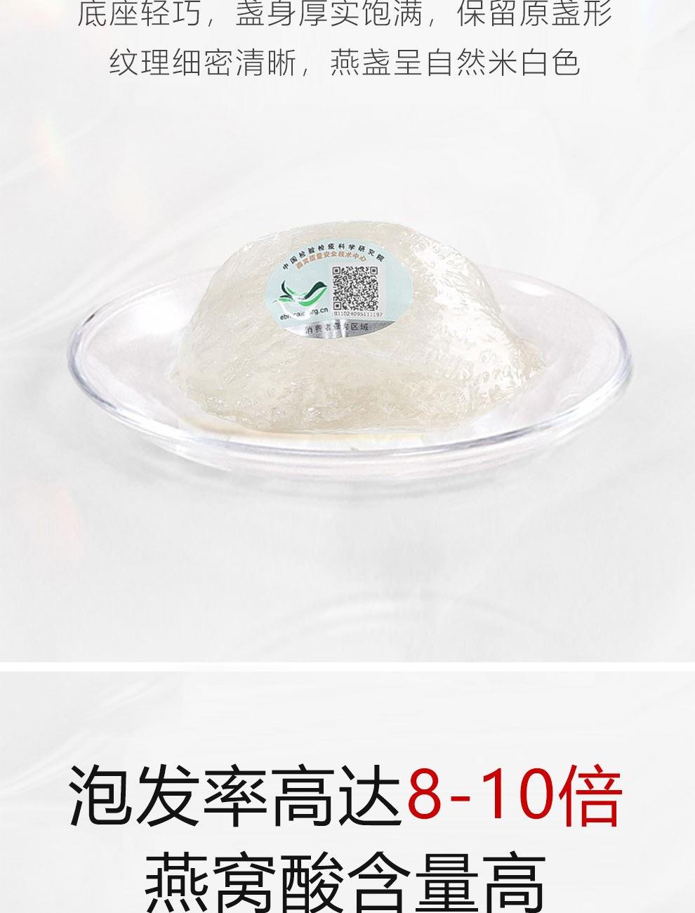 规格:溯源小盏10克(2-3盏) 卖点: 1、一盏一码,溯源可查,品质有保障。 2、不刷胶,不补碎,泡发率高达8-10倍。 3、99.9%洁净度,足干足称,不为一滴水分买单。 4、节省时间、免泡发燕盏省去了泡发的时间,可以开始炖煮。 5、免泡发燕盏的加工过程更加标准化,品质更加稳定。
