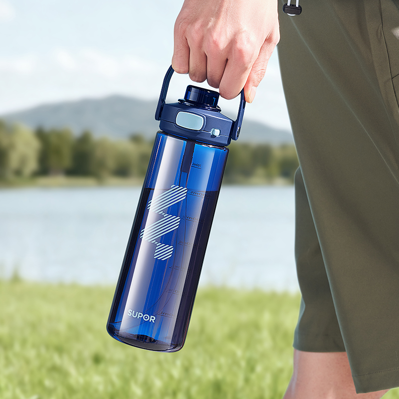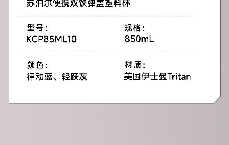 容量:850ml 579*526*276mm 11.7KGS 材质:Tritan 卖点: 1.一键弹开+快拆吸管 2.喝水不仰头 吸管直饮双模式随心切换 3.Tritan材质 不含BPA 耐热-20~100℃ 4.850mL大容量:满足日常运动需求