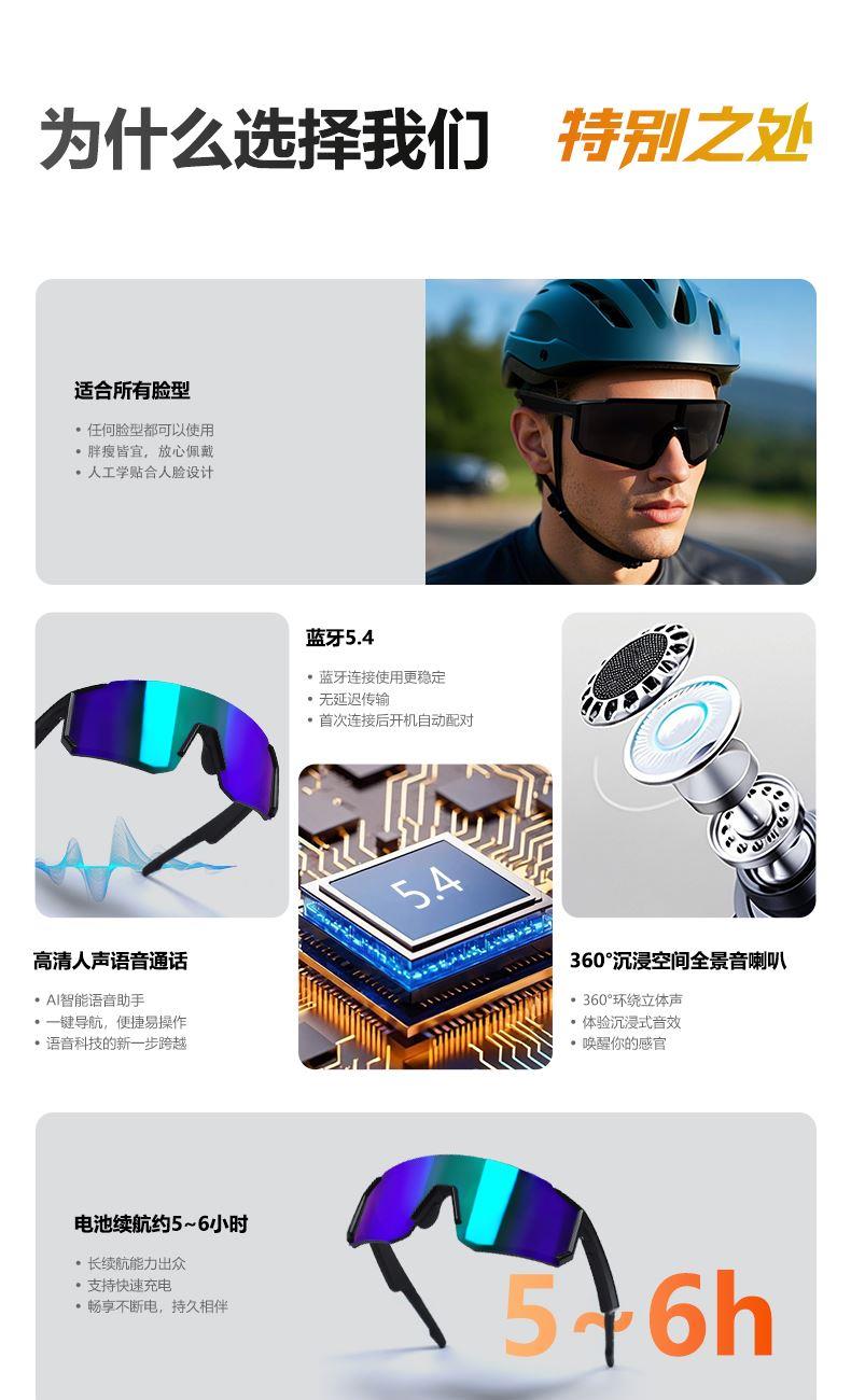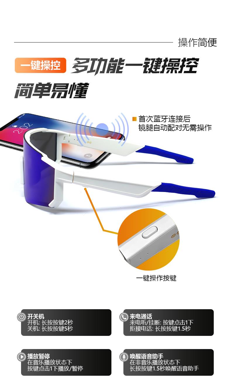 产品功能:双镜腿配对、磁吸式充电、开机/关机、暂停/播放、音乐播放、语音助手、上一曲/下一曲、遥控拍照、音量加/音量减、接听/挂断电话、拒接电话;使用场景:骑行/登山/钓鱼/滑雪/户外运动;支持语言:简体中文;英文;日本语;意大利;法语;西班牙语;德语;葡萄牙语;克罗地亚;波兰;荷兰;瑞典;希腊;丹麦;匈牙利;韩语;