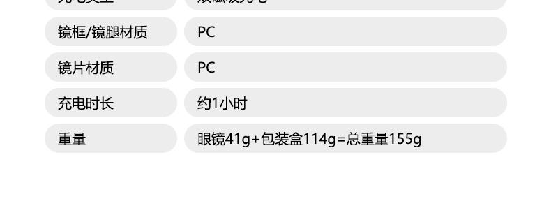 产品清单:眼镜+充电线+说明书+眼镜布+收纳袋+包装盒+手提袋