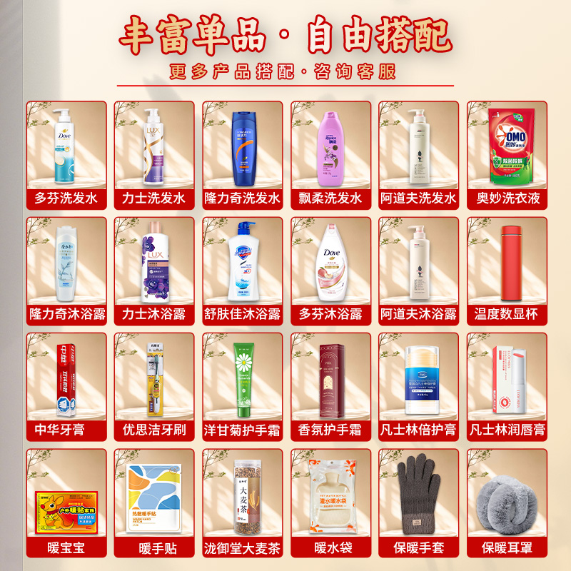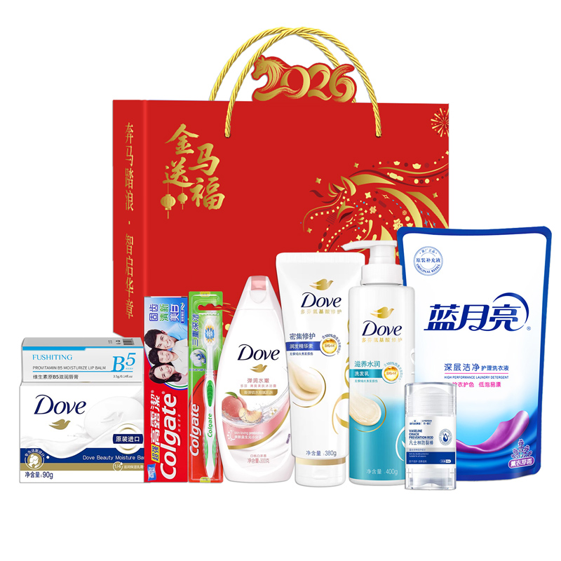礼盒尺寸:32*8.5*24.5cm 包装尺寸:66* 46.5*51 CM 产品配置:(香型随机) 多芬洗发水400ml 多芬沐浴露300ml 多芬护发素380ml 多芬香皂90g 高露洁牙膏90g 高露洁牙刷 蓝月亮洗衣液500g 海氏海诺凡士林防裂棒40ml 维生素原B5滋润唇膏3.5g 精美礼盒