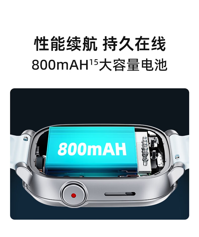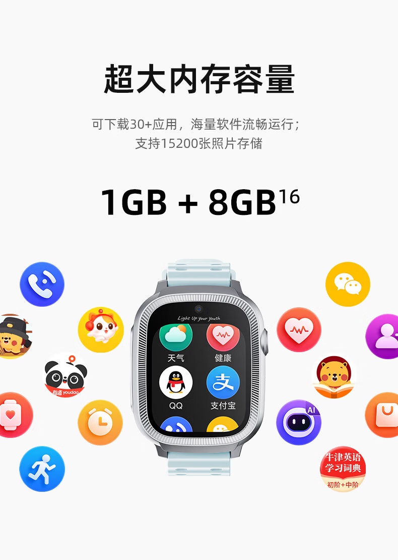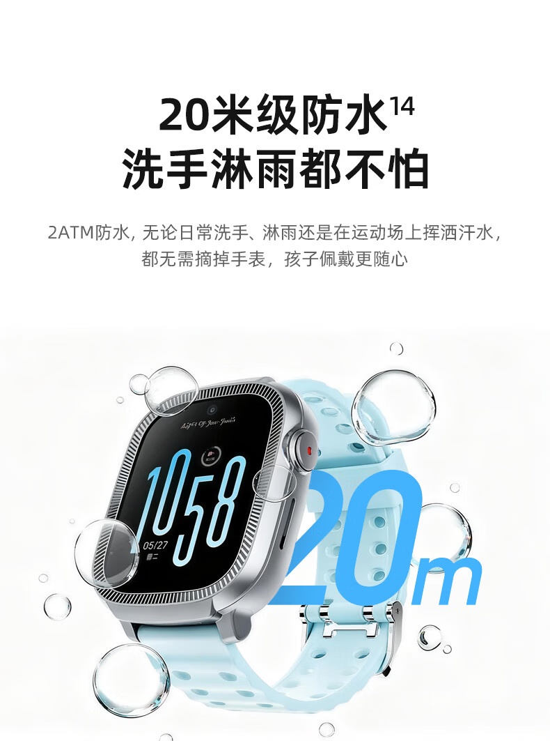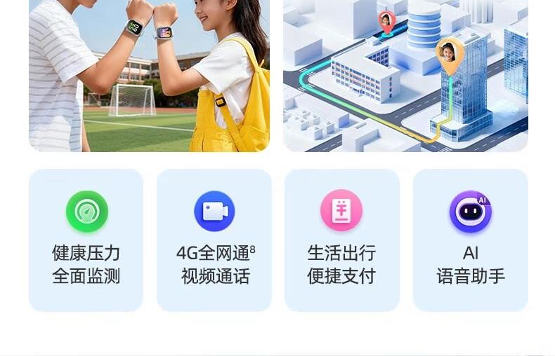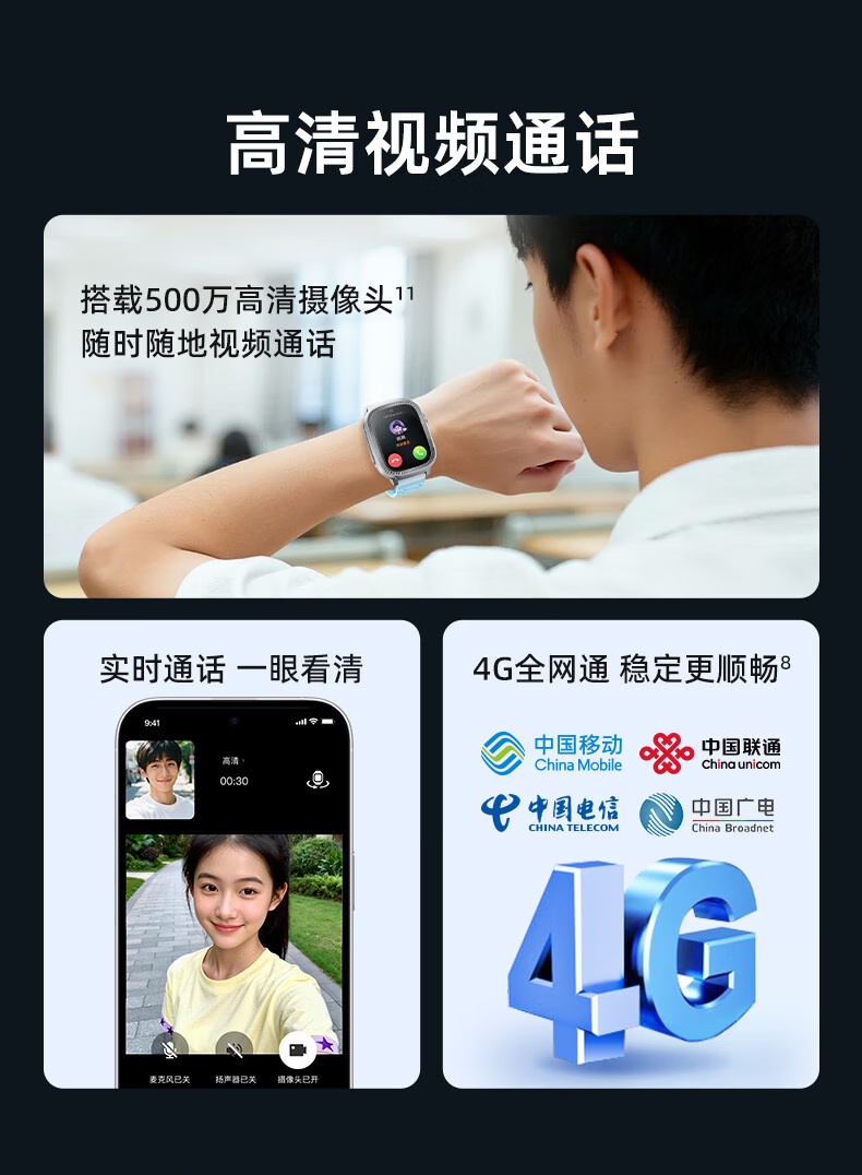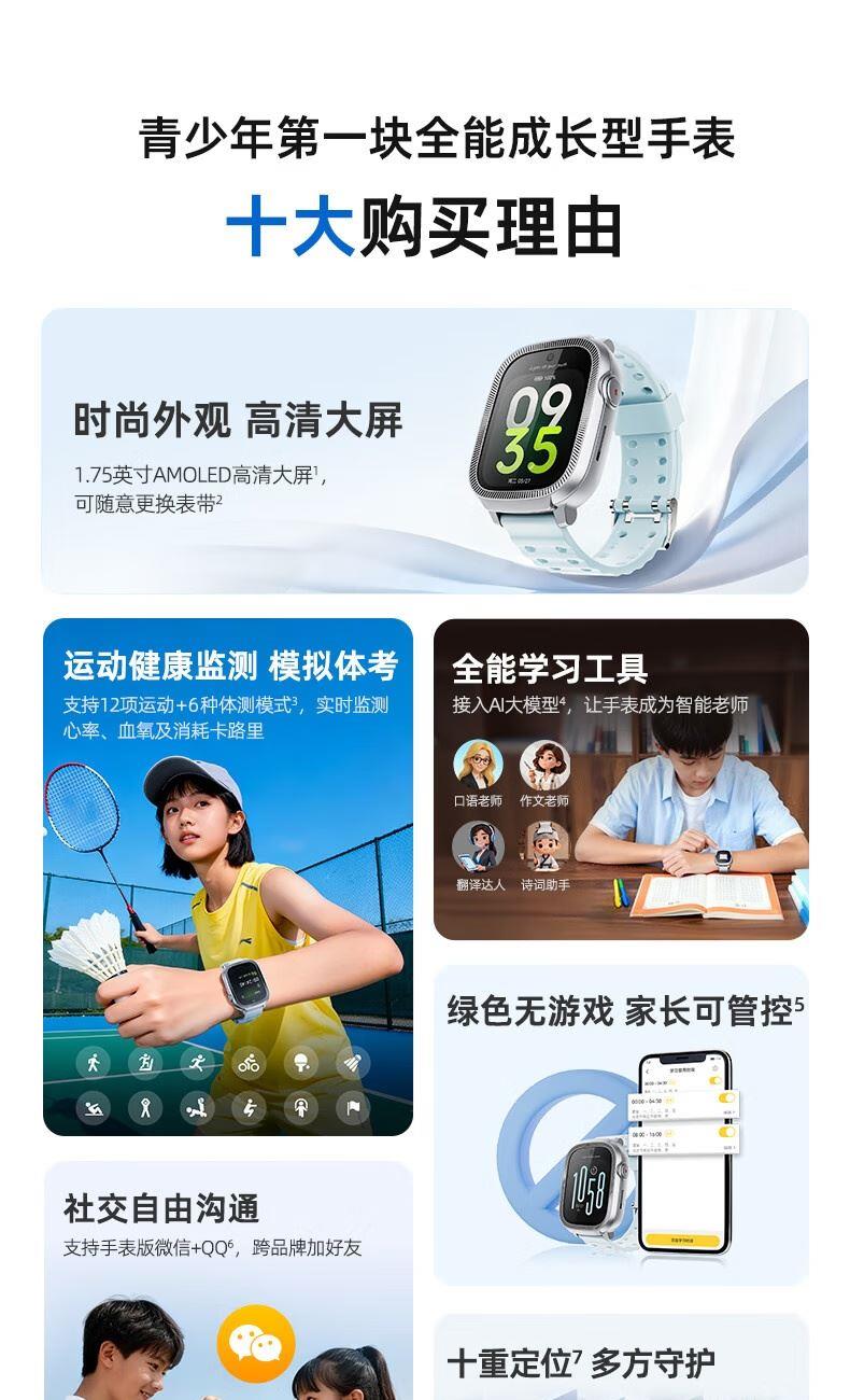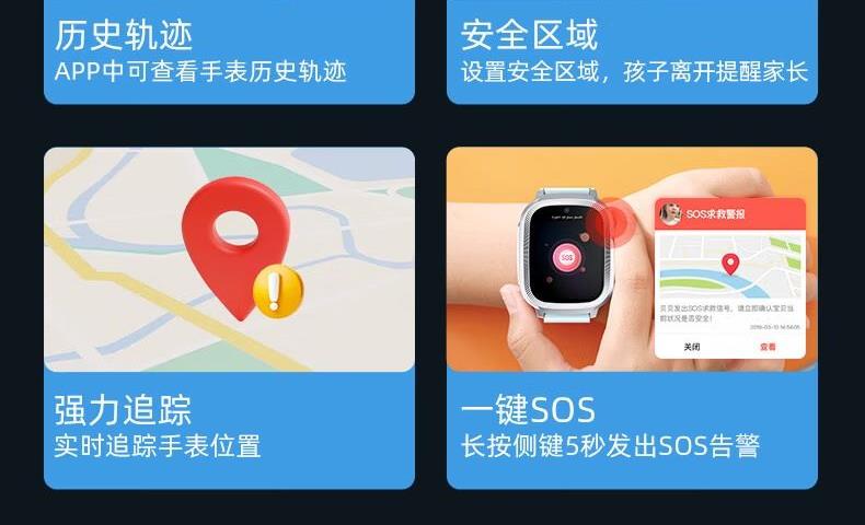 产品参数: 1、1.75英寸屏幕、500万前置像素,8G内存、4G全网通,IP68米级防水、800mAh大容量电池 产品功能: 1、创新突破AI技能,懂思考,会辅导,12种运动模式。 2、10重高精定位,孩子位置知晓 3、3D立体定位,楼层位置清晰可见 4、360专属隐私安全系统,健康体征全面检测。 5、IP68米级防水,洗手淋雨都不怕 6、支持三大运营商4G网络,通讯稳定更顺畅