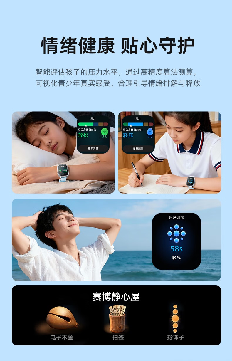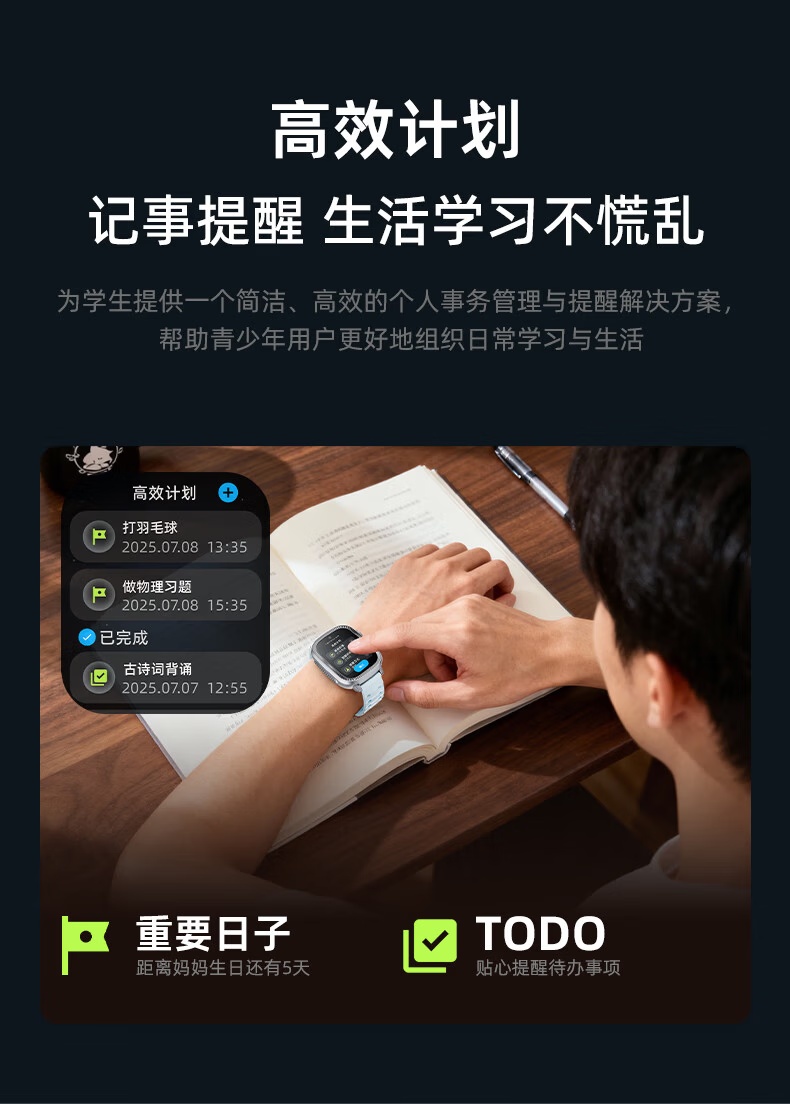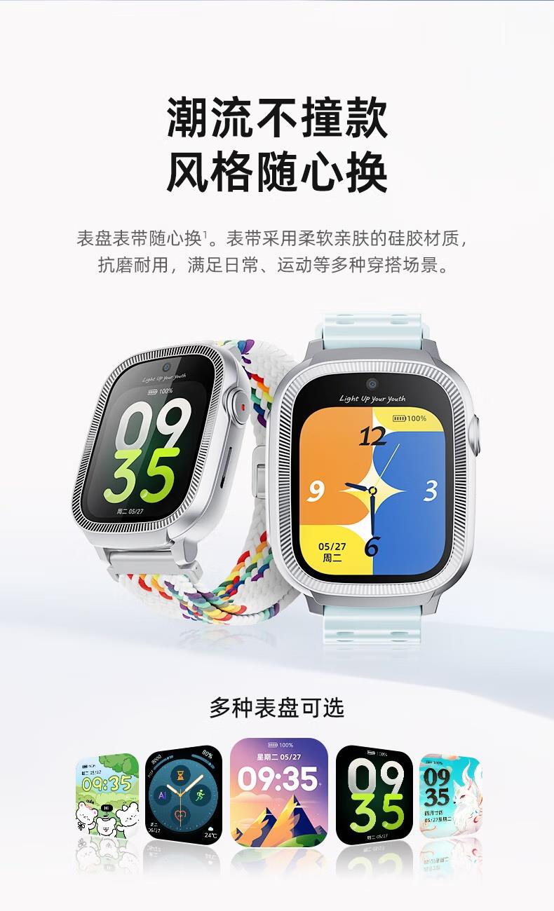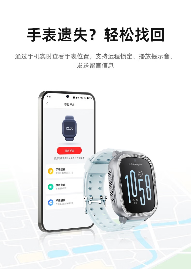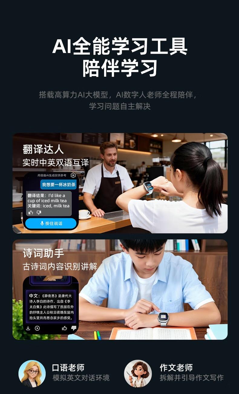 产品参数: 1、1.75英寸屏幕、500万前置像素,8G内存、4G全网通,IP68米级防水、800mAh大容量电池 产品功能: 1、创新突破AI技能,懂思考,会辅导,12种运动模式。 2、10重高精定位,孩子位置知晓 3、3D立体定位,楼层位置清晰可见 4、360专属隐私安全系统,健康体征全面检测。 5、IP68米级防水,洗手淋雨都不怕 6、支持三大运营商4G网络,通讯稳定更顺畅