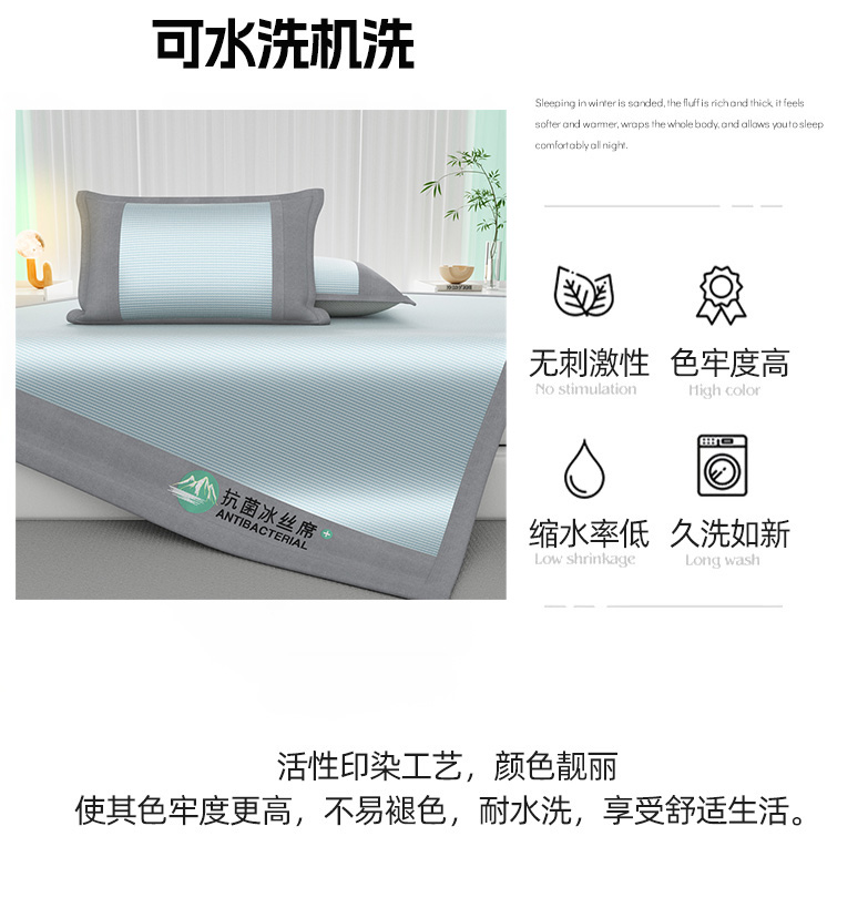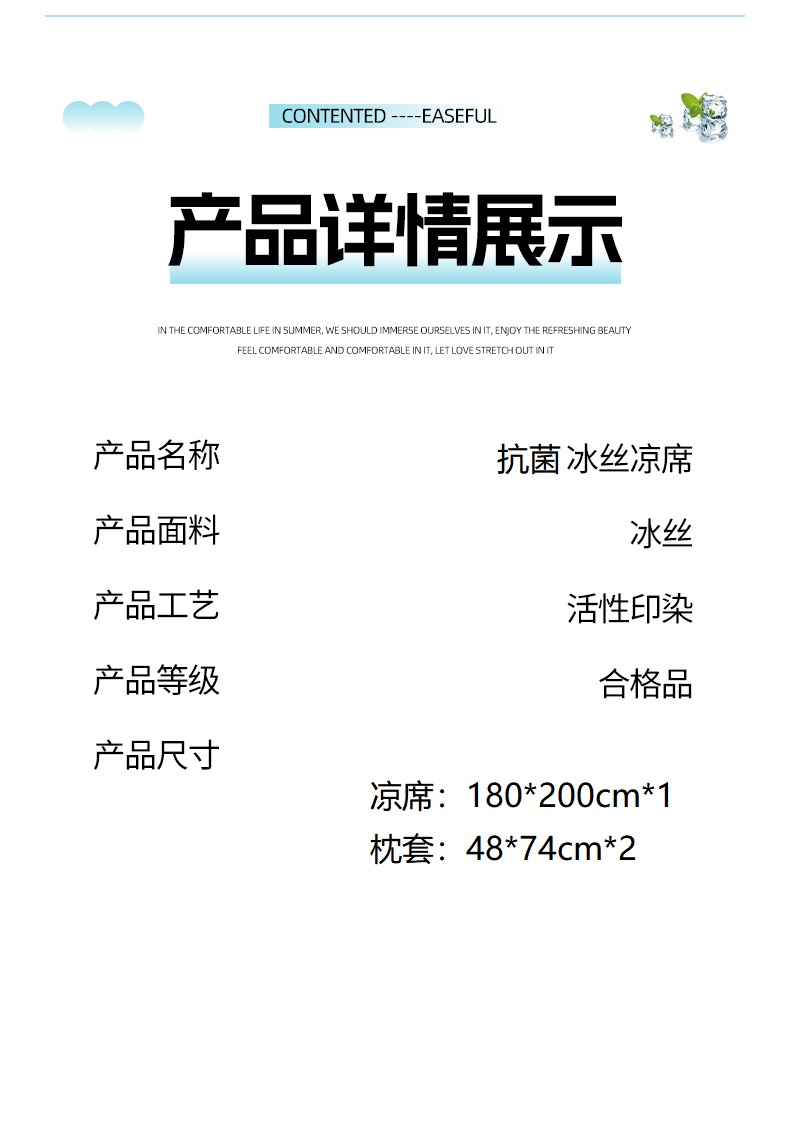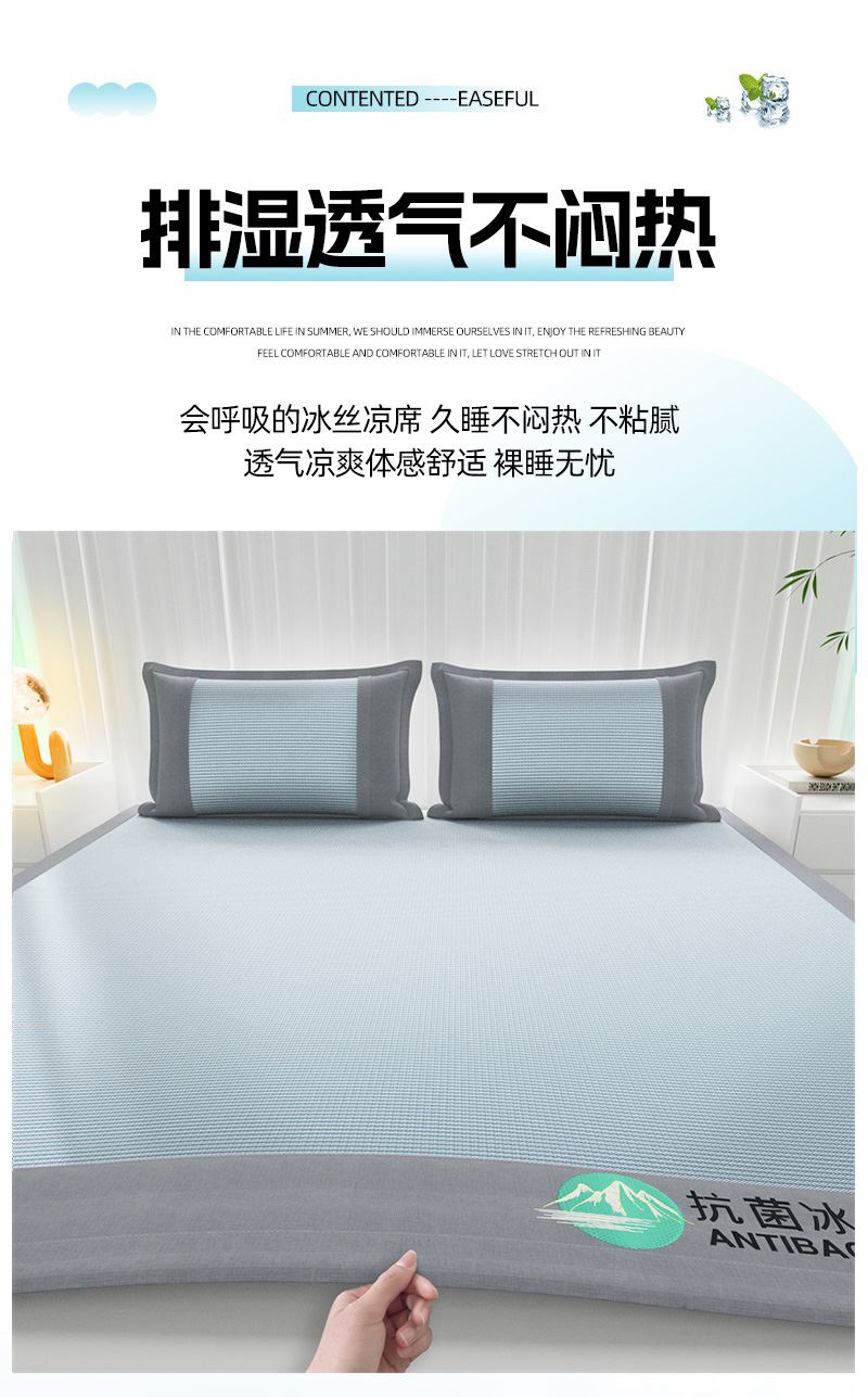 规格:180*200cm*1 枕套:48*74cm*2 面料:冰丝 复合料:华夫格 产品特点: 1.冰丝是一种植物纤维面料光滑清凉,不沾皮肤,吸湿散热快。 2.高密度冰丝面料,触感光滑细腻告别夹发烦恼。 3.提花工艺,色牢度高不易褪色。