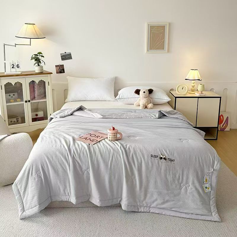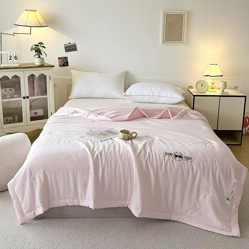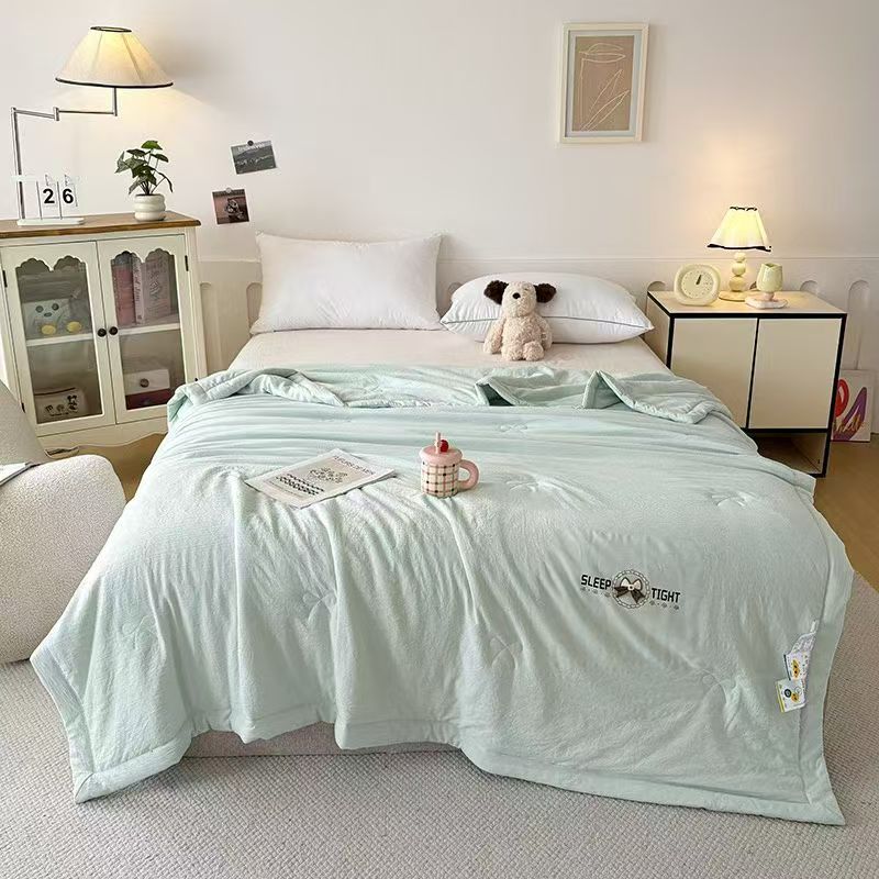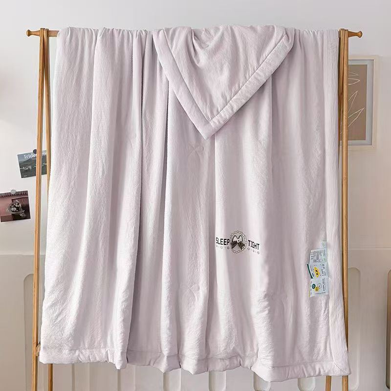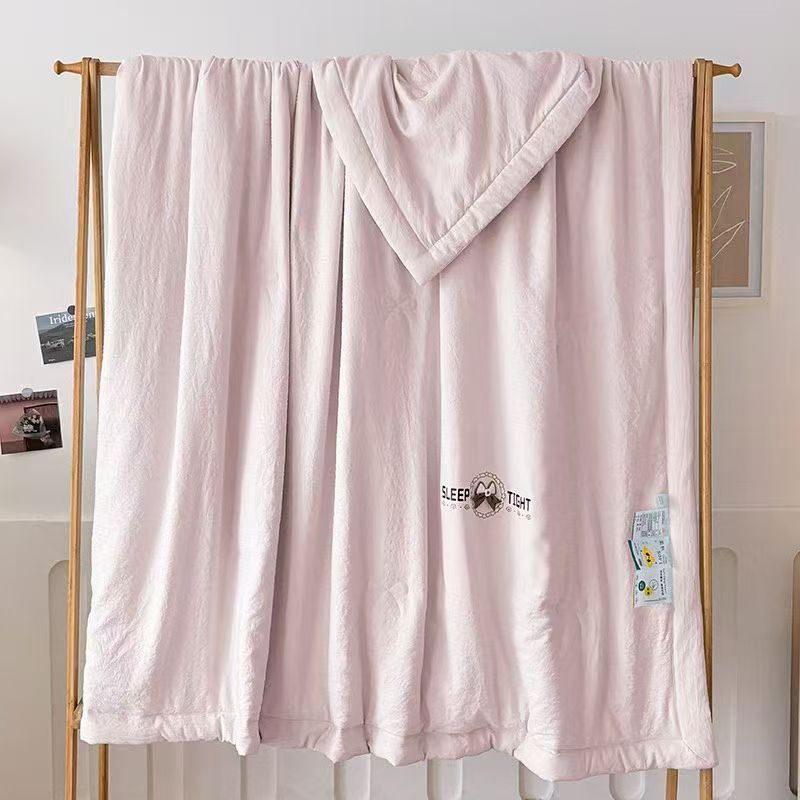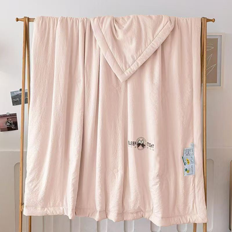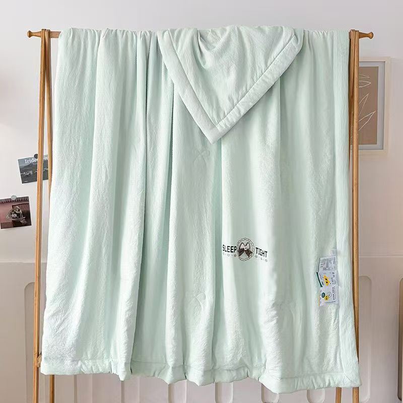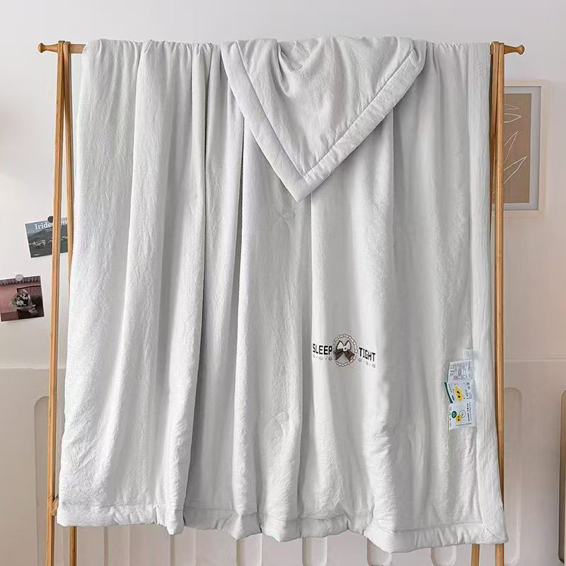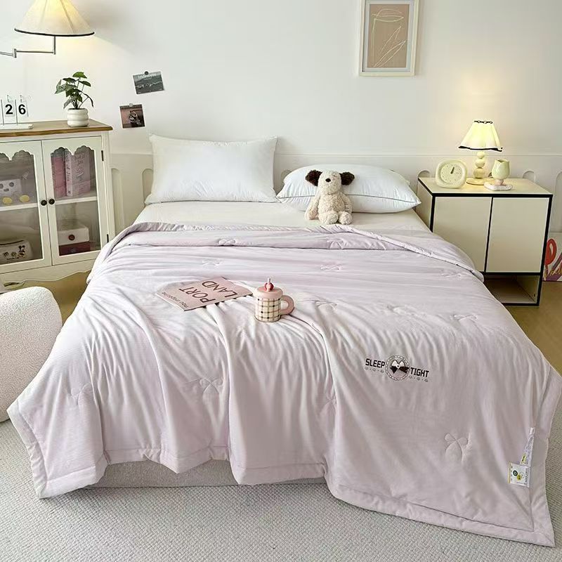 1:高克重提花面料,手感厚实柔软透气有质感!花型设计灵感源于:结好运心相印,平安喜乐,顺遂无忧! 2:工艺:烫画➕饰品工艺,特种定点绗缝 面料:高克重提花面料,柔软透气。 填充:双面烫光仿丝绵 尺寸:200*230cm*1 包装:彩盒