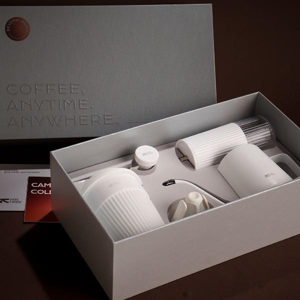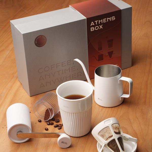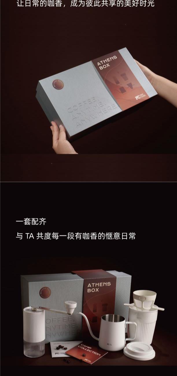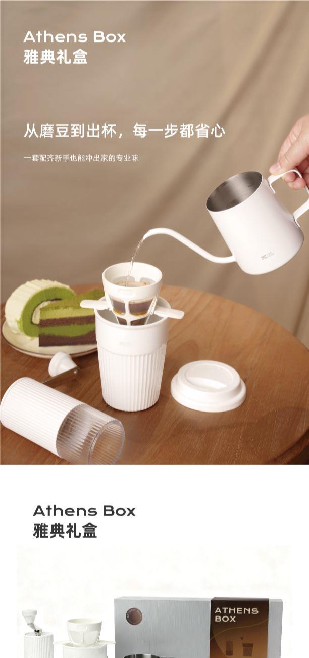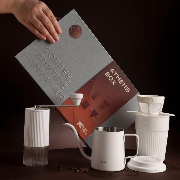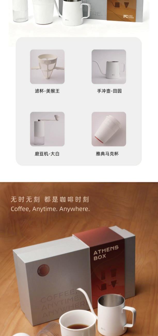 产品:VIBE-TRIBE雅典礼盒 彩盒尺寸:336*195×95mm 产品材质:304 不锈钢 、陶瓷(磨芯)、陶瓷、PP、PC 包含产品:雅典马克杯+磨豆机-大白+手冲壶-田园+滤杯-美猴王 核心卖点: 1.含超白玲珑瓷陶瓷杯安全耐热易清洁,耐高温无异味、0吸水性,不倒设计,有效避免倾倒; 2.采用简约便携磨豆机,细腻可循环使用滤网,90度稳定出水手冲壶; 3.一套满足手冲需求,赠送透明手提袋体面又实用,是商务往来、客户答谢的质感之选;