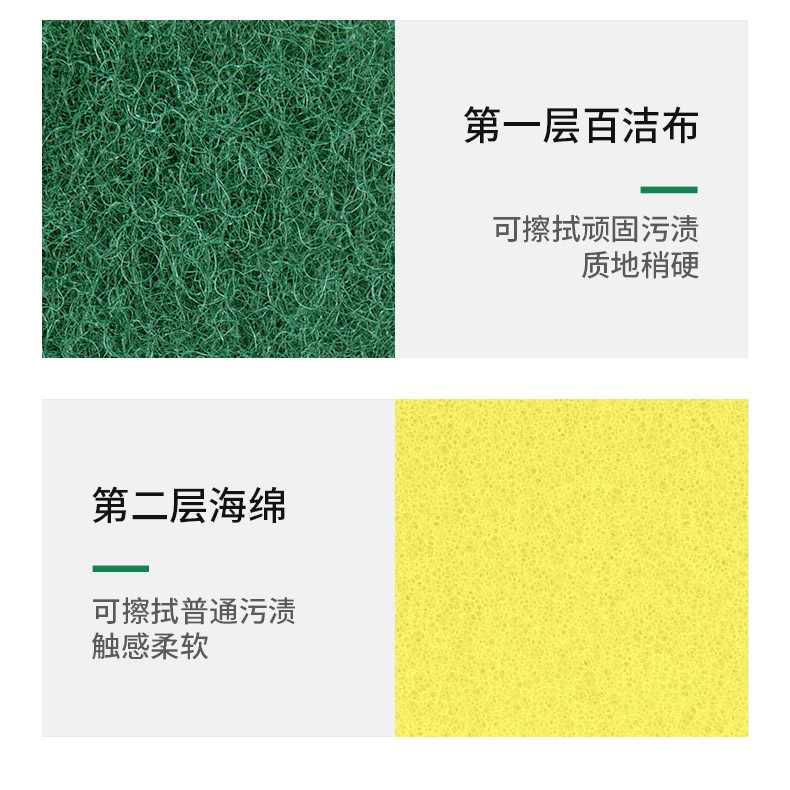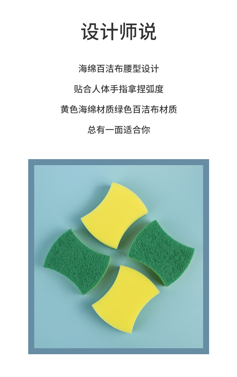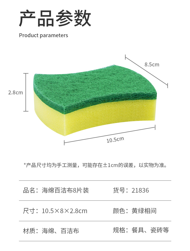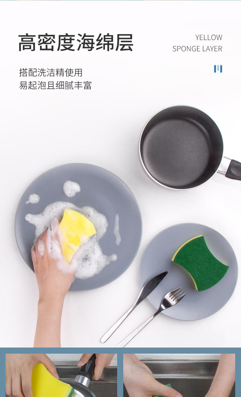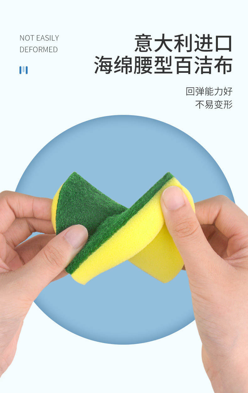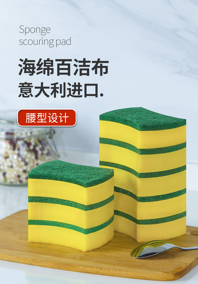 尺寸:10.5cm*8.5cm*2.8cm 材质:聚酯纤维、尼龙、聚氨酯、金刚砂 意大利进口百洁布 百洁布加海绵层满足日常生活中的不同需求 内含除污粒子除污力强 内含金刚砂 轻松去除顽固污渍 腰型设计一手轻松掌握 中间凹陷设计 符合人体手指拿捏弧度 水冲即净 油污分离 油污遇水自然分离清洁方便油污一冲即净 回弹能力好 不易变形 适用于各种厨房用品