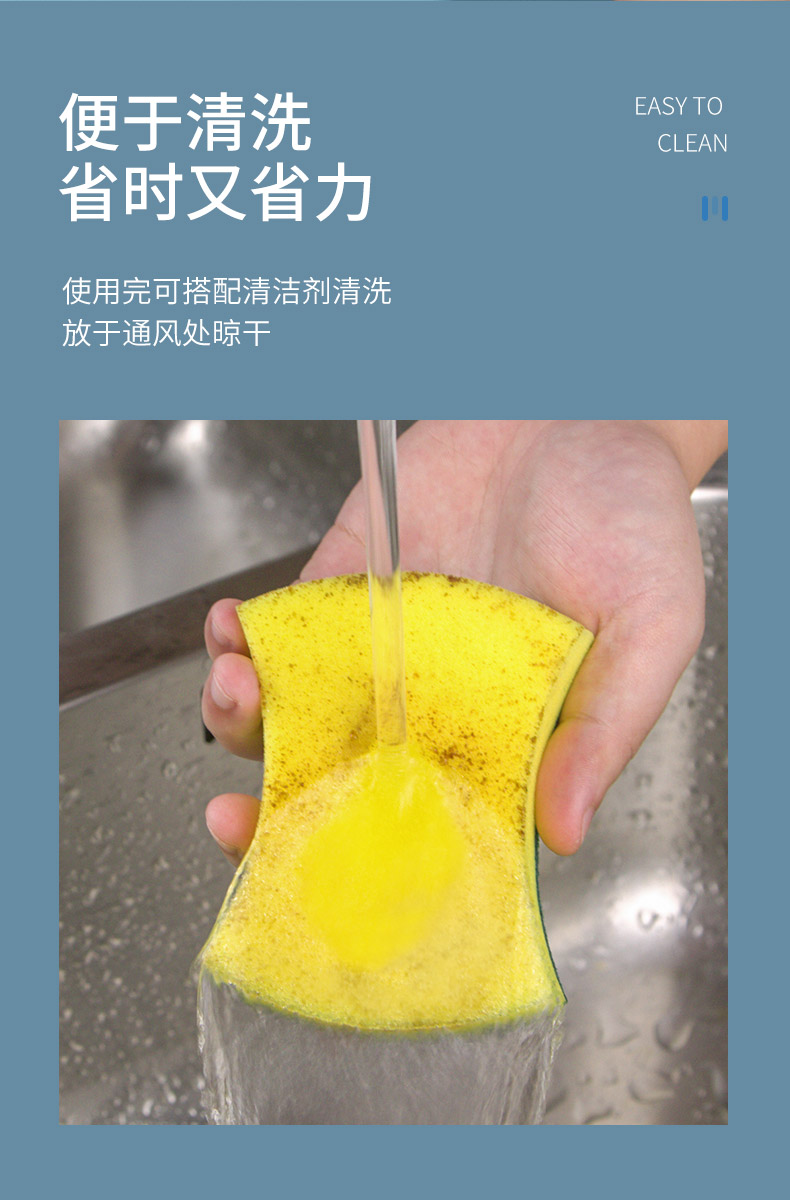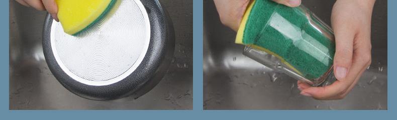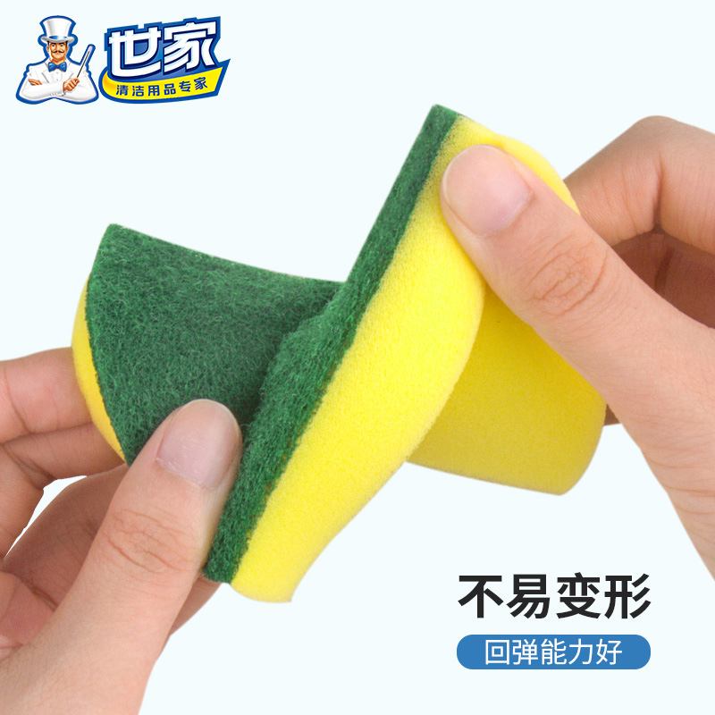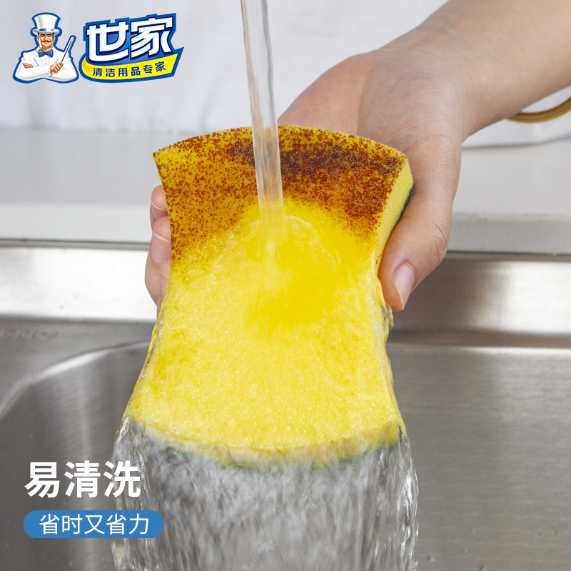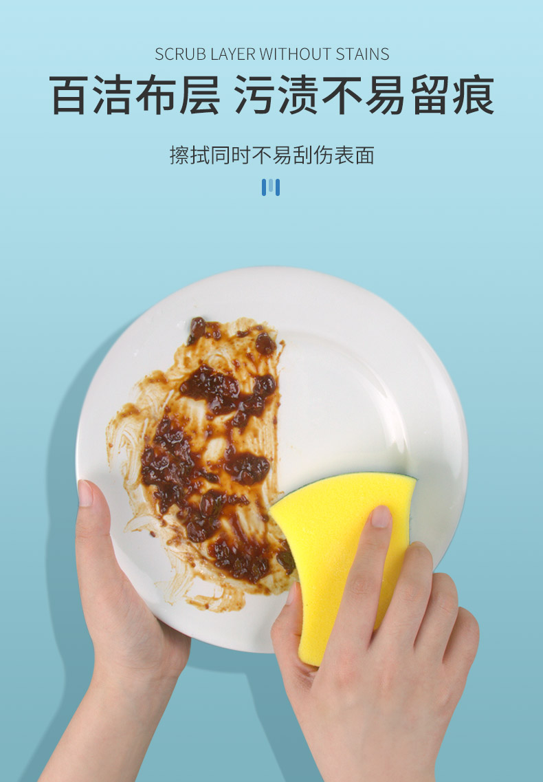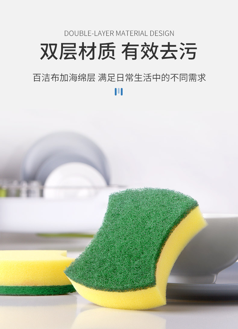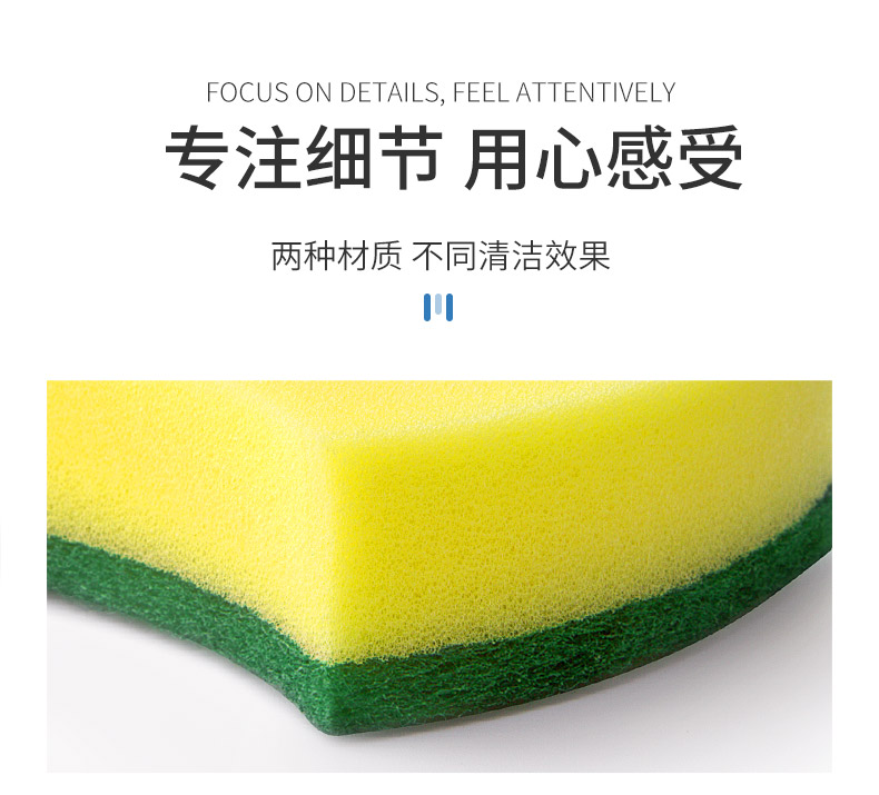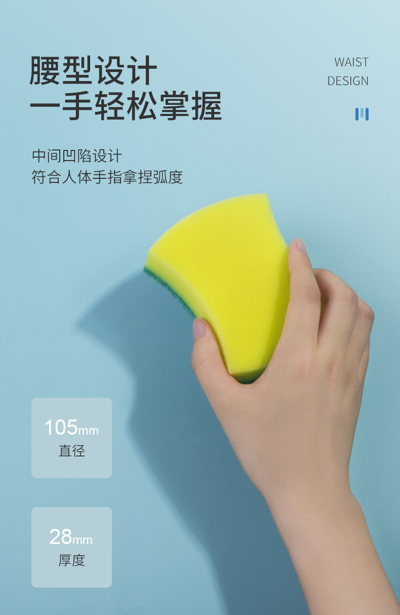 尺寸:10.5cm*8.5cm*2.8cm 材质:聚酯纤维、尼龙、聚氨酯、金刚砂 意大利进口百洁布 百洁布加海绵层满足日常生活中的不同需求 内含除污粒子除污力强 内含金刚砂 轻松去除顽固污渍 腰型设计一手轻松掌握 中间凹陷设计 符合人体手指拿捏弧度 水冲即净 油污分离 油污遇水自然分离清洁方便油污一冲即净 回弹能力好 不易变形 适用于各种厨房用品