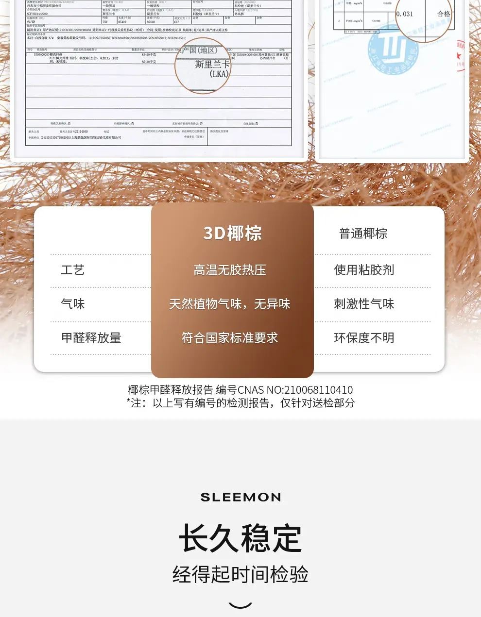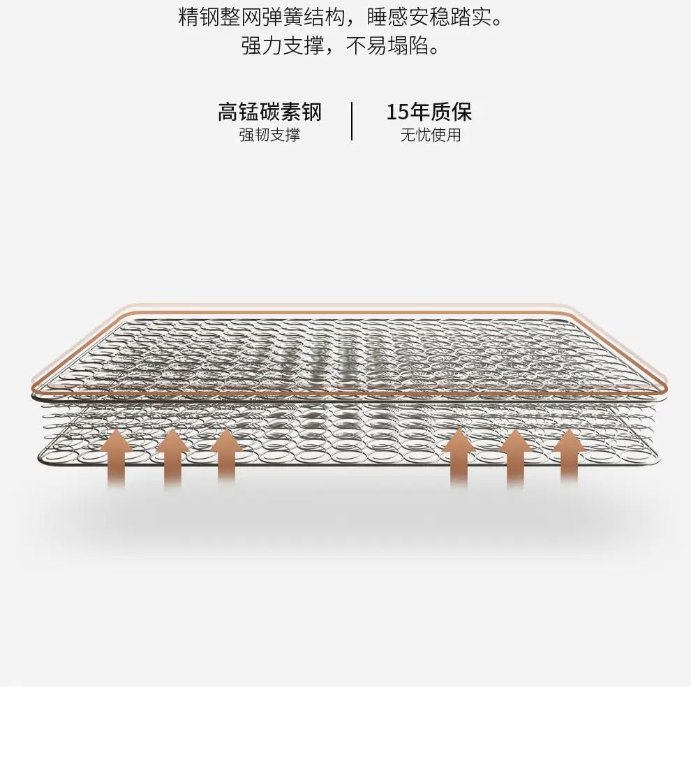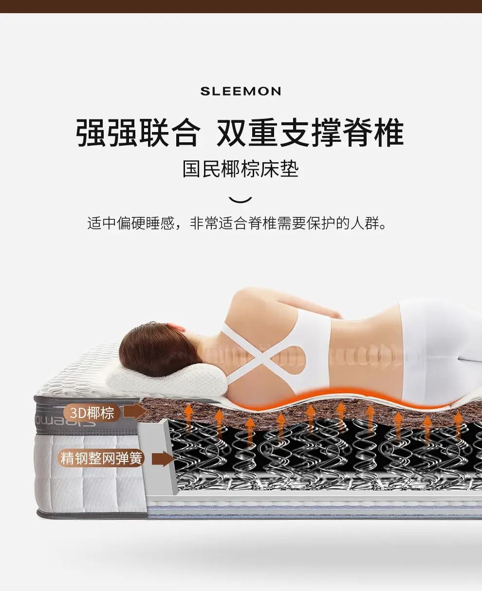 1、强效护脊:软硬适中偏硬,零胶3D椰棕护脊层强力支撑脊椎,减少腰酸背痛,适配老人、儿童、发育期人群及偏爱硬床垫者;弹簧腰部加密设计额外承托腰部,分散身体压力。 2、经久耐用:采用高锰碳素钢整网弹簧,经高温定型、百万次耐久性及滚压测试,经久耐用不易塌陷,可应对儿童蹦跳等使用场景。 3、舒适透气:圆泡海绵搭配纳米竹炭海绵,弹性佳、贴合身体且透气排湿。 4、呵护健康:表层为特级针织面料,细菌抑制率 99.9%,并强效防止螨虫繁殖,打造洁净睡眠环境。 面料:亲肤针织面料 核心材质:零胶3D椰棕、纳米竹炭海绵 弹簧:高锰碳素钢整网弹簧 包装方式:双倍加厚牛皮纸盒 规格尺寸:150*200*22cm