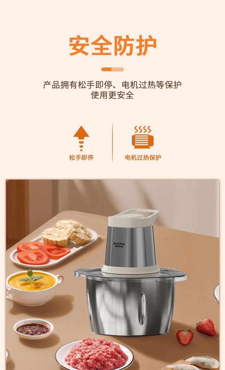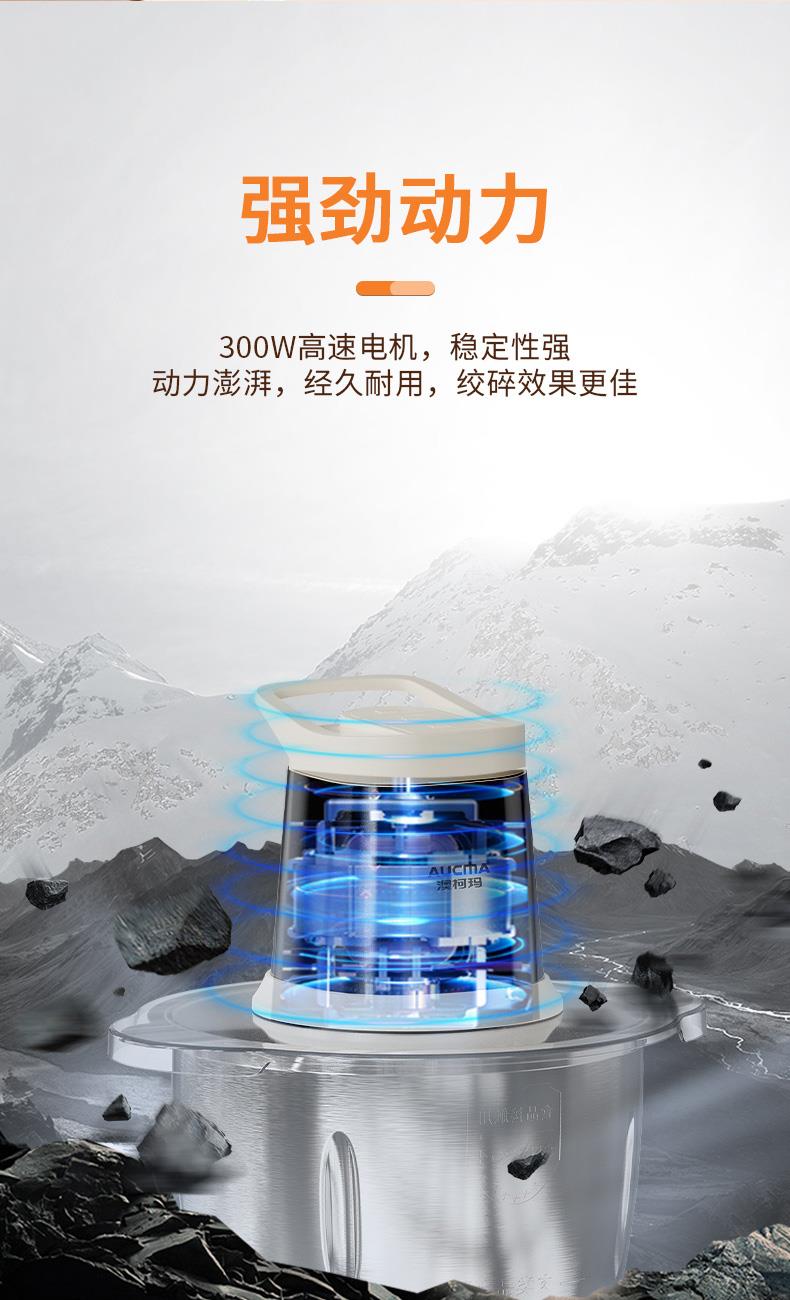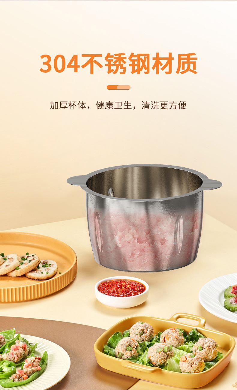 额定功率:300W 刀片:420食品级不锈钢4叶刀片(单刀) 额定容量:3L 净重:1.2kg 毛重:1.48kg 产品尺寸:240x192x285mm 外箱尺寸:340x210x170mm 3L大容量不锈钢杯,一次绞肉全家享 绞肉、剁陷、切碎、搅拌操作简单,随意切换 不锈钢无缝机头,无缝一体成型工艺,防锈,耐磨更美观 产品拥有松手即停、电机过热等保护,使用更安全。