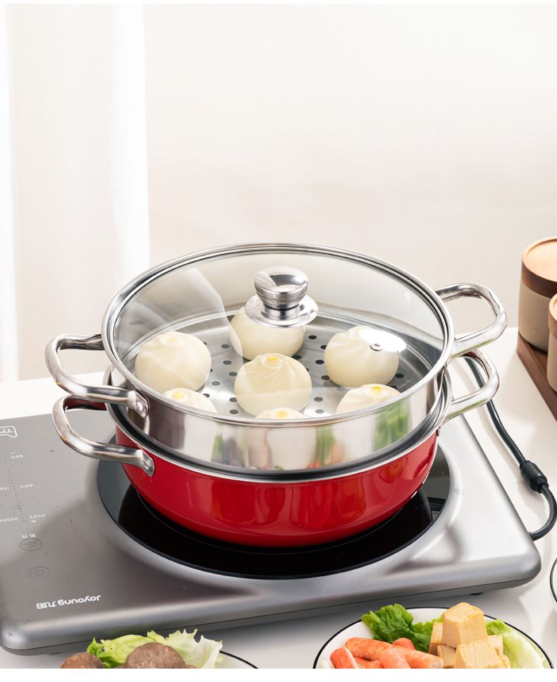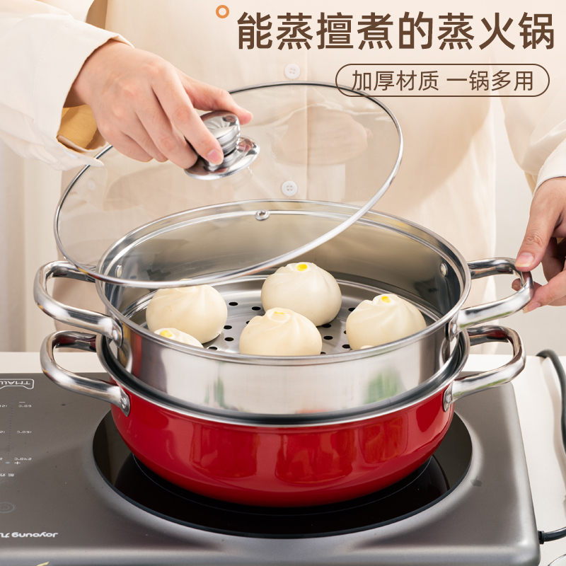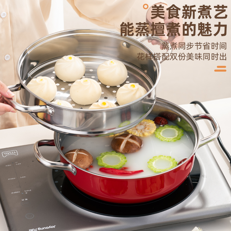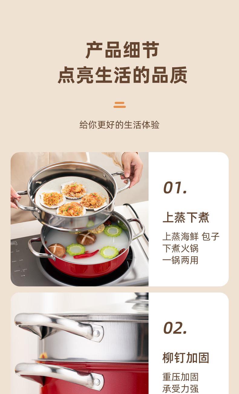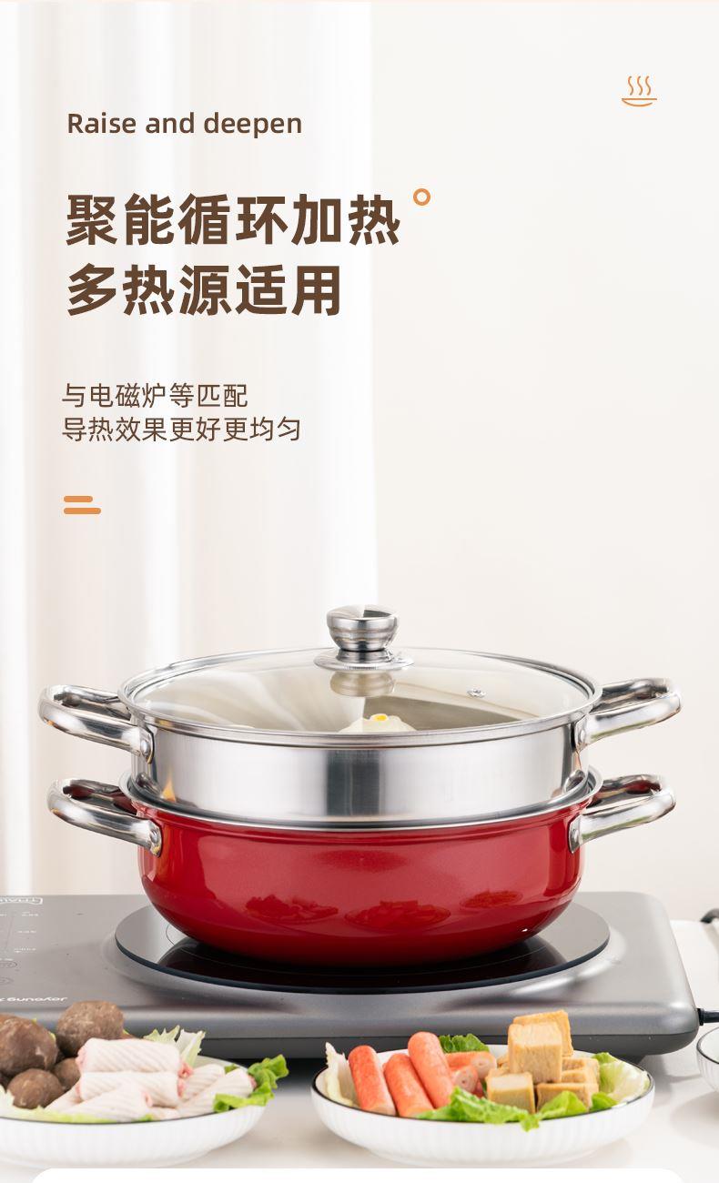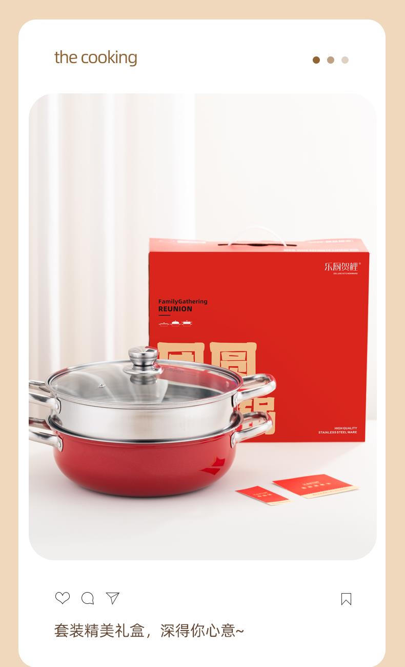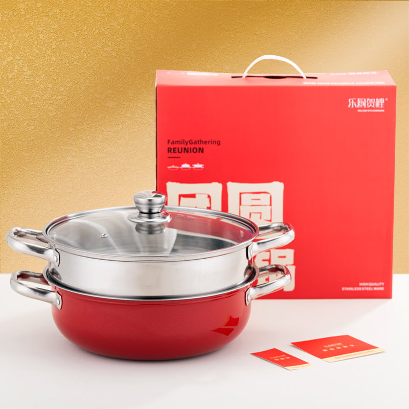 产品规格:28cm 产品材质:410不锈钢 包装方式:opp透明袋+手提彩盒 彩盒尺寸:32.5*11*29CM 外箱尺寸: 65.5*48.5*68 cm 创造高业绩,送礼心坎里,好产品,助您开门红事半功倍。 采用国际标准不锈钢板材,食品接触用钢材,搭配蒸格使用, 冬季火锅边煮边蒸,一锅两菜更实用,加高底锅,可做清汤锅使用, 可打火锅使用,多炉灶通用。 红礼盒包装,时尚大气,是您引流拓客,宣传必备礼品。