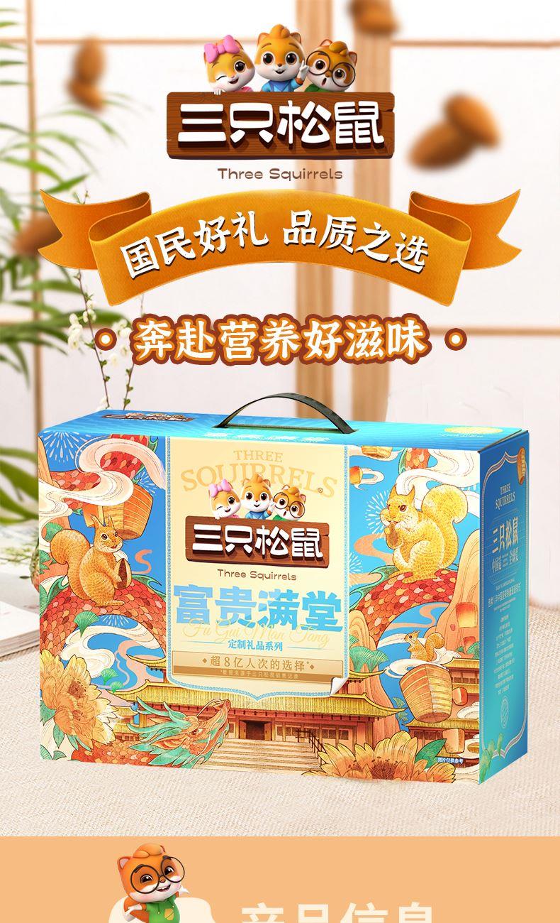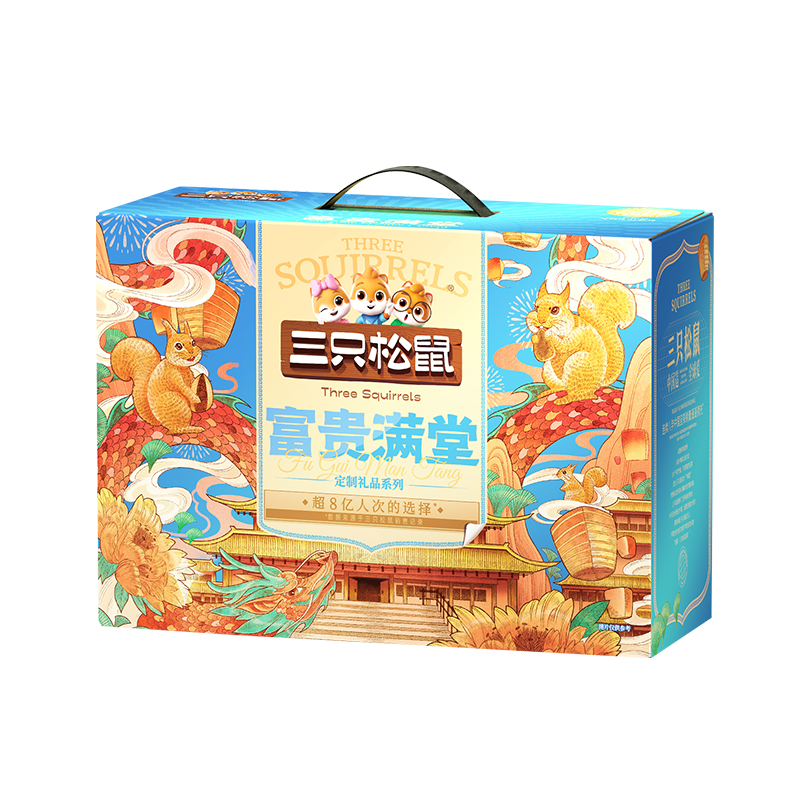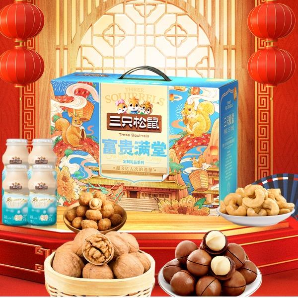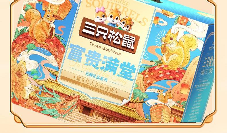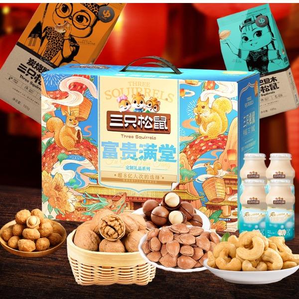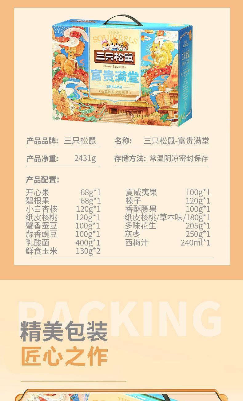三只松鼠-富贵满堂 2431g 配置: 三只松鼠-开心果68g 三只松鼠-夏威夷果100g 三只松鼠-碧根果68g 三只松鼠-榛子120g 三只松鼠-小白杏核120g 三只松鼠-香酥腰果100g 三只松鼠-纸皮核桃120g 三只松鼠-纸皮核桃/草本味/180g 三只松鼠-蟹香蚕豆100g 三只松鼠-多味花生205g 三只松鼠-蒜香豌豆100g 三只松鼠-灰枣250g 三只松鼠-乳酸菌400g 三只松鼠-西梅汁240ml 三只松鼠-鲜食玉米段130g*2